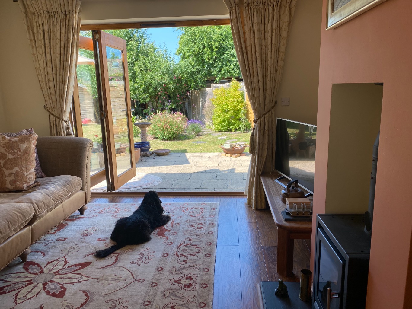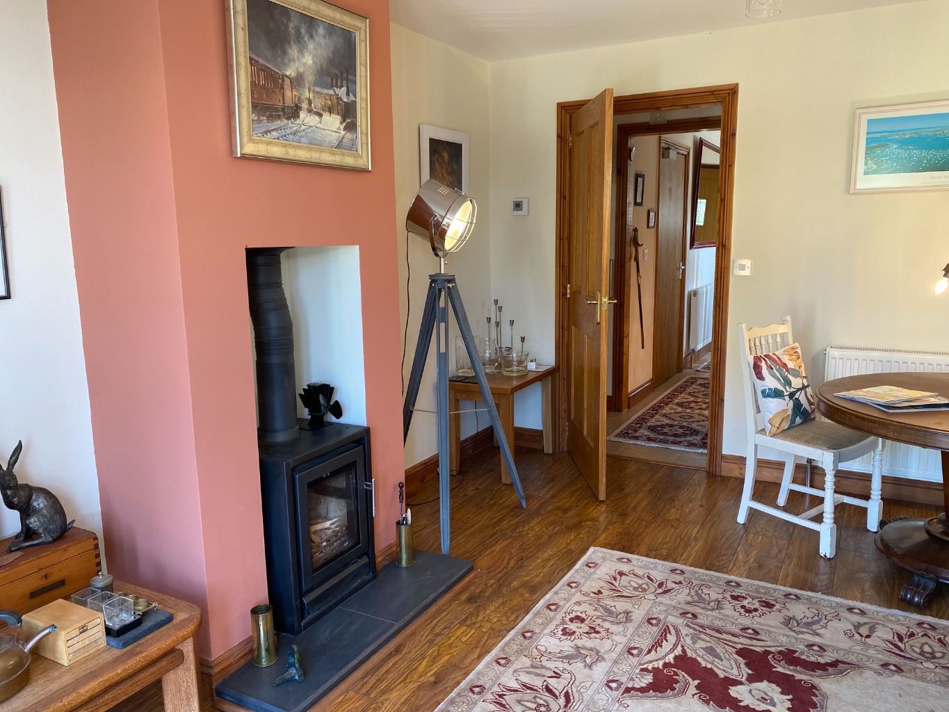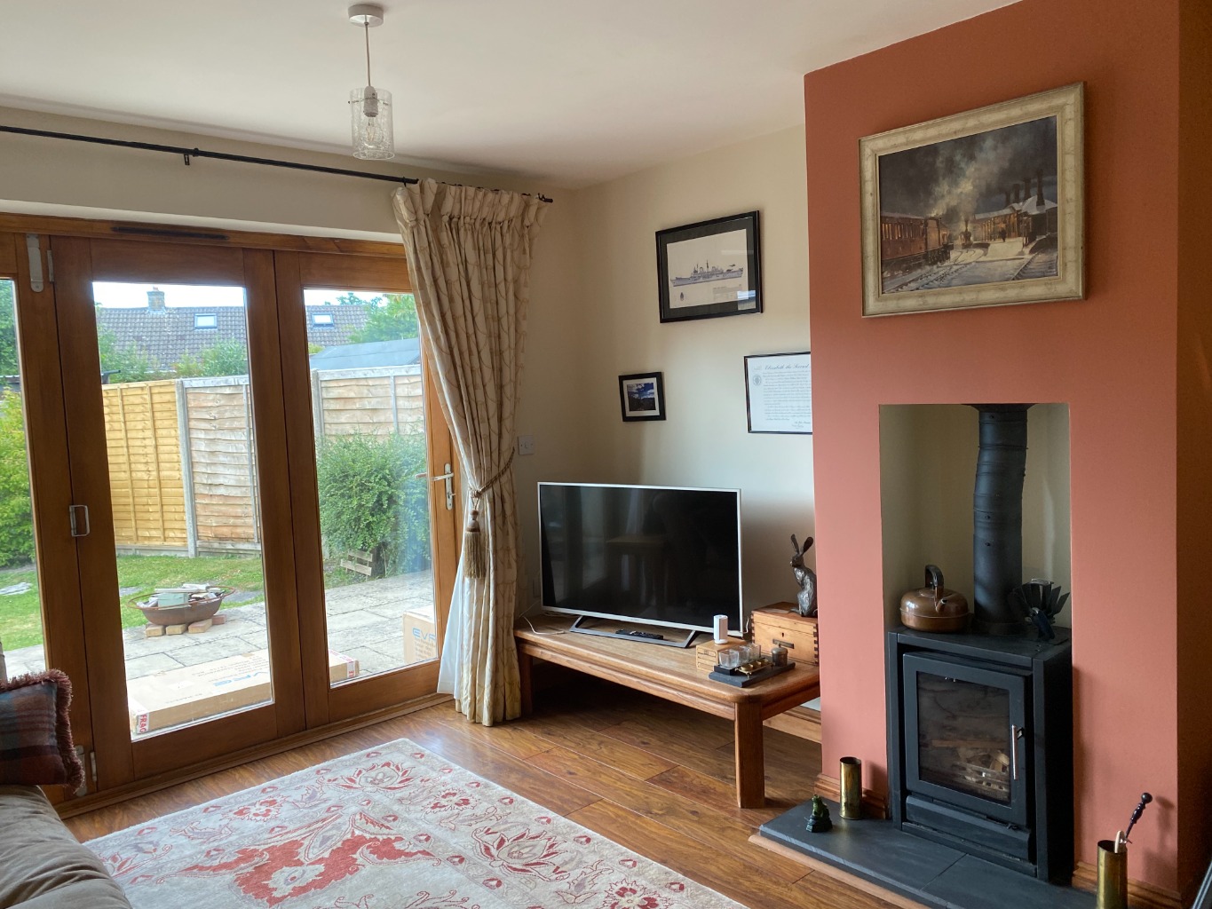 The living/ dining room is warm and inviting with its soft neutral colour palette and rich, dark wood-coloured flooring. A log-burning stove provides a charming centre piece, while bi-folding doors offer uninterrupted views down the length of the garden, all the way to the apple tree at the far end.