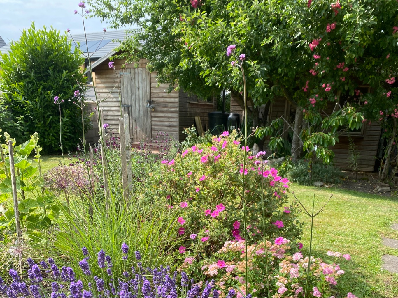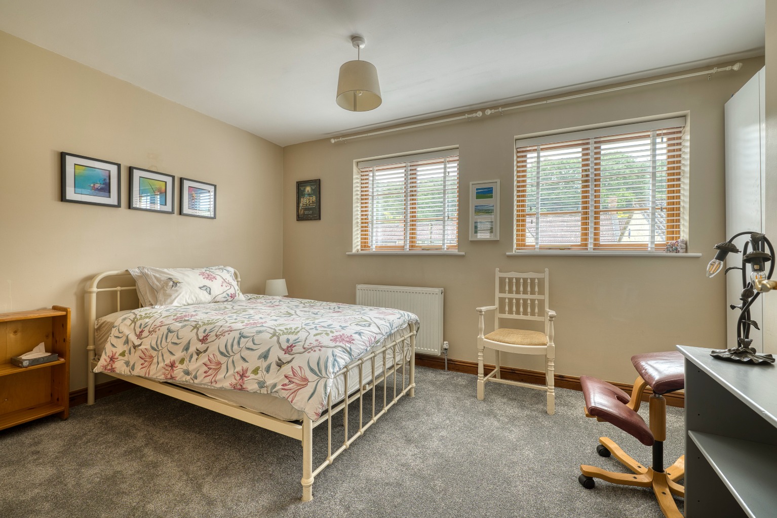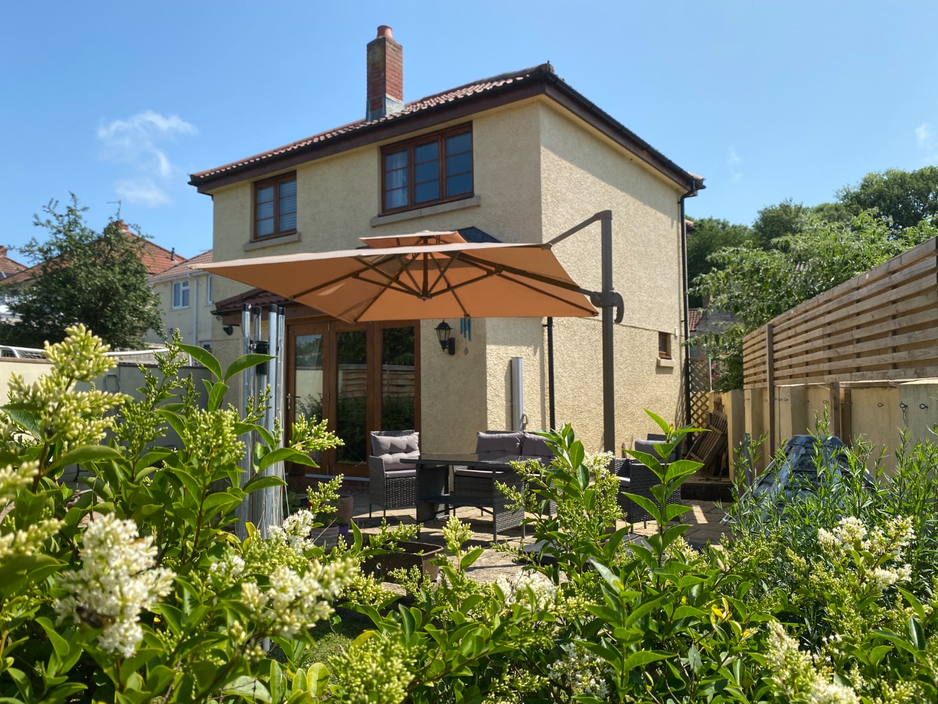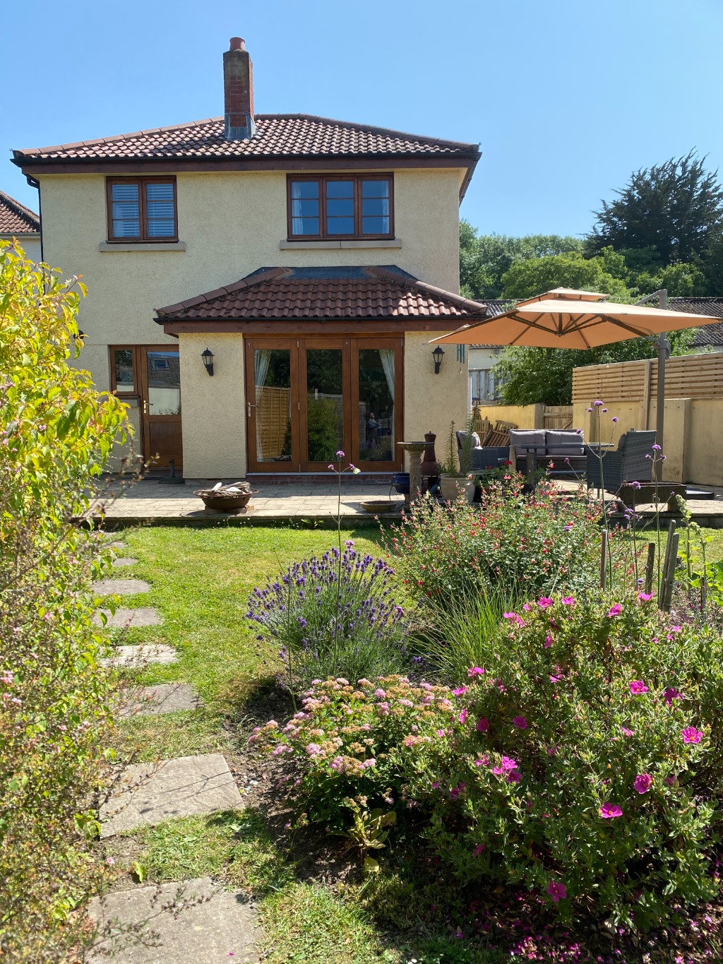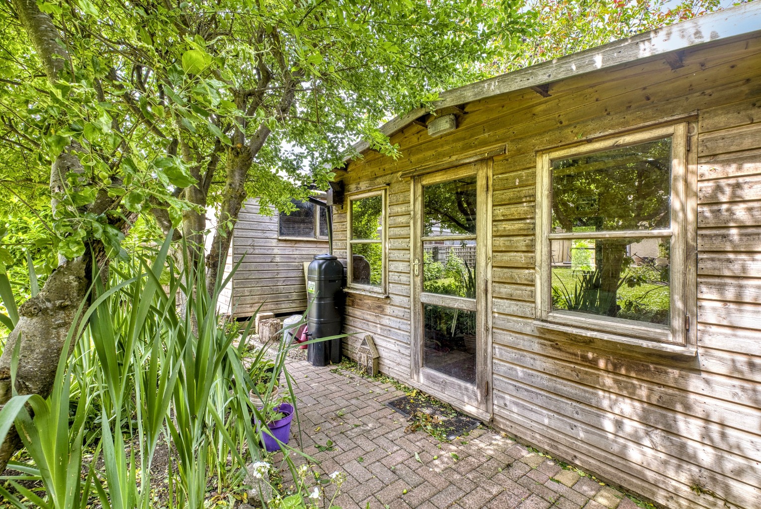 Outside, the house enjoys a sunny terrace adjoining a level lawn with fruit trees, flower beds, a wooden shed and a garden studio. There is decent off-road parking on the front shared driveway, plus a secure garage.