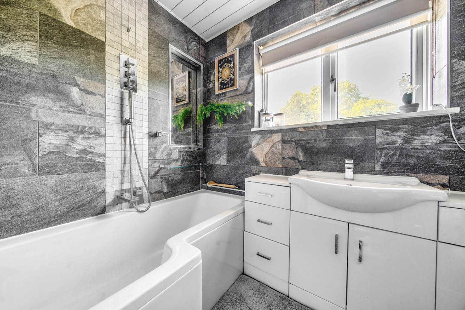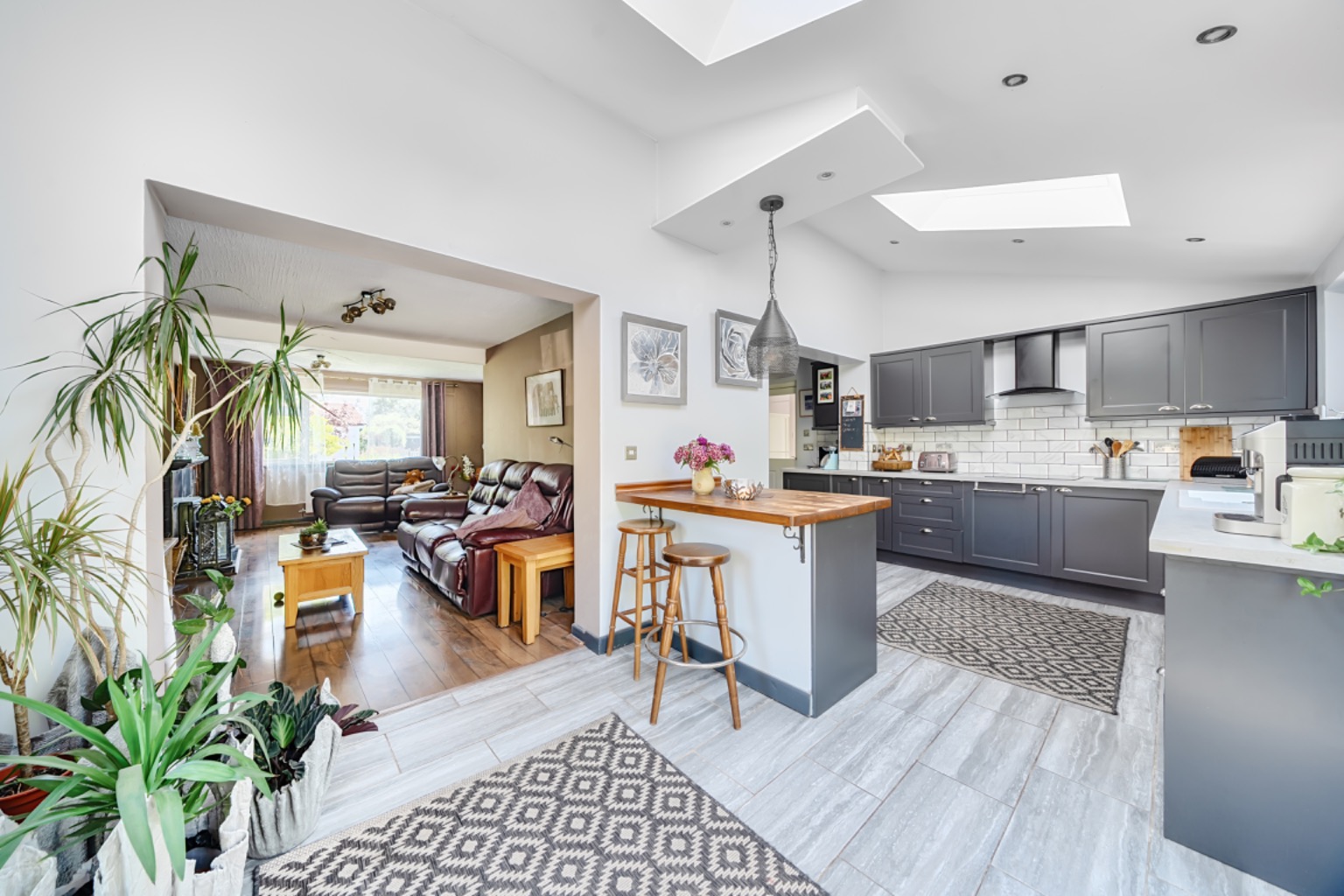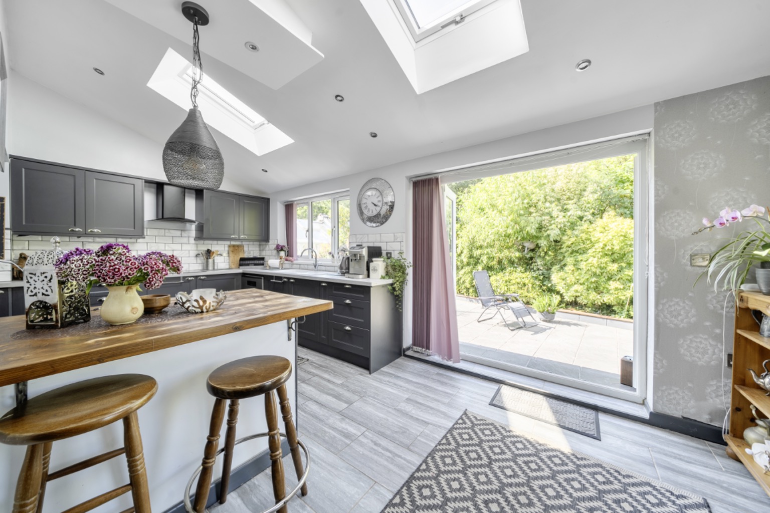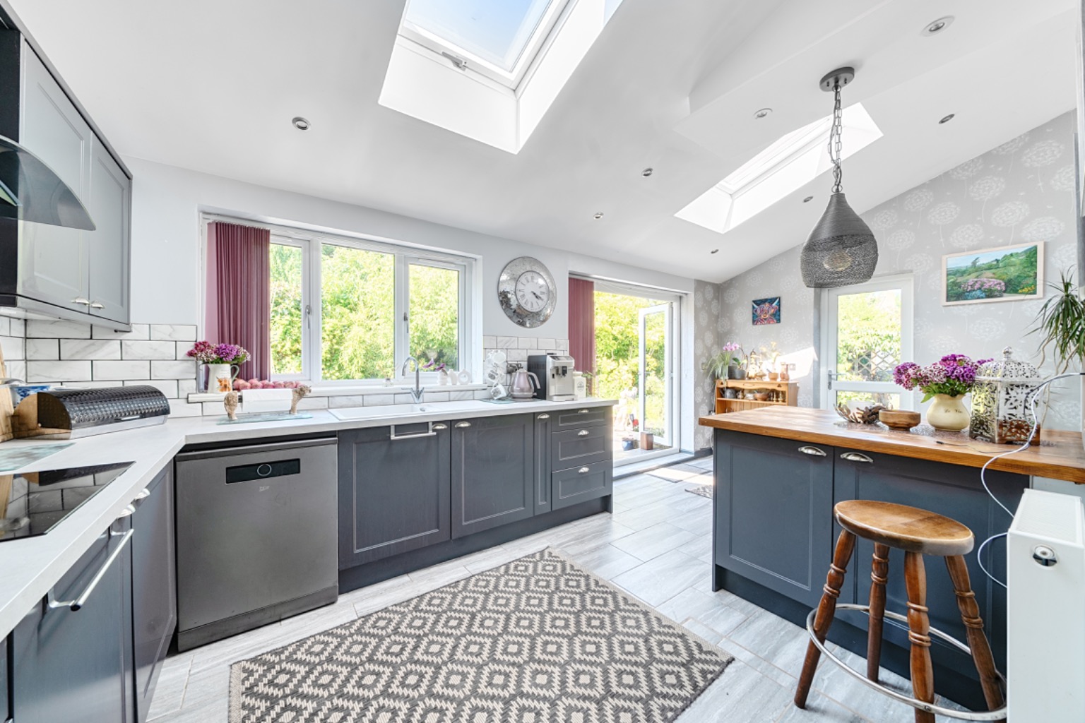 The kitchen is particularly striking with its double-height ceiling and Velux-style roof lights allowing natural light to pour in. Fitted with a comprehensive range of contemporary wall and base units with a contrasting worktops, integrated oven, hob, and extractor hood, as well as a breakfast bar. A rear aspect window with fitted blinds looks out over the garden, along with bifold doors put onto the rear seating terrace which is ideal for entertaining or extending the dining into the garden. The kitchen further benefits from underfloor heating.
