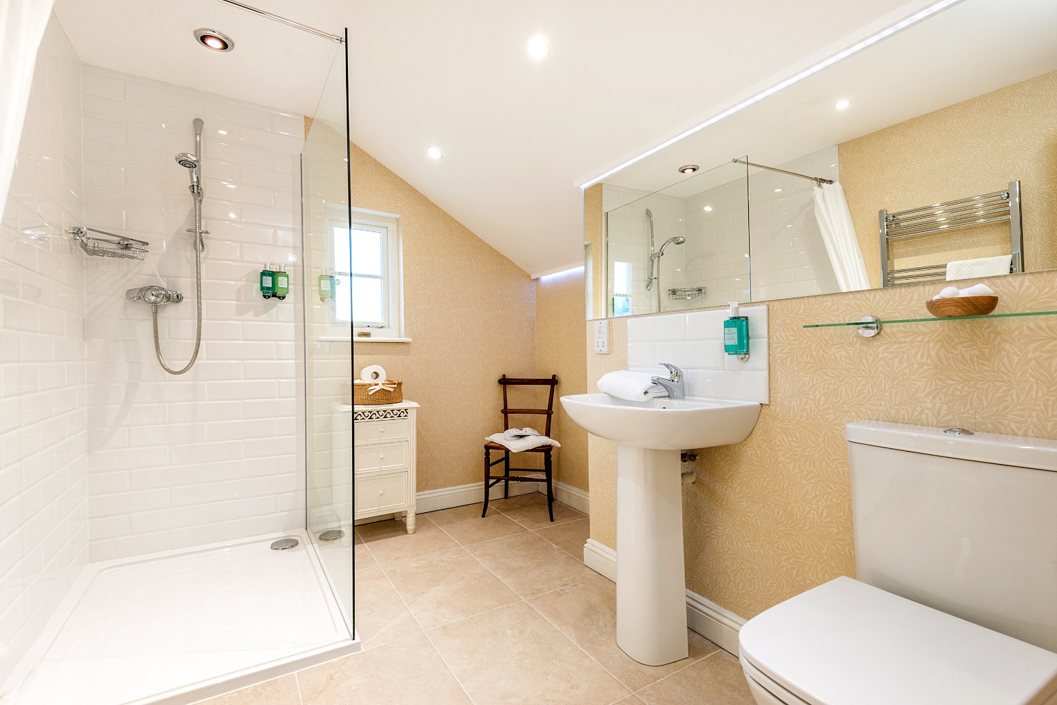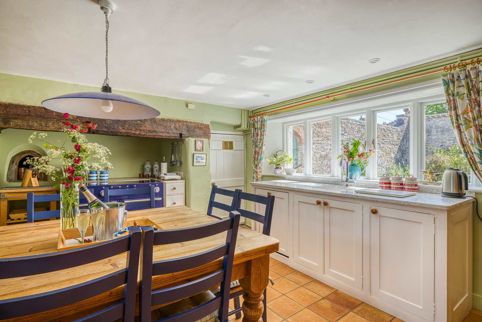 The principal reception rooms are arranged off the inner halls, all enjoying an abundance of natural light and wonderful views over the gardens. The drawing room is especially charming, with ceiling beams, an inglenook fireplace housing a wood-burning stove, a bay window, and French doors opening to the gardens. An adjacent conservatory extends this living space with glorious garden views.