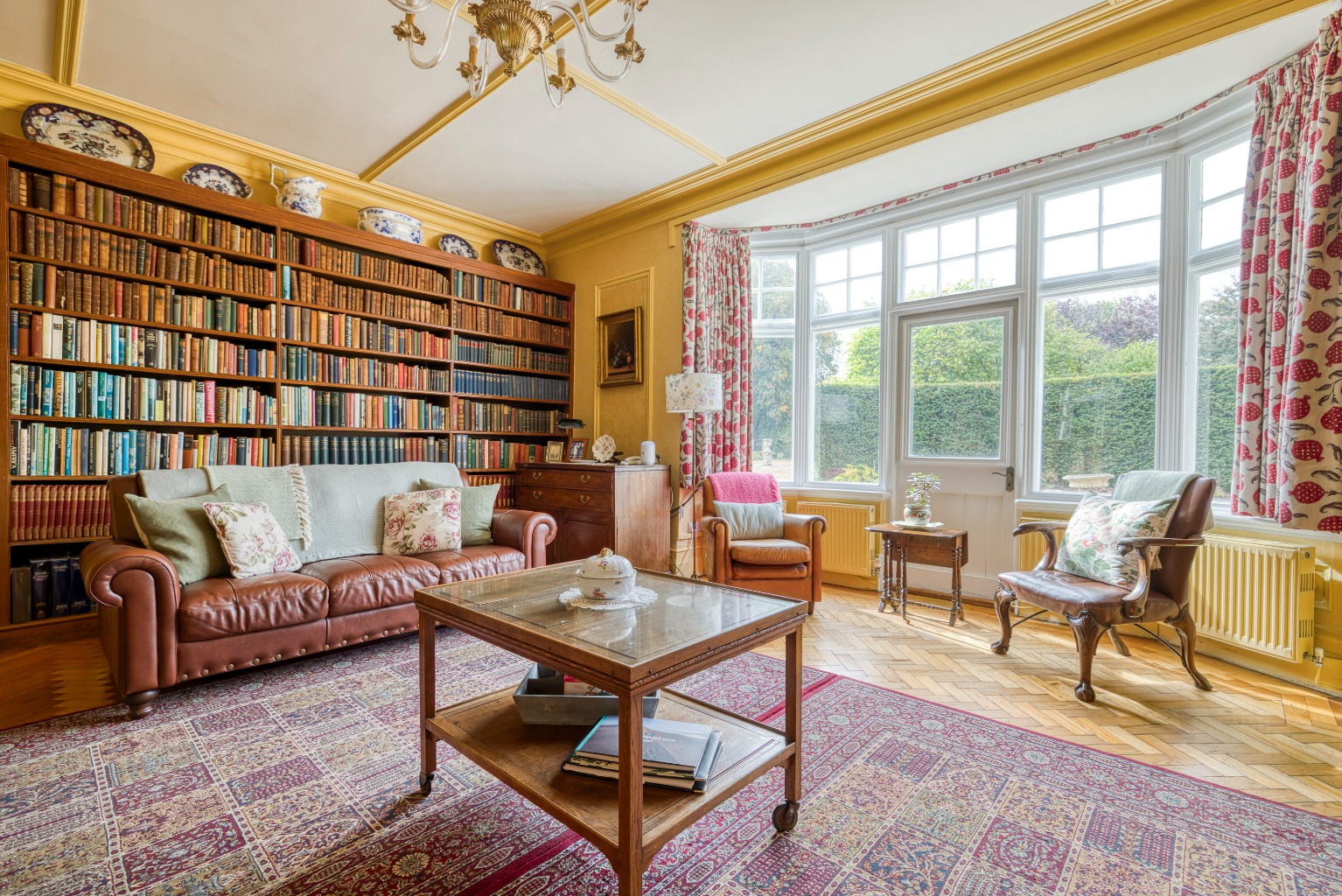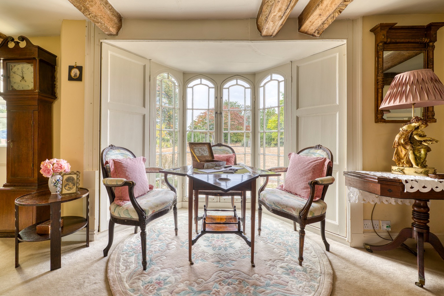 The dining room mirrors these features with exposed beams and a wide bay window, while the splendid sitting room features herringbone parquet flooring, tall bookshelves, a fireplace with stove, and another elegant bay window.