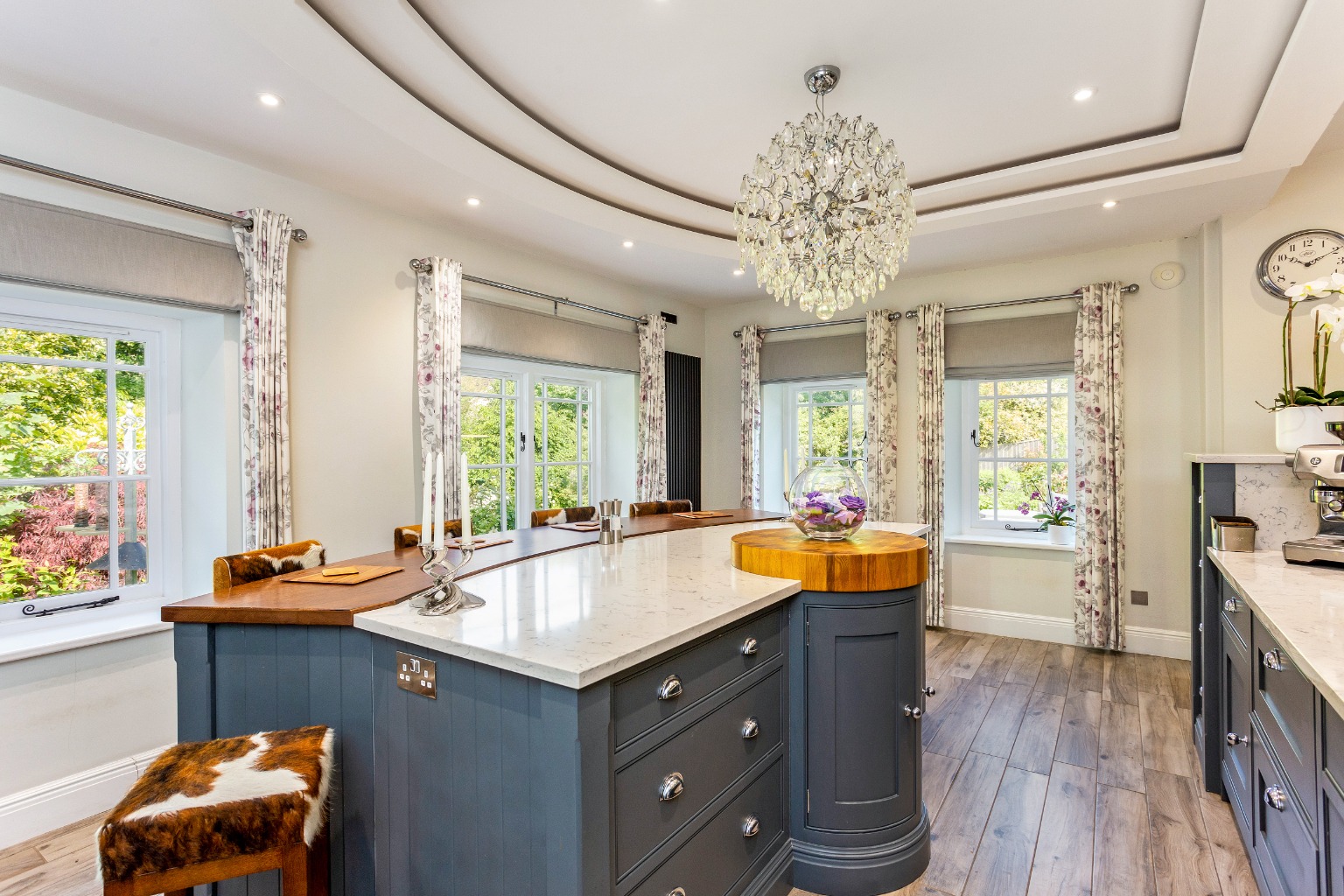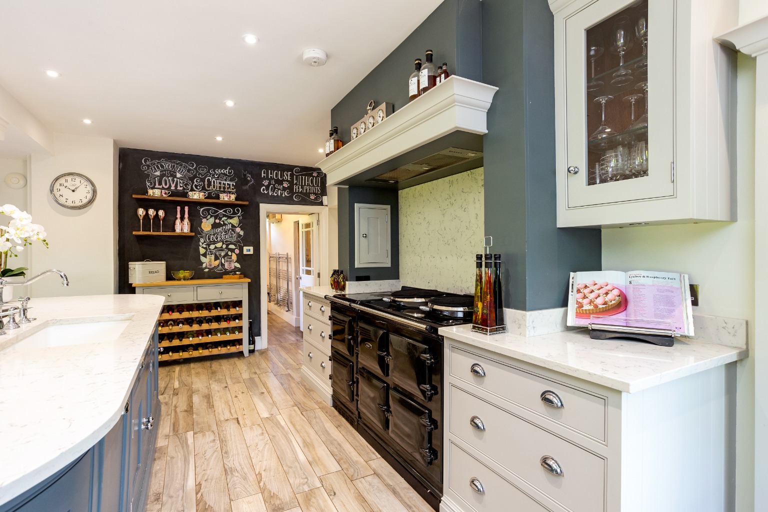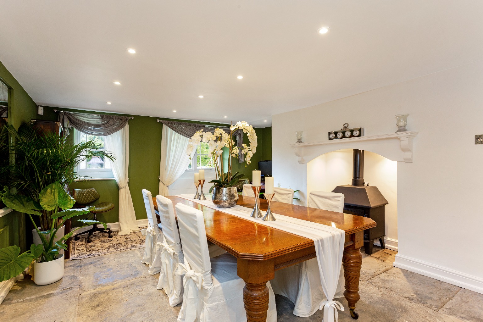 Inside, a vestibule leads into the entrance hall, finished in travertine flooring and giving access to a boot room and cloakroom. There are three main reception rooms. The drawing room features a Minster stone fireplace with woodburning stove, bespoke cabinetry, and a charming bay window overlooking the front garden—this has been faithfully recreated in a traditional style with detailed glazing and period ironmongery.