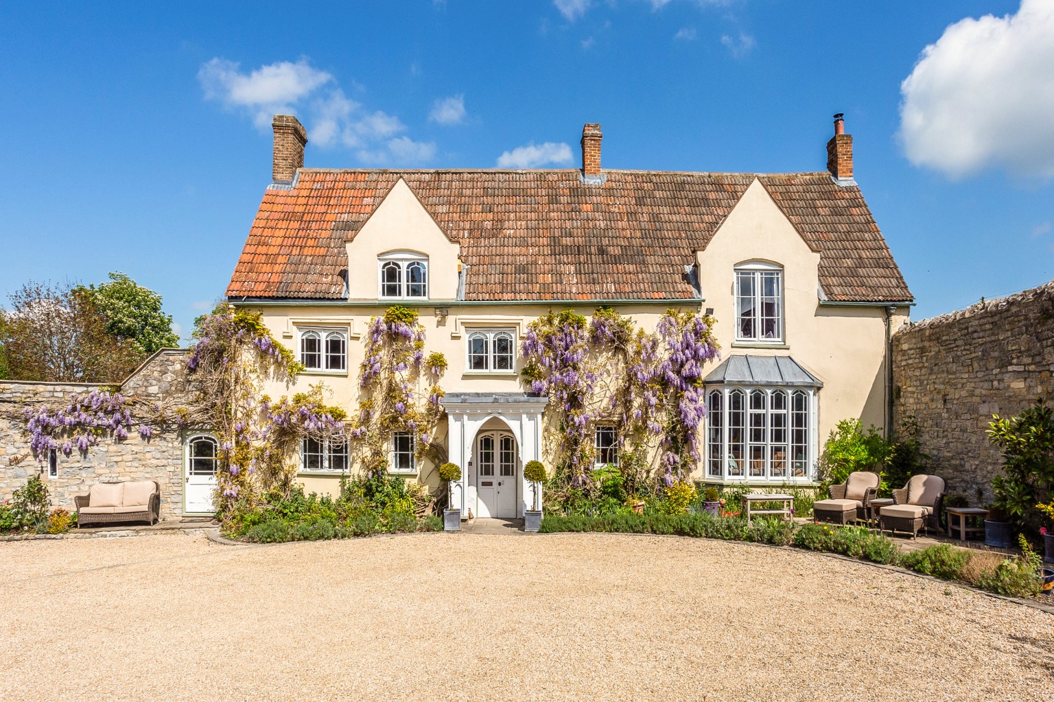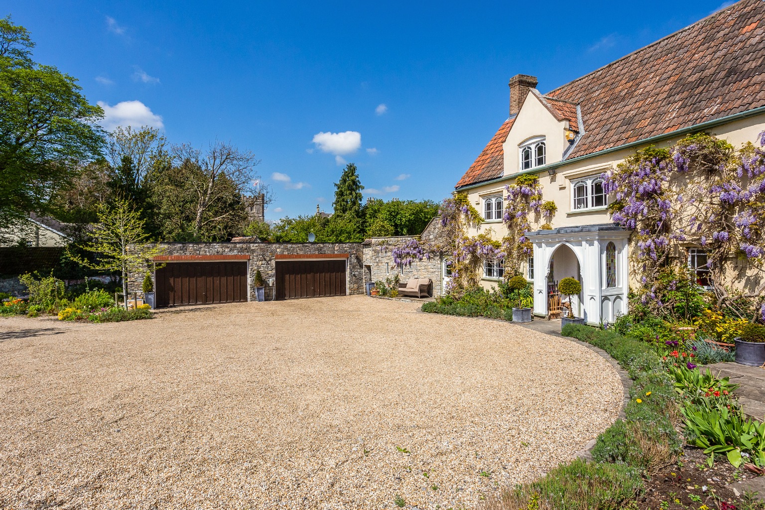 The Old Rectory is an attractive stone-built, and wisteria clad, property with a triple roman tiled roof, gothic architectural details, carefully restored to enhance both its historic features and its everyday functionality. The approach is along a gravelled drive lined with mature planting, creating a sense of privacy and setting the tone for the house beyond.