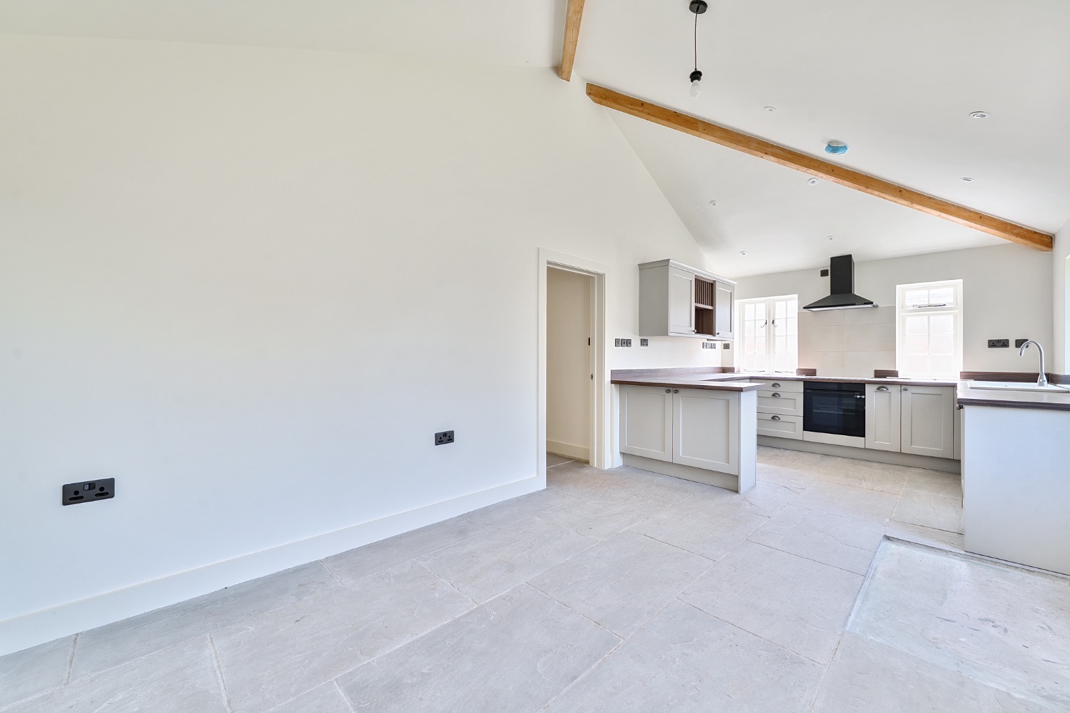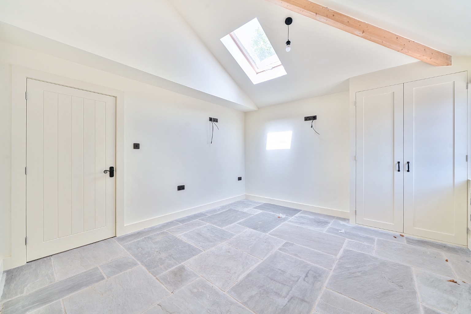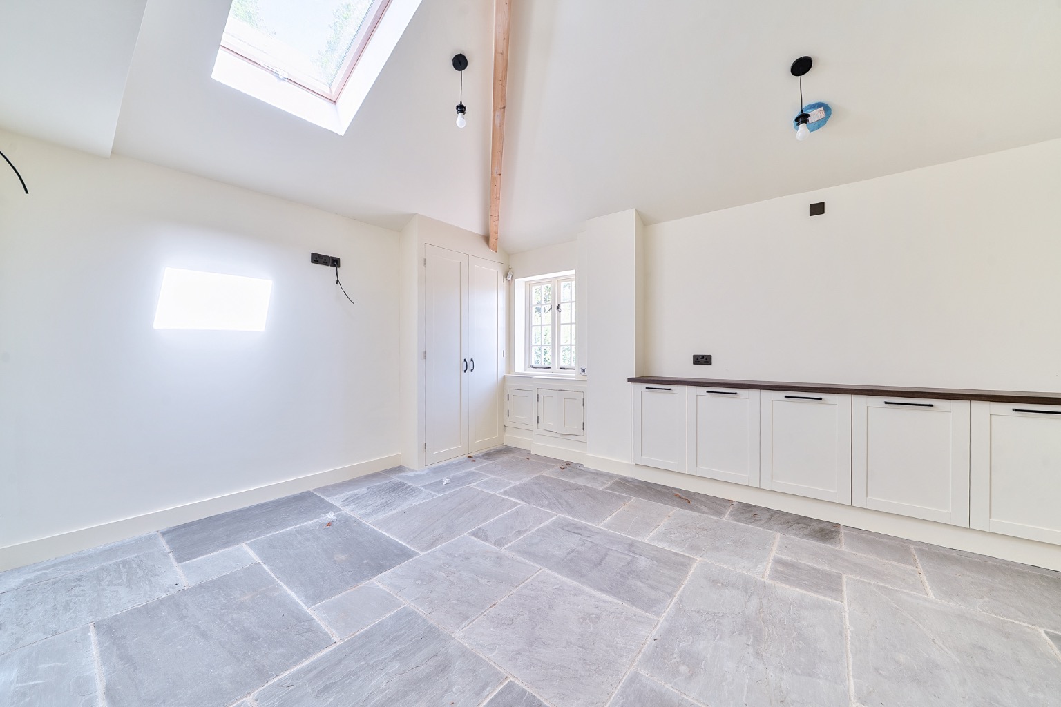 The interiors feature vaulted ceilings, Velux rooflights, and flagstone flooring throughout the main living areas, adding character and a bright, airy feel. The sitting room has also been fitted with bespoke storage solutions