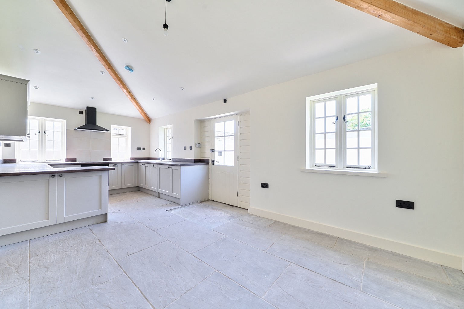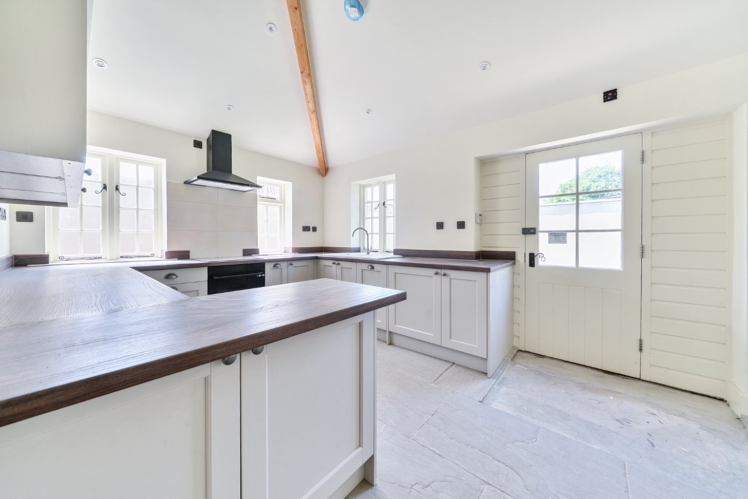 Within the kitchen/diner, a comprehensive range of wall and base cabinetry is complemented by contrasting worktops and flagstone flooring, and integrated appliances include fridge, freezer, dishwasher, washing machine, induction hob, oven and matching extractor. A rear door opens to the rear garden, making the garden ideal for outdoor dining and entertaining.