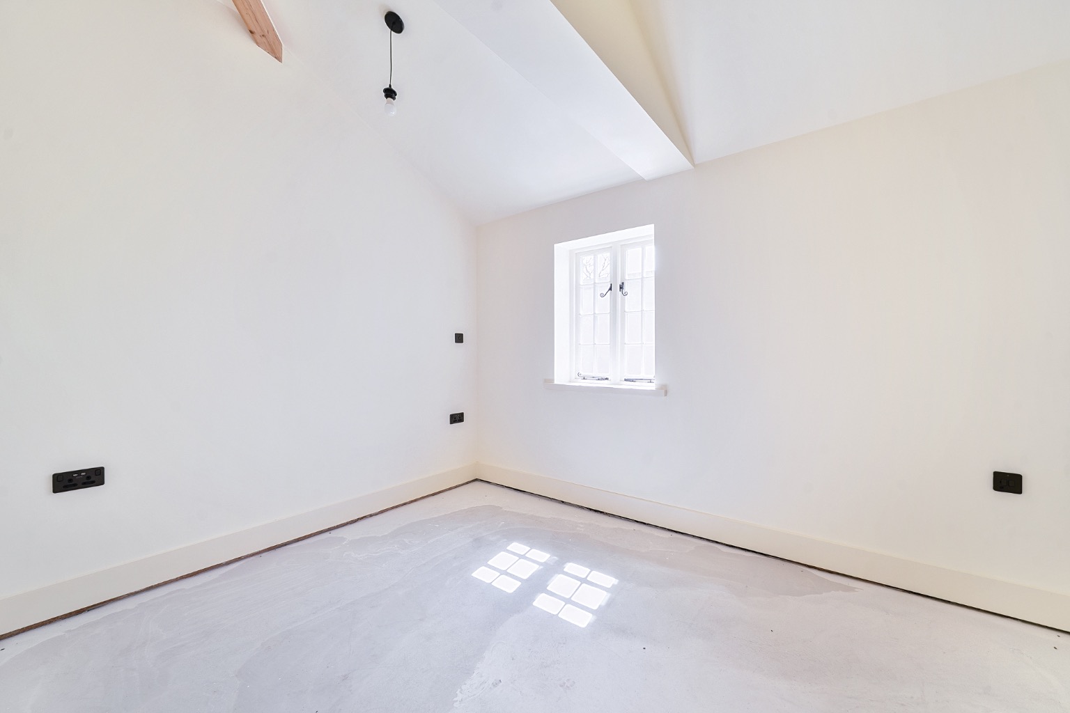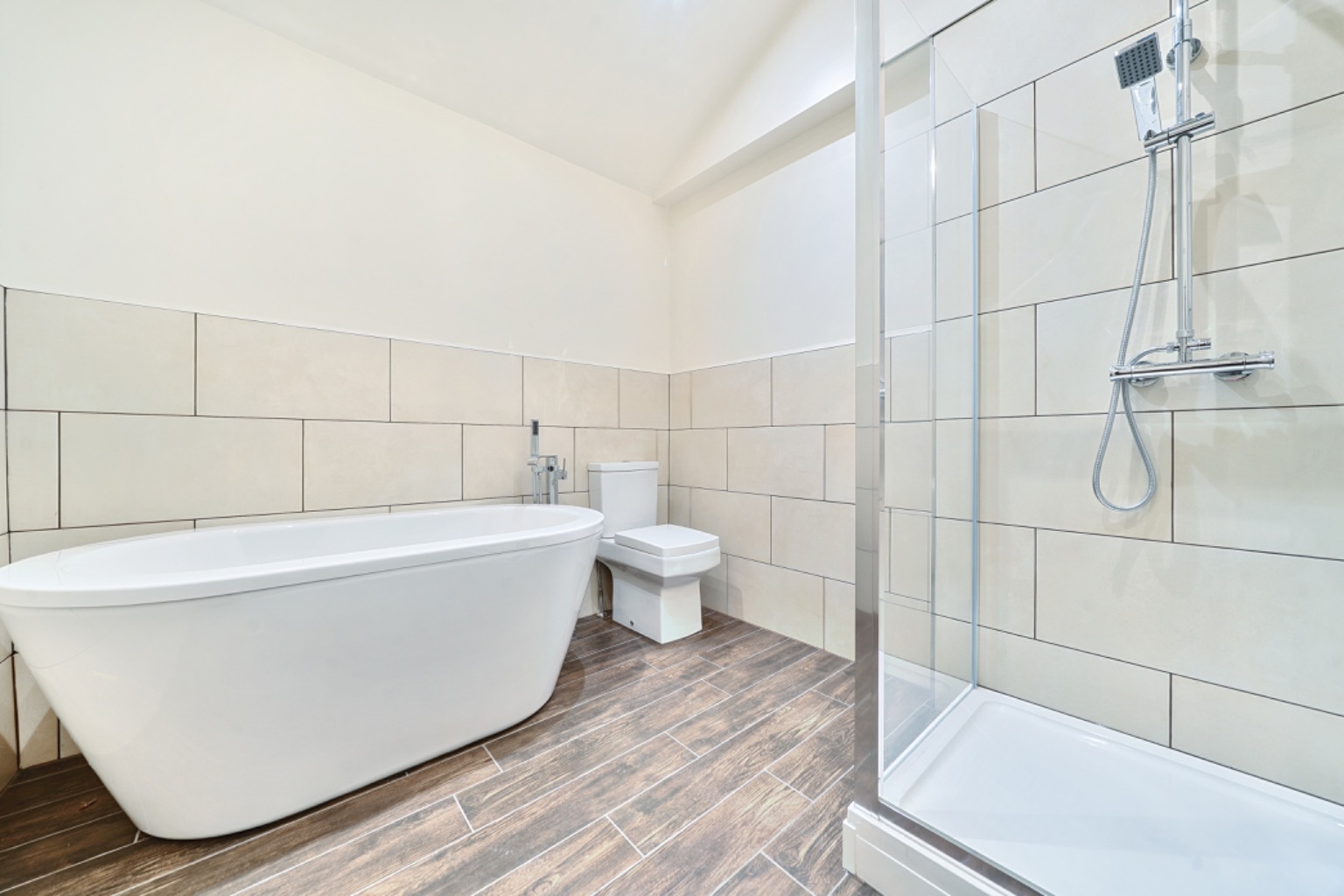 The bathroom has been finished to a luxurious standard, comprising a freestanding roll-top bath, separate walk-in shower, vanity basin, WC, and stylish fittings.