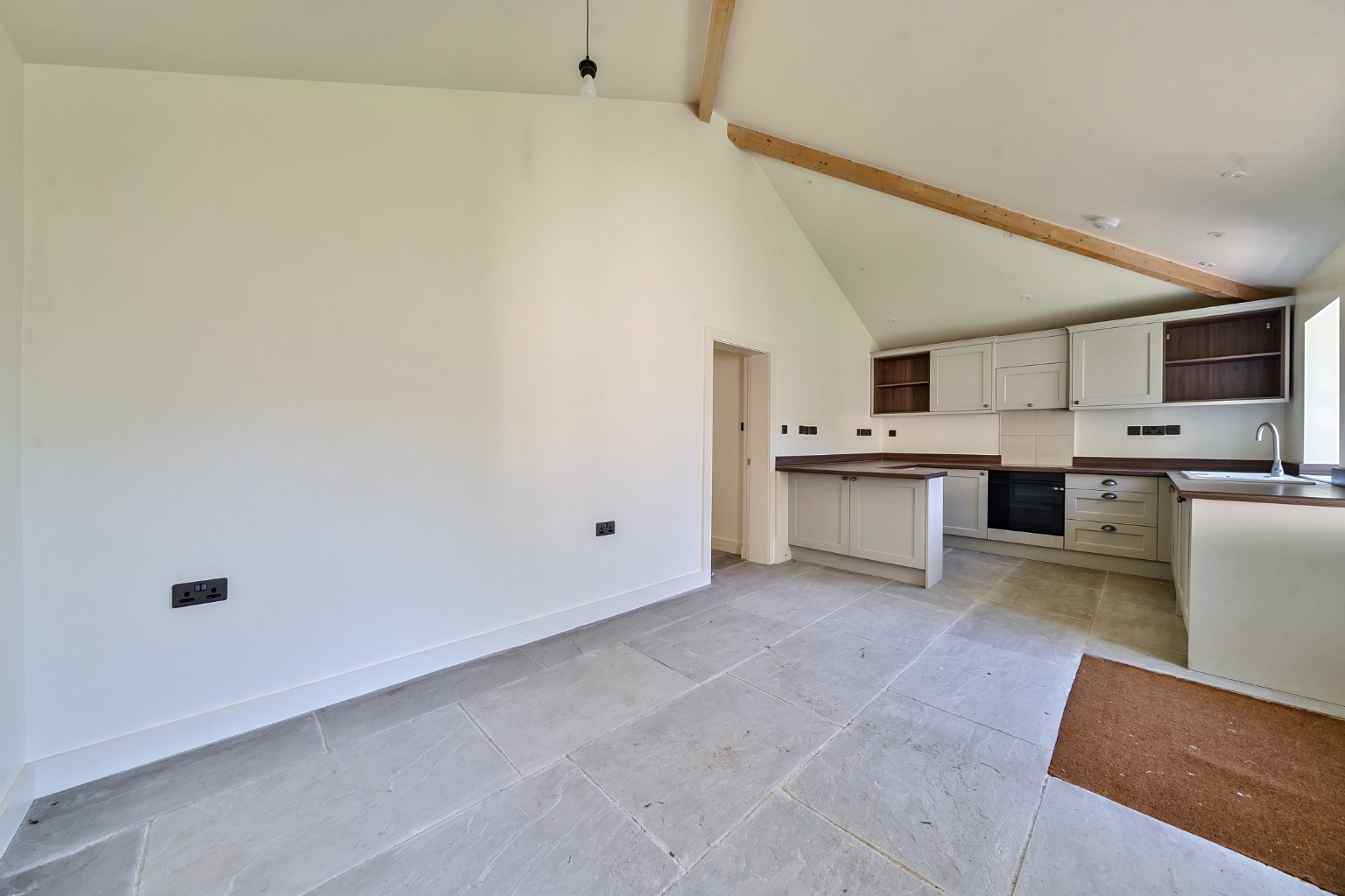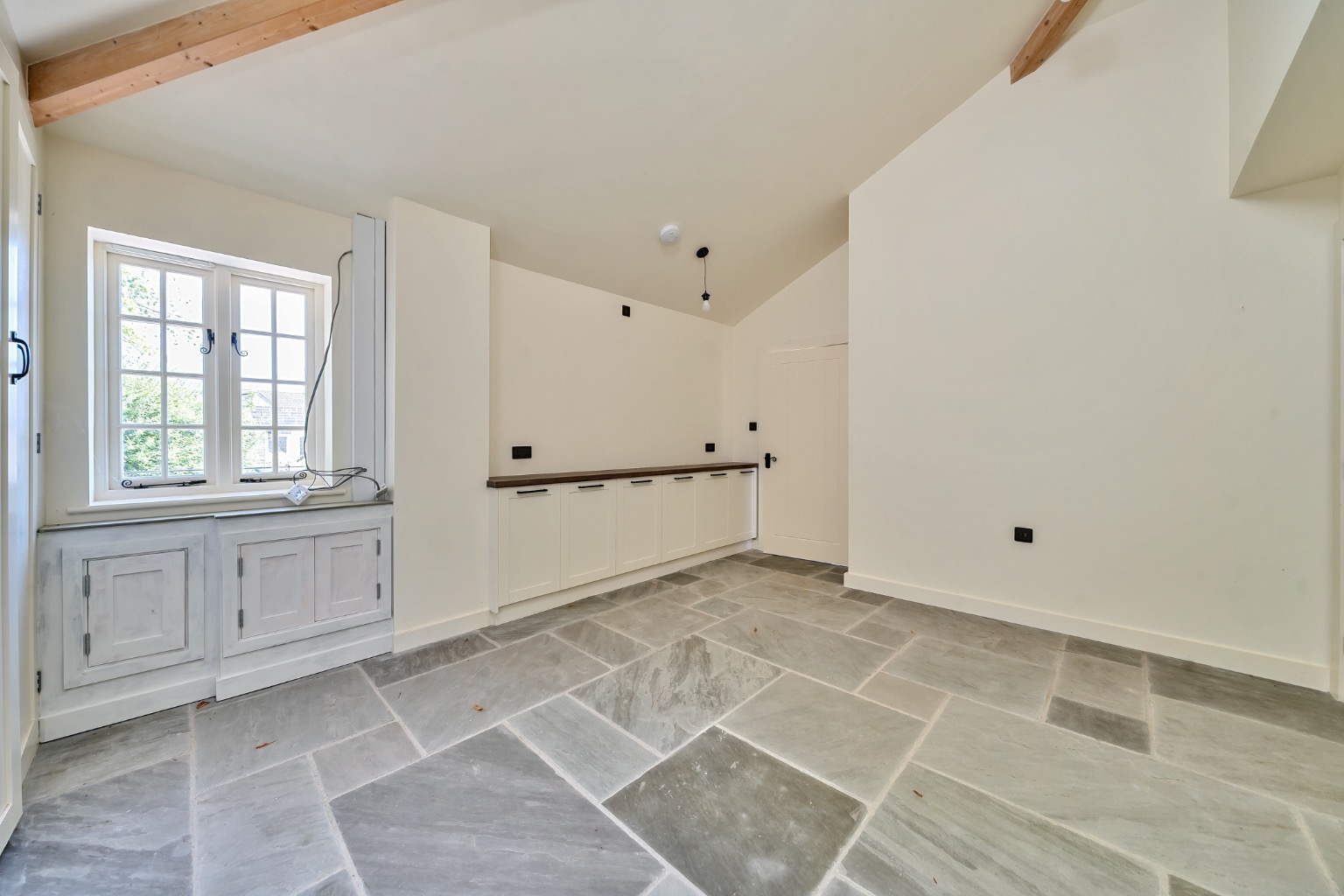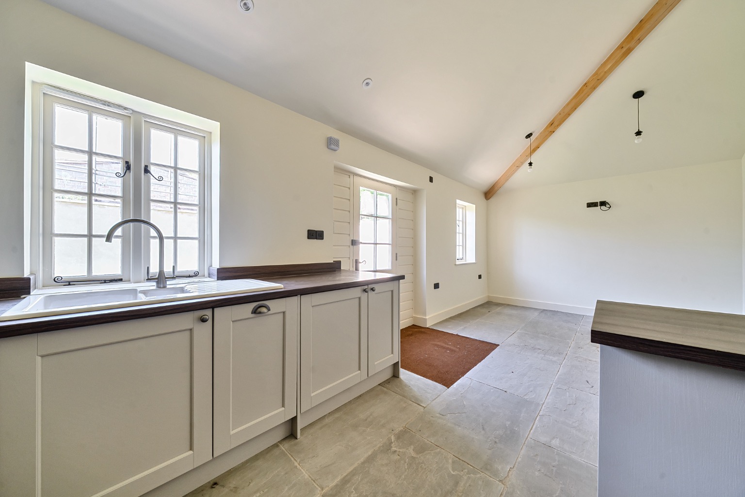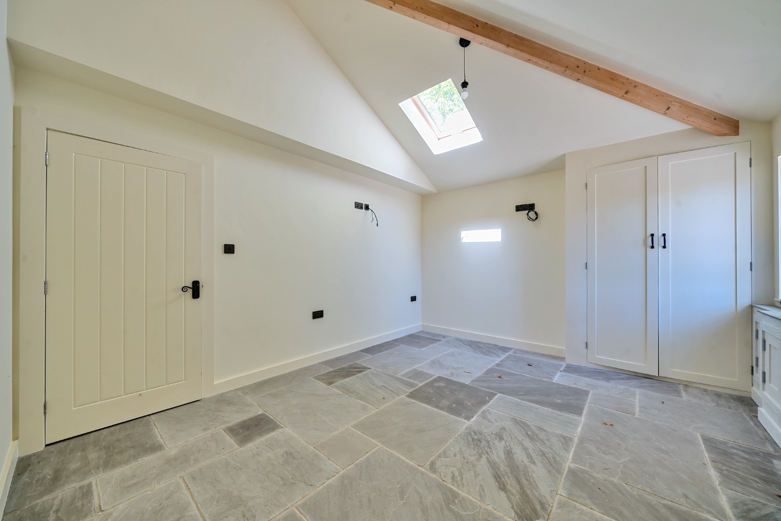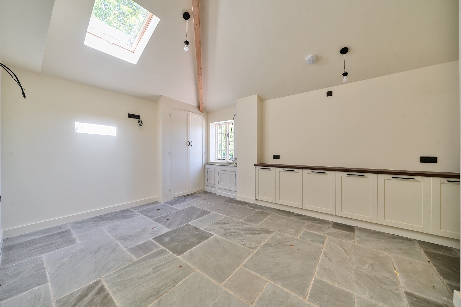 The interiors feature vaulted ceilings, Velux rooflights, and flagstone flooring throughout the main living areas, adding character and a bright, airy feel. The sitting room has also been fitted with bespoke storage solutions