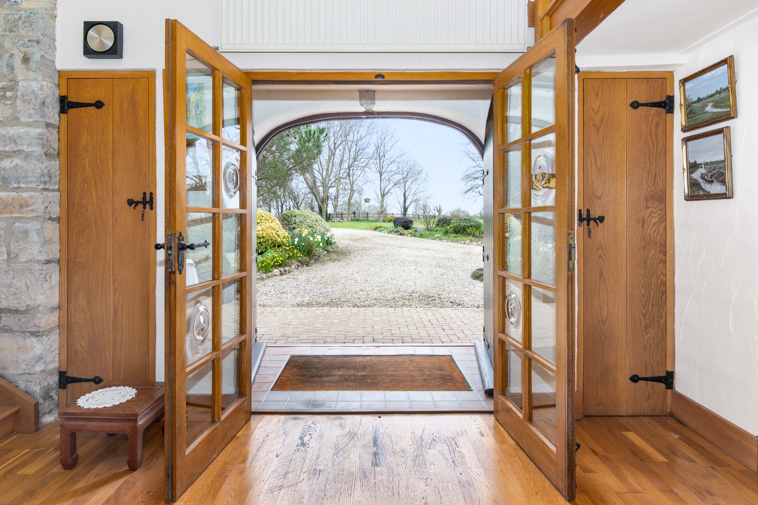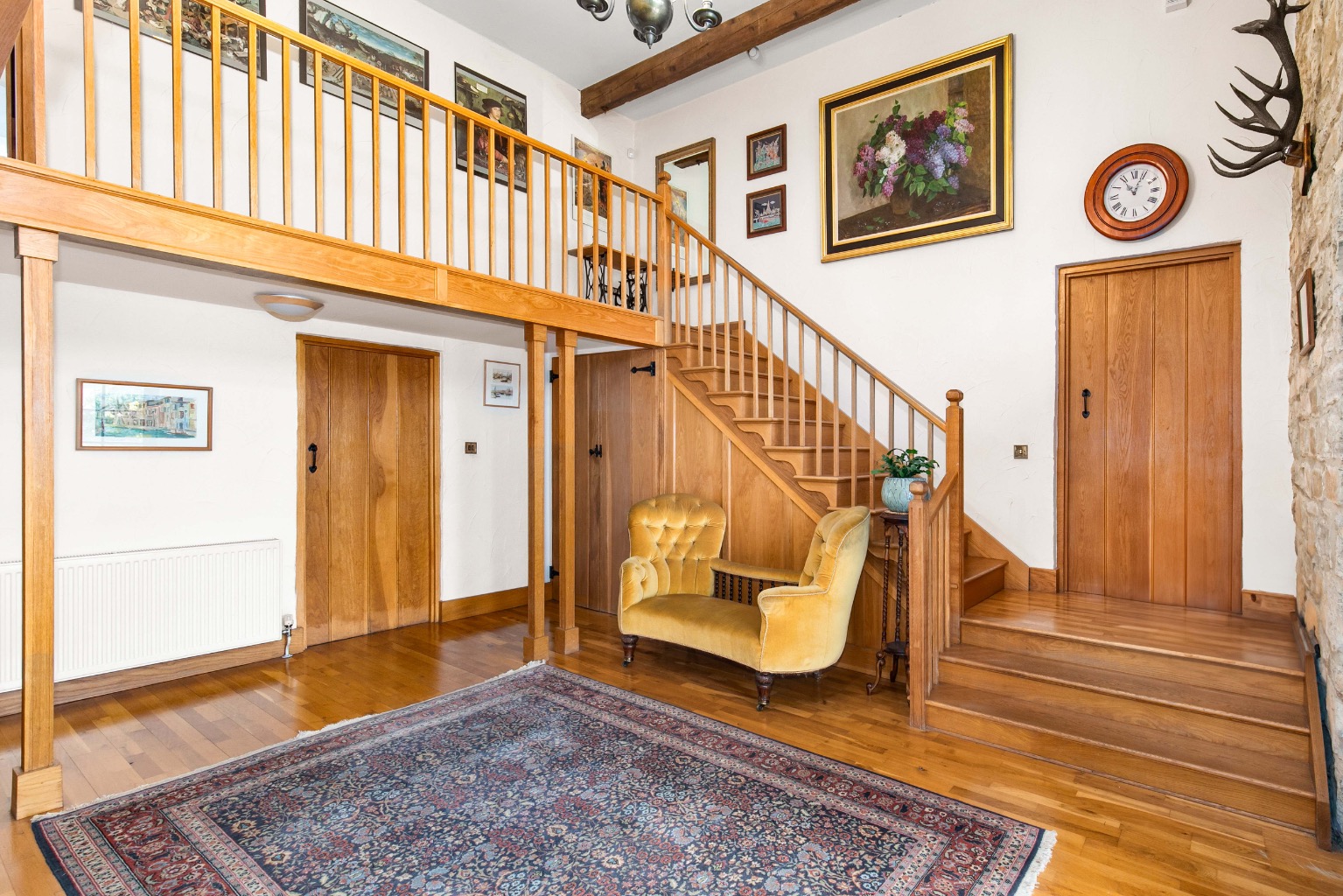 Solid wood arched doors opens into a porch, where internal glazed double doors reveal a grand full height reception hallway, designed for entertaining and easily accommodating a large dining table. Practical storage is provided by cupboards flanking the front door and a further cupboard beneath the staircase.
