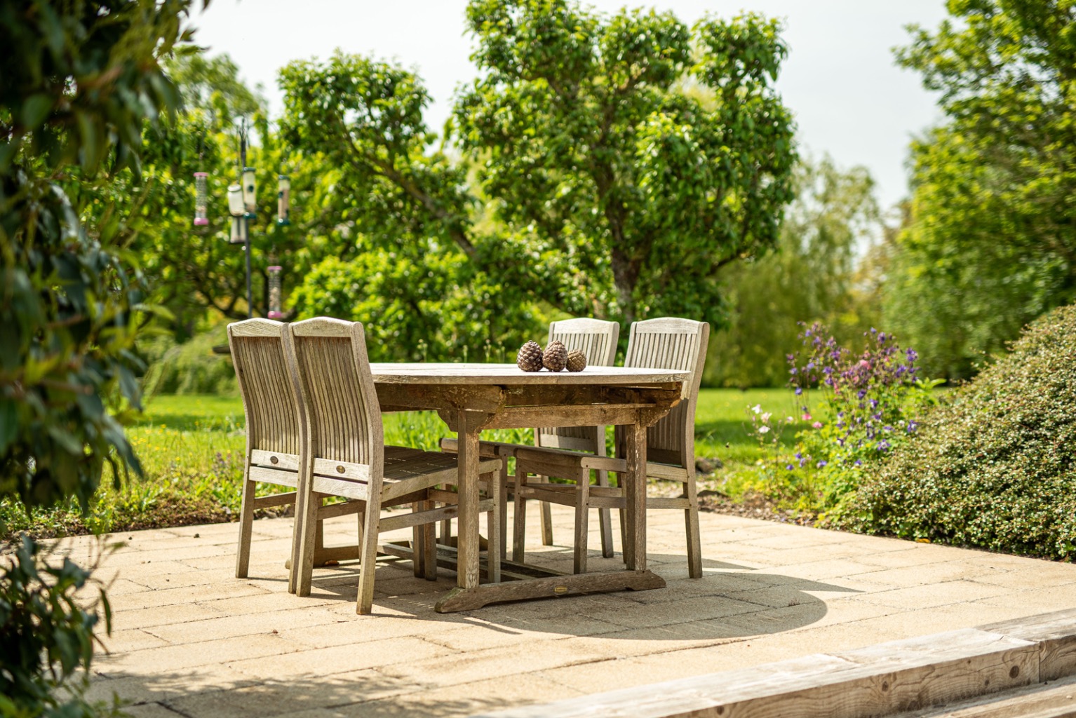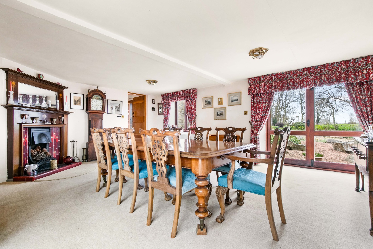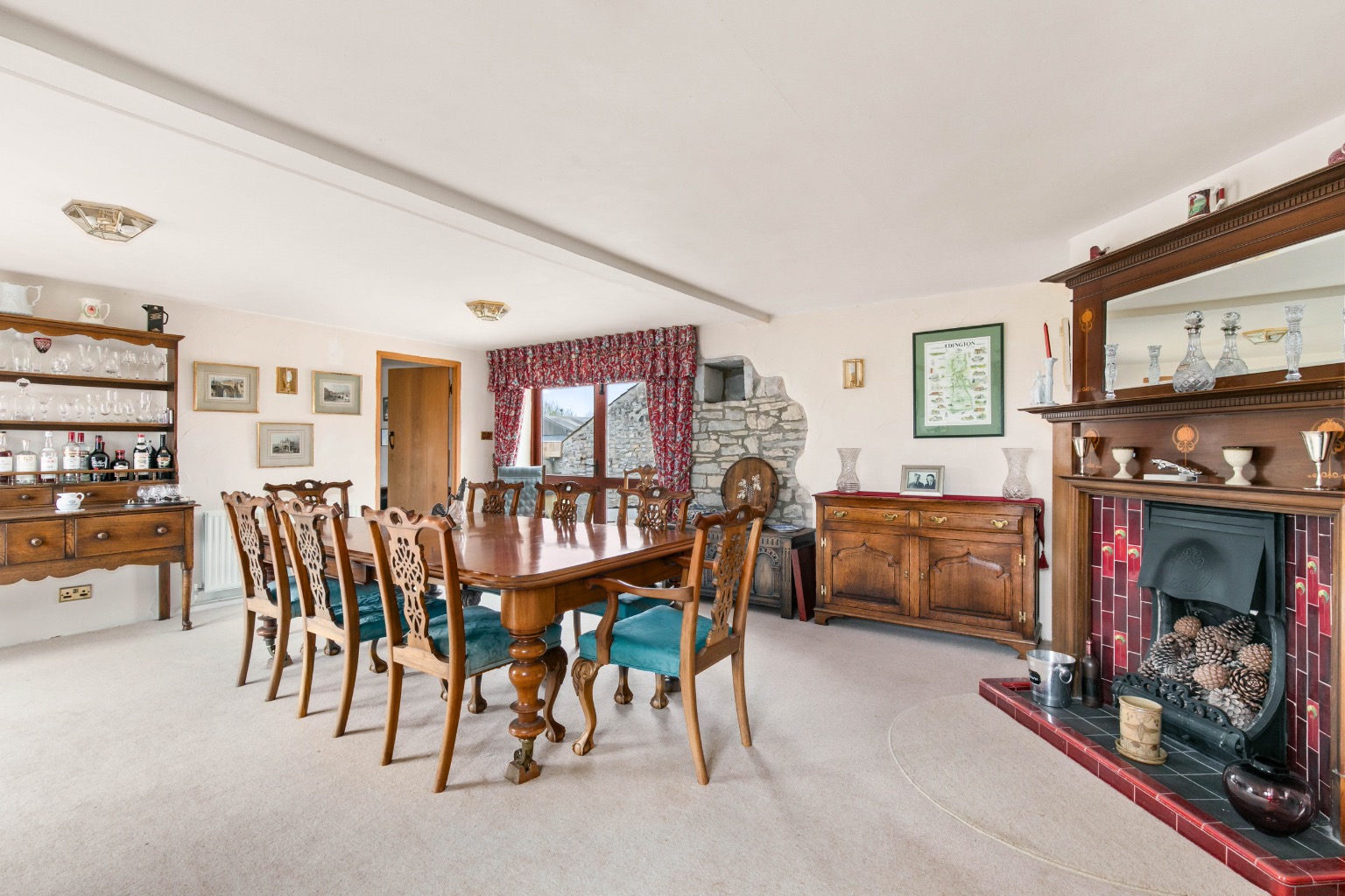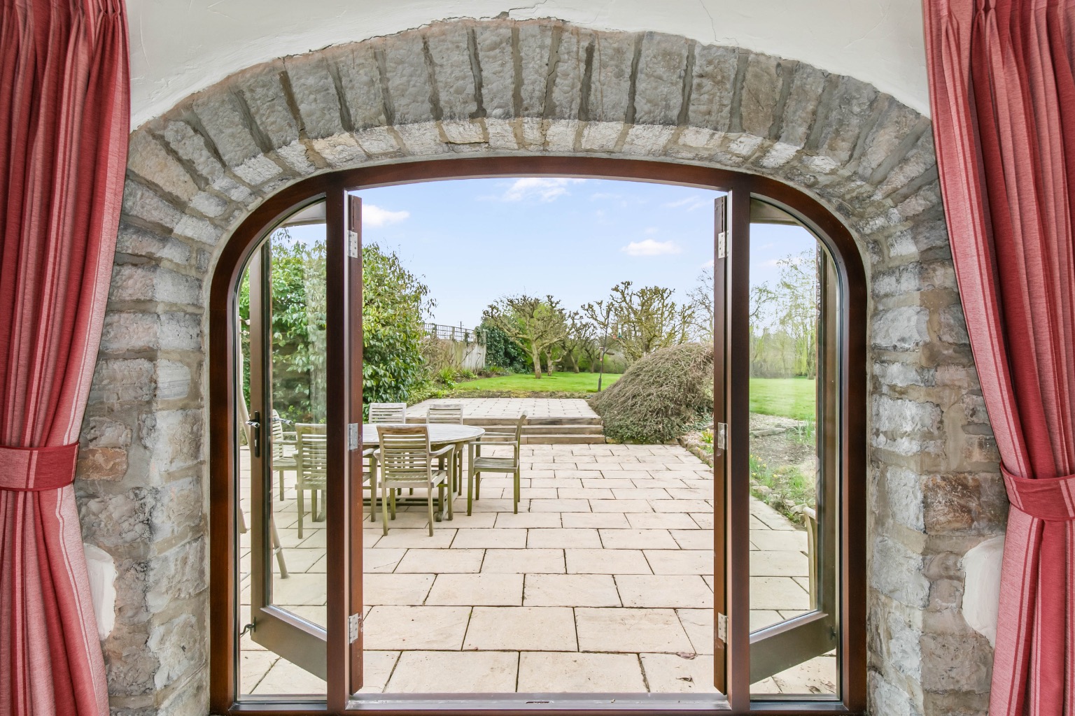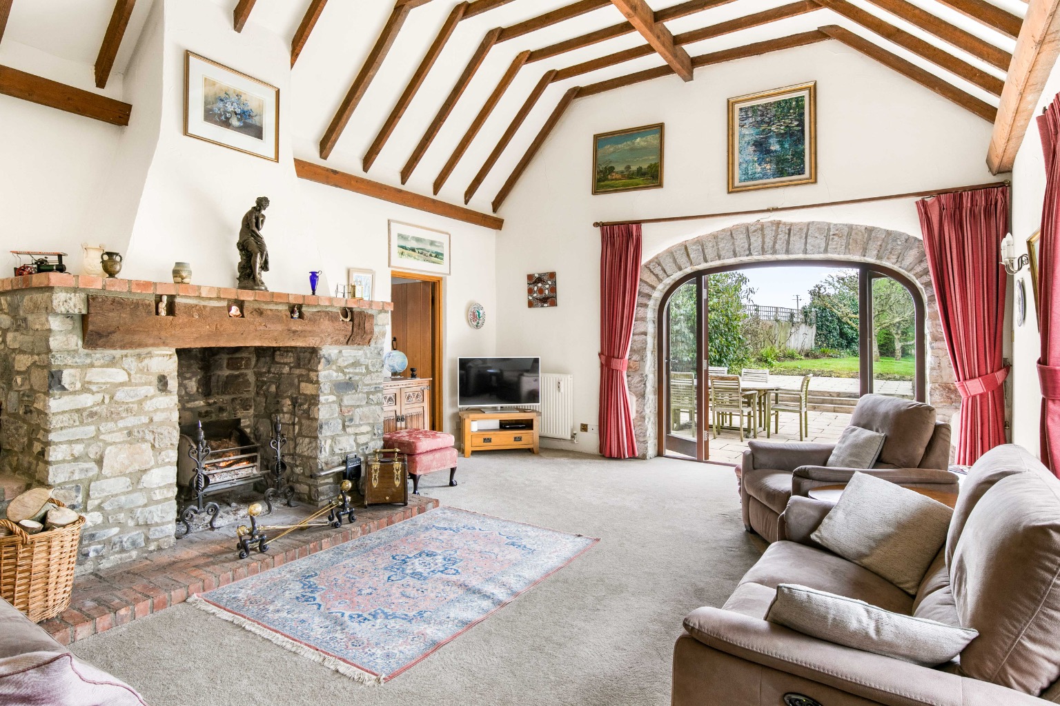 The sitting room, with its double-aspect, high ceiling, and impressive stone inglenook fireplace, opens to a sunny, south facing garden terrace through arched French doors. A great place for alfresco dining and entertaining.