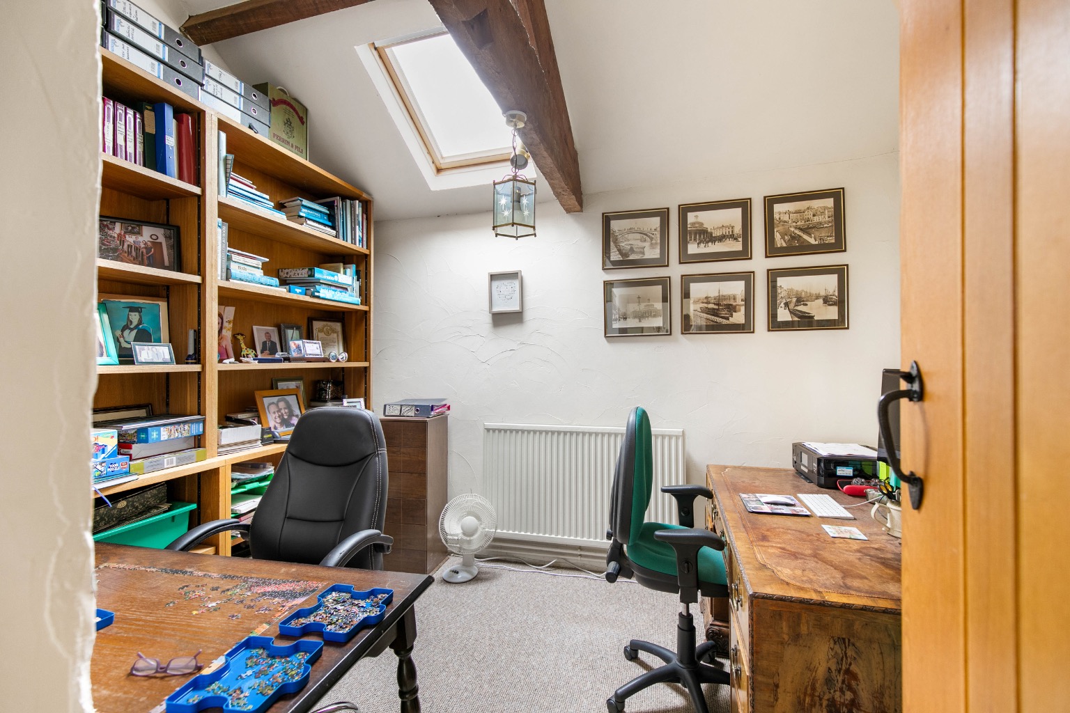 Adjacent is a well-appointed study with shelving and a front-facing window.