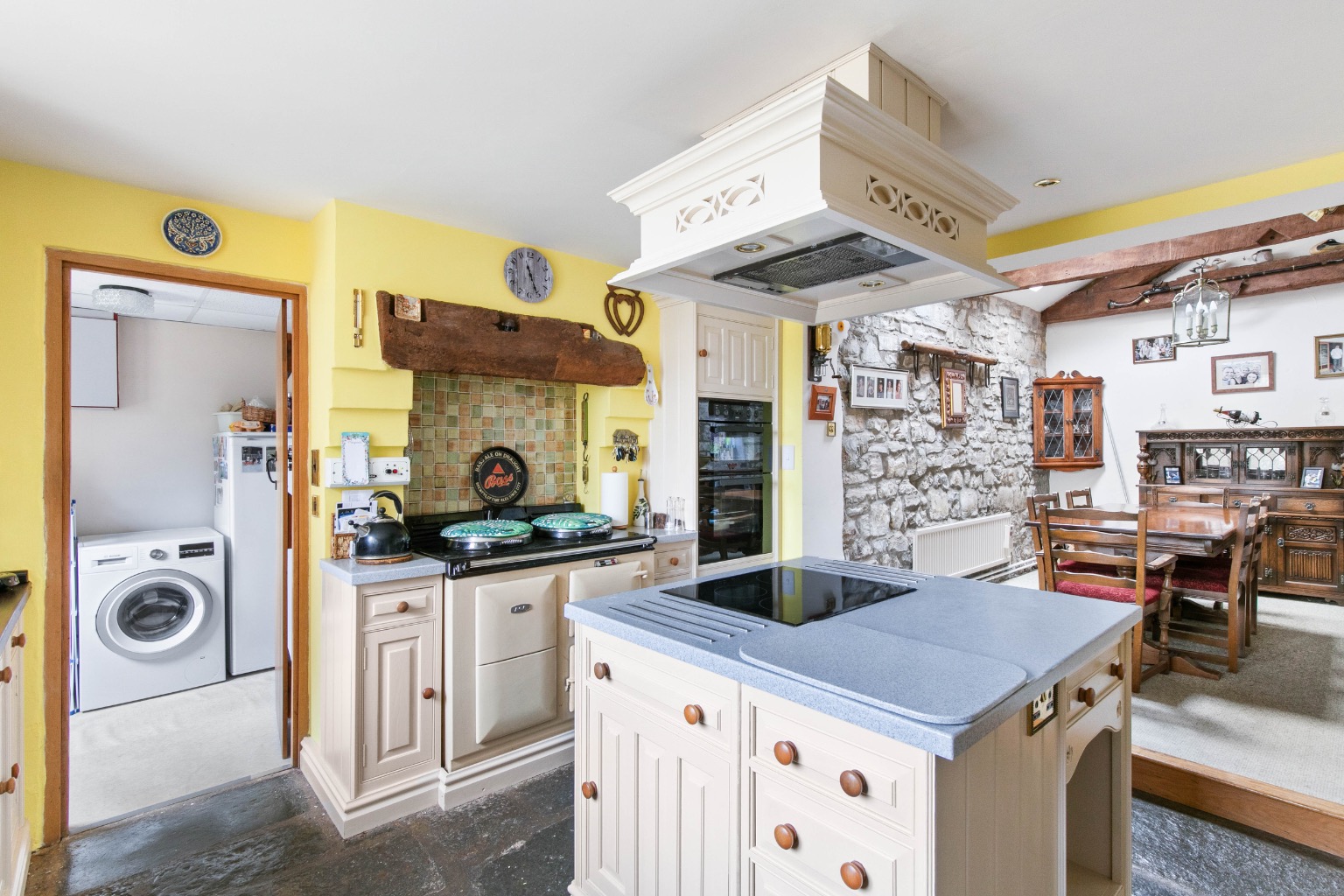 The farmhouse kitchen overlooks the rear courtyard garden and paddock, and is tastefully fitted with cream wooden units and a dresser, complemented by flagstone floo...