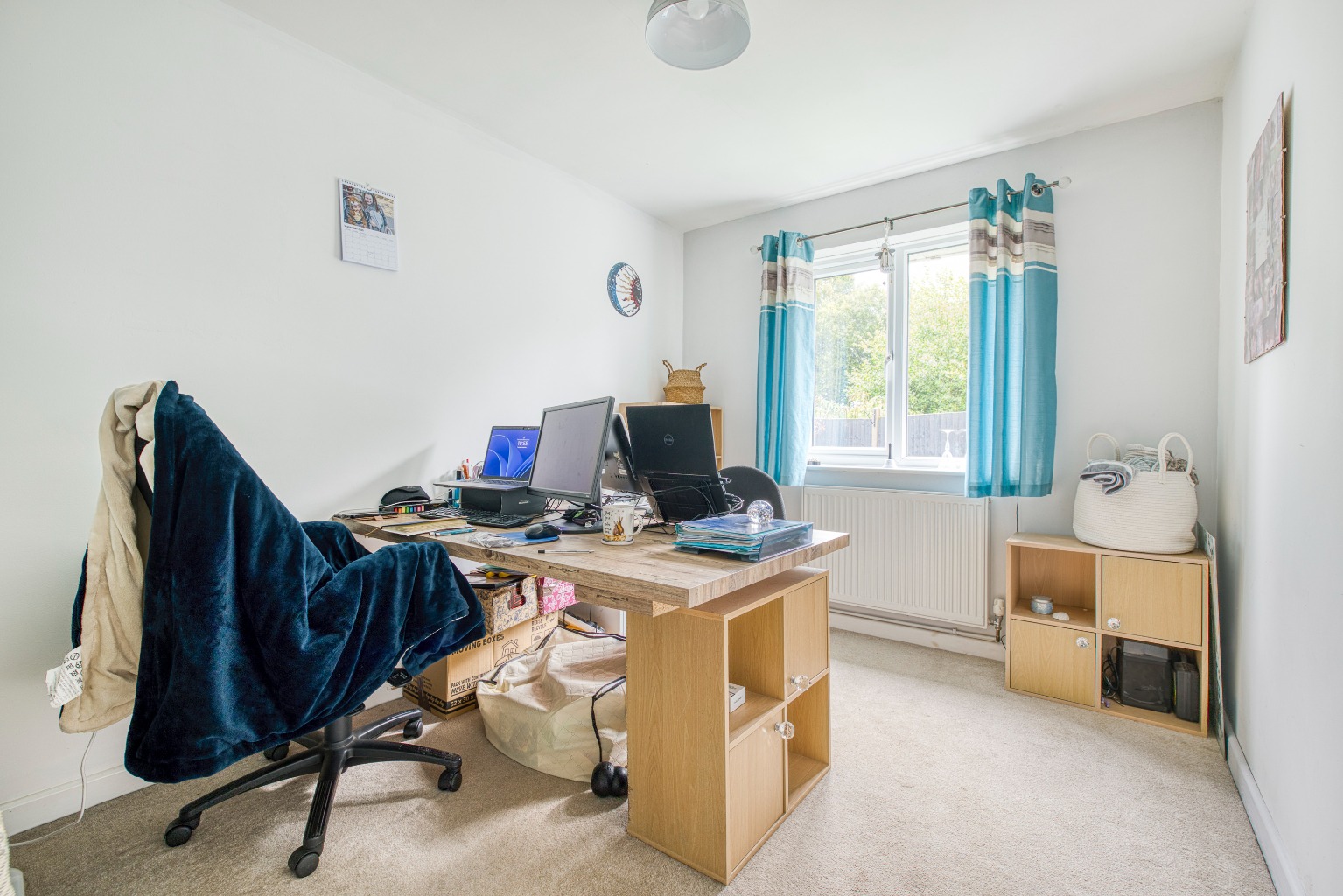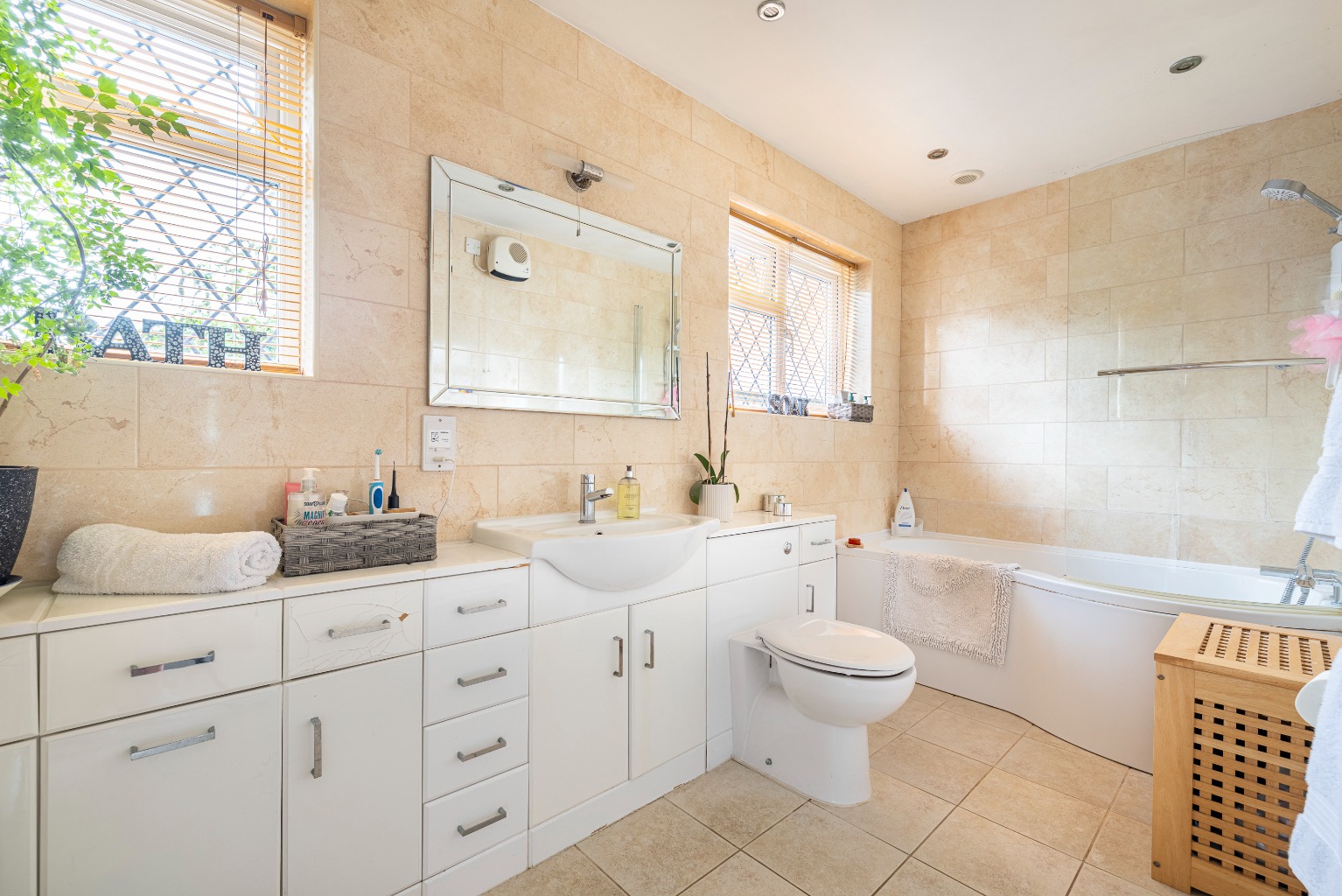 There are three good-sized bedrooms. The principal bedroom includes a fitted wardrobe and a rear garden aspect. The second bedroom is another well-proportioned double, again with garden views, while the third looks out to the front garden. The bathroom is fully tiled and includes a bath with a shower over, a fitted vanity unit with a wash basin providing generous storage, WC, and an electric towel rail.