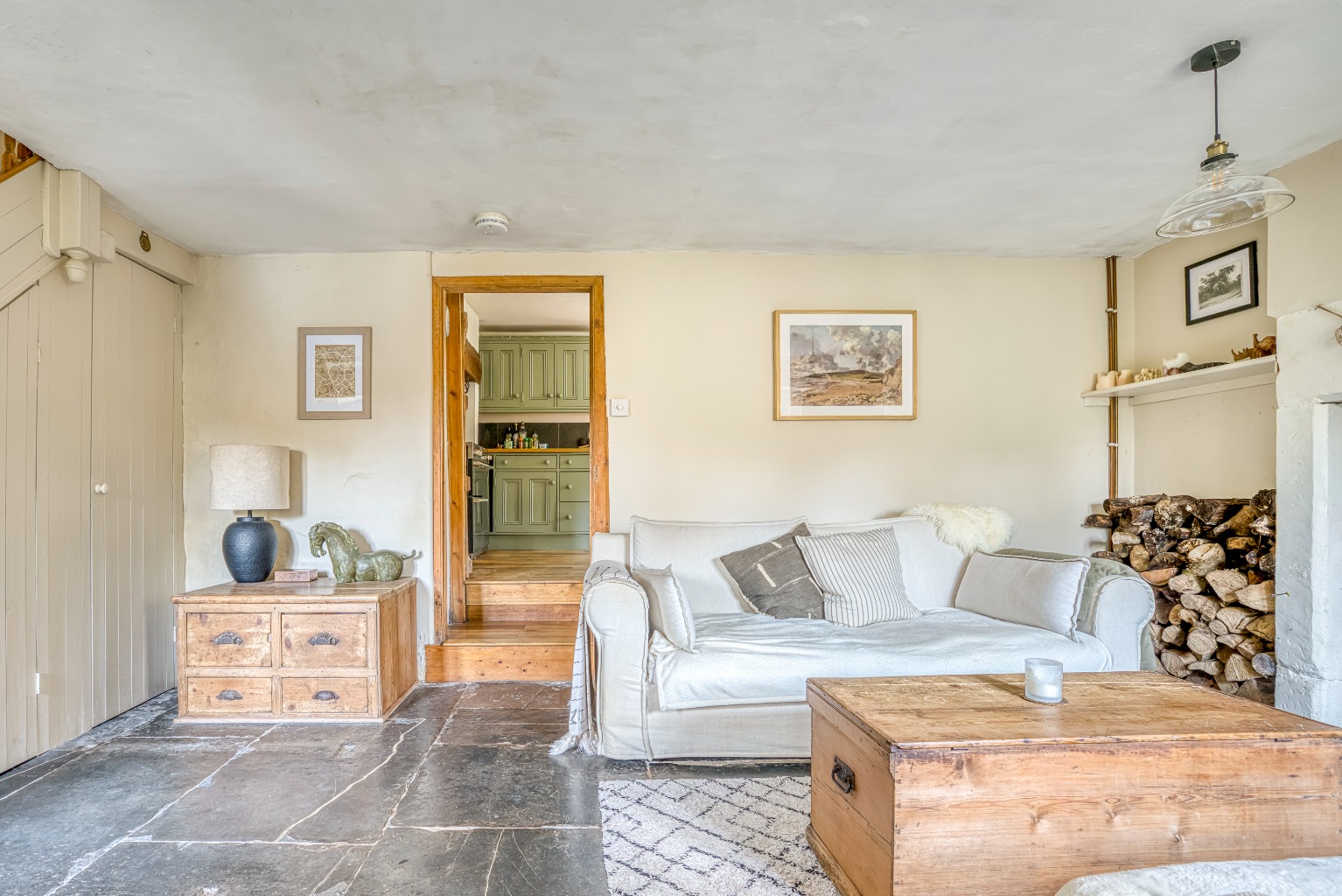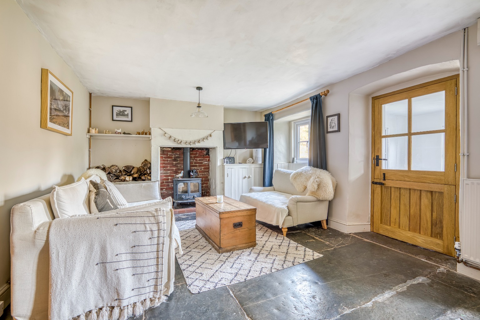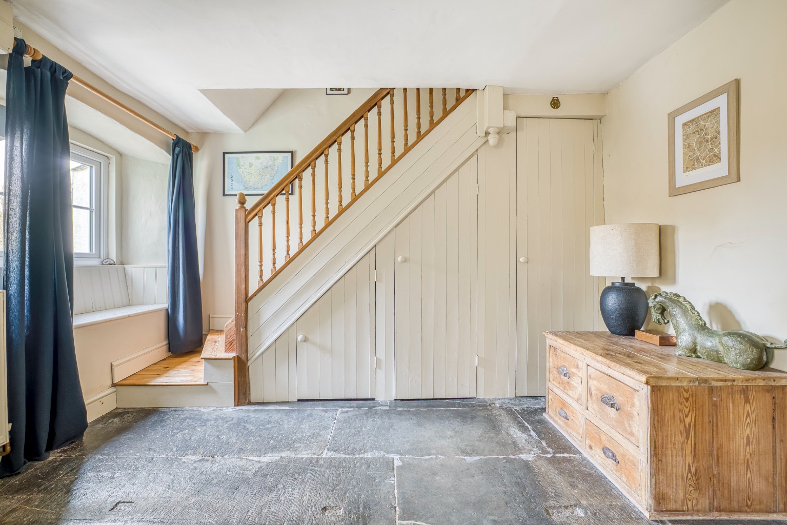 The front door opens into a small porch opening into a snug sitting room with flagstones, wood burner and the staircase to the first floor. (plus understairs cupboard).