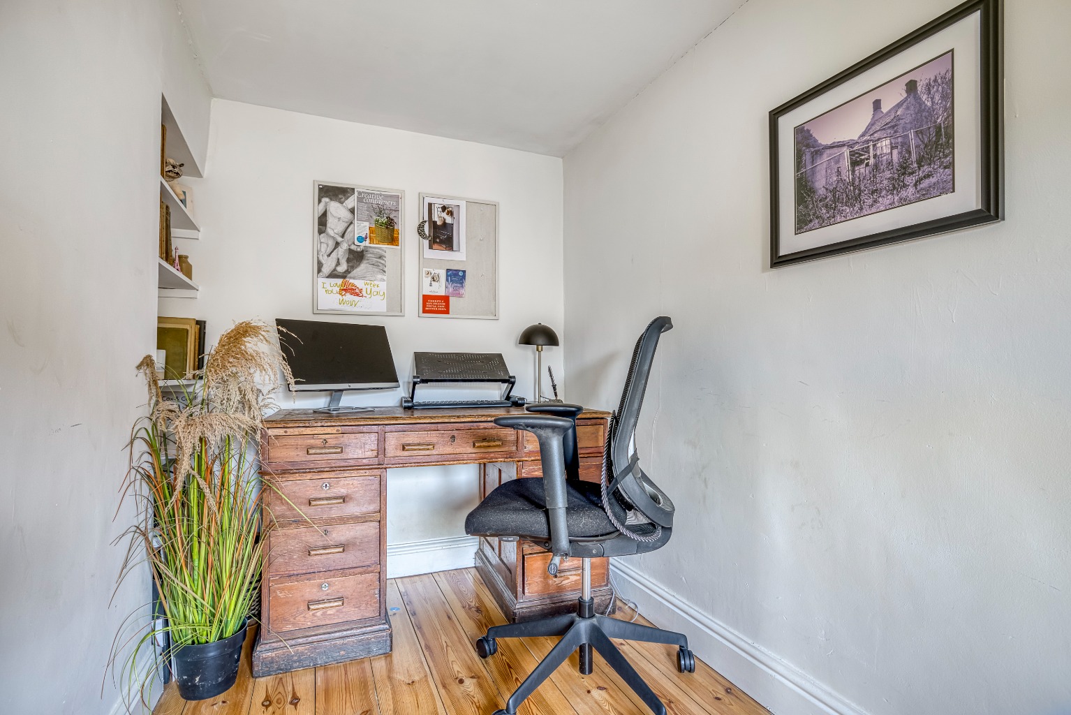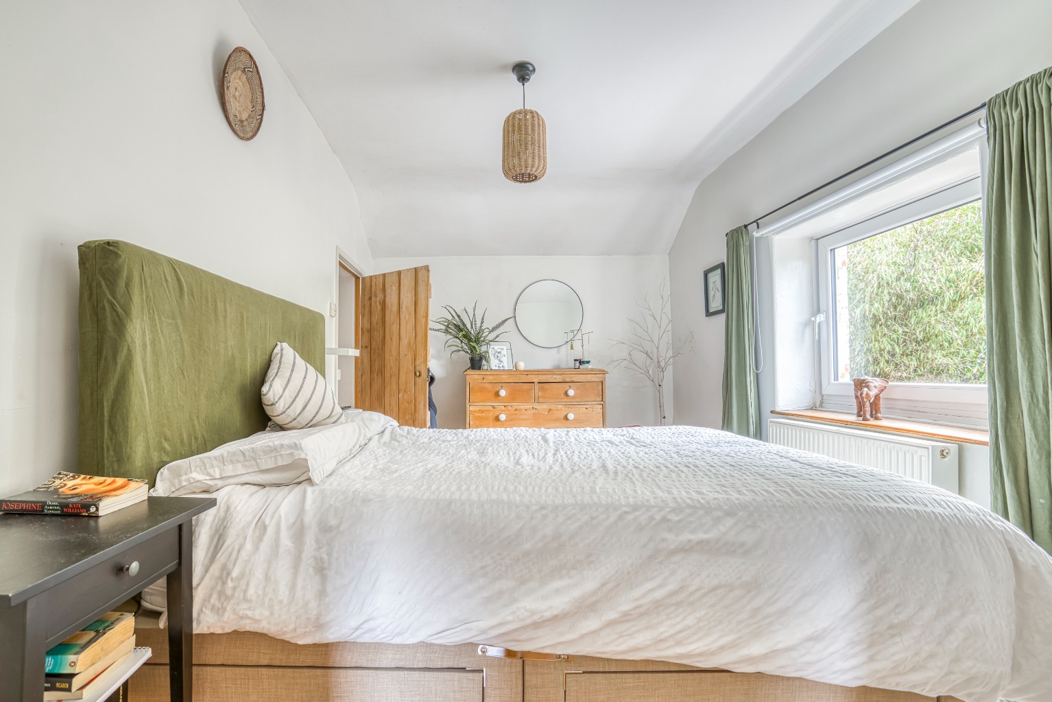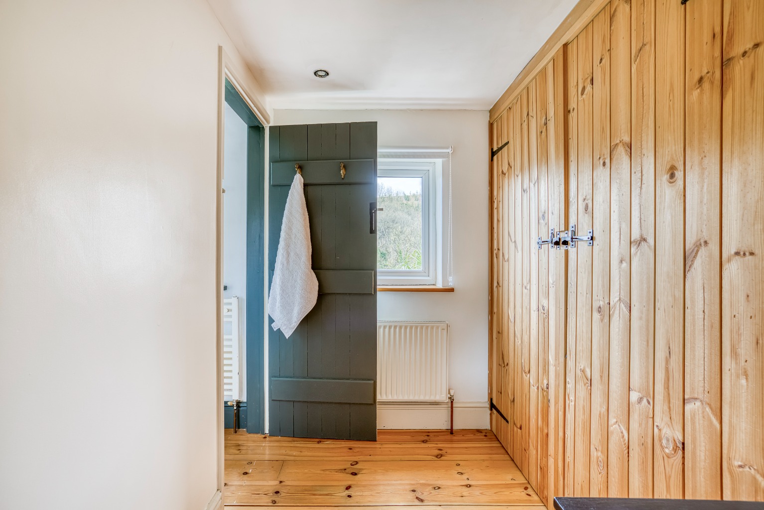 The front door opens into a small porch opening into a snug sitting room with flagstones, wood burner and the staircase to the first floor. (plus understairs cupboard).