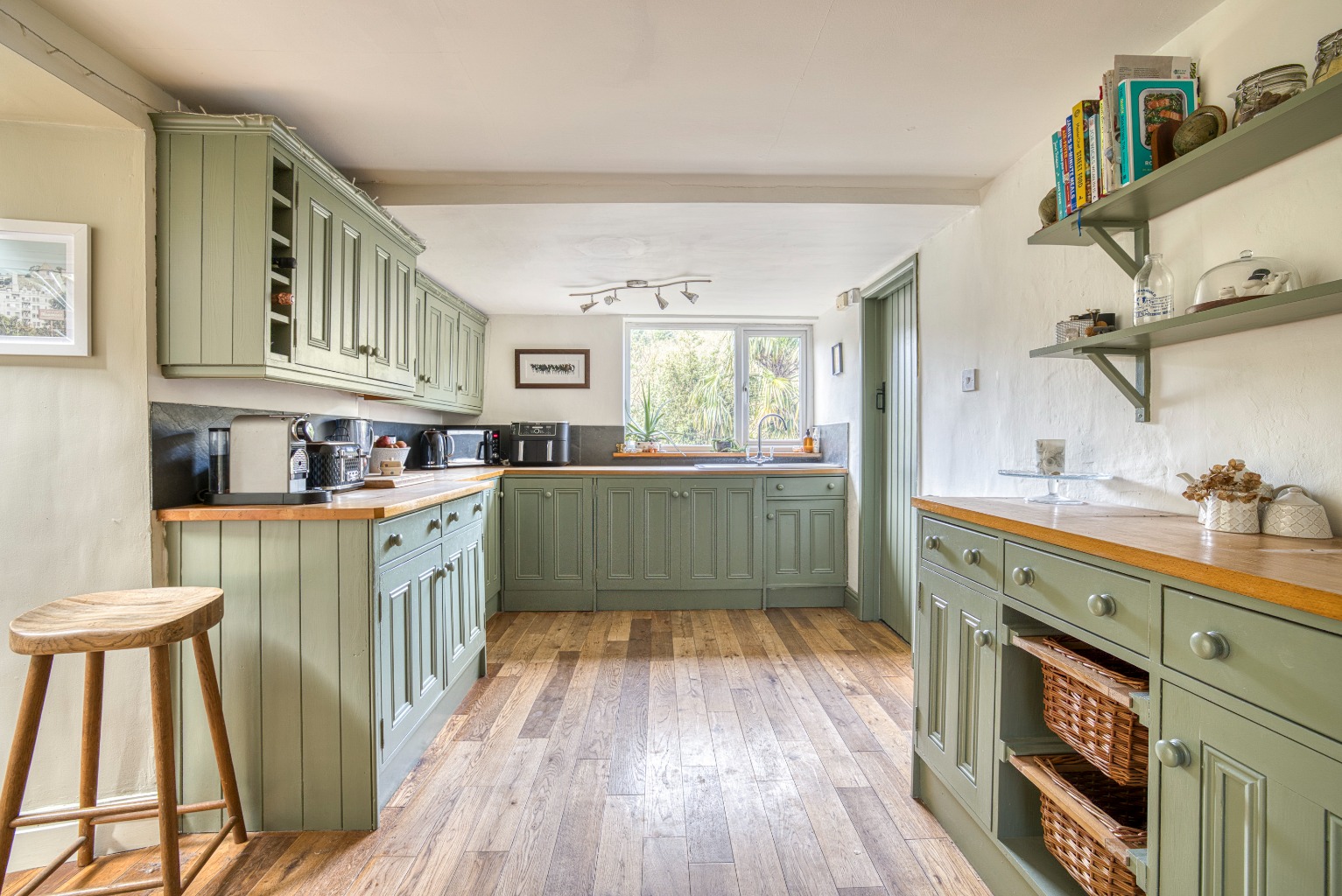 Steps and a pine door lead into the kitchen. This has an excellent range of fitted floor and wall units, timber work surfaces, tiled cooker alcove and appliances available by negotiation.