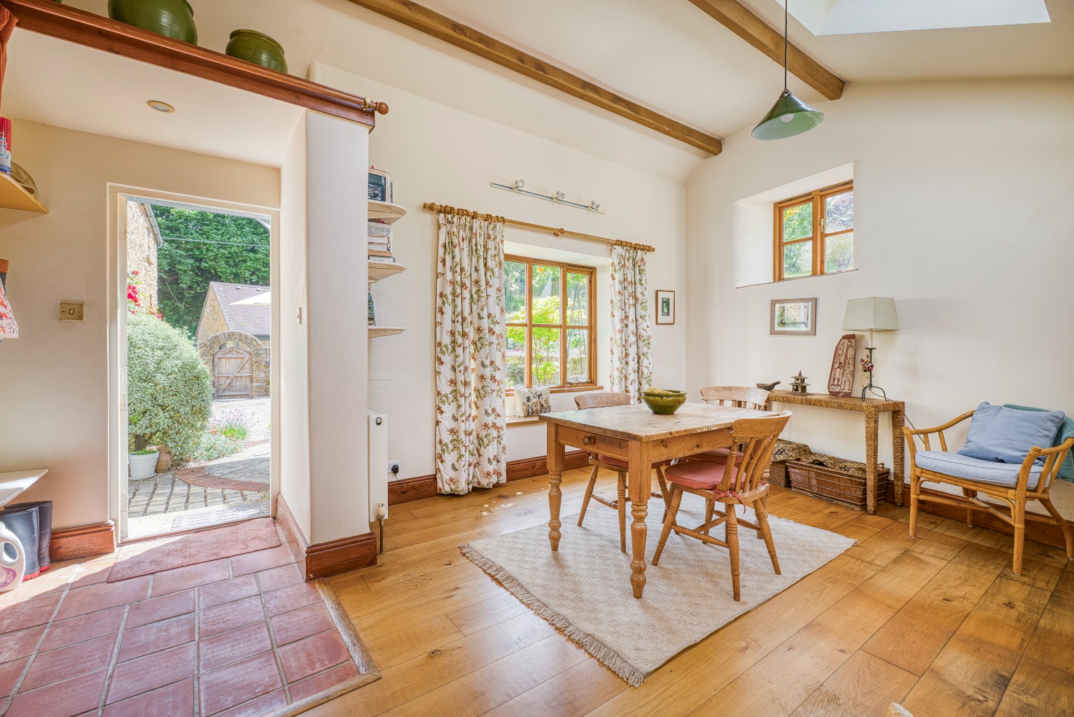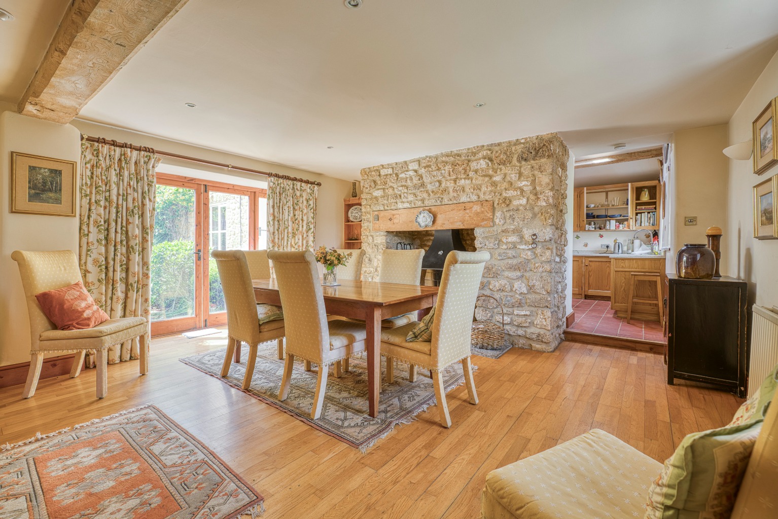 The property is entered through the imposing studded oak front door, which sets the tone for the character and atmosphere within. The reception hall has a two useful cupboards, and wooden floorboards which lead through into the dining room adjacent. Here there are French doors leading out to the sunny terrace at the rear of the property, and internally there is a wonderful fireplace with exposed stone chimney breast, and inset Jetmaster fire.