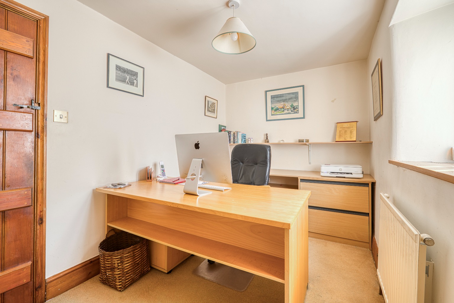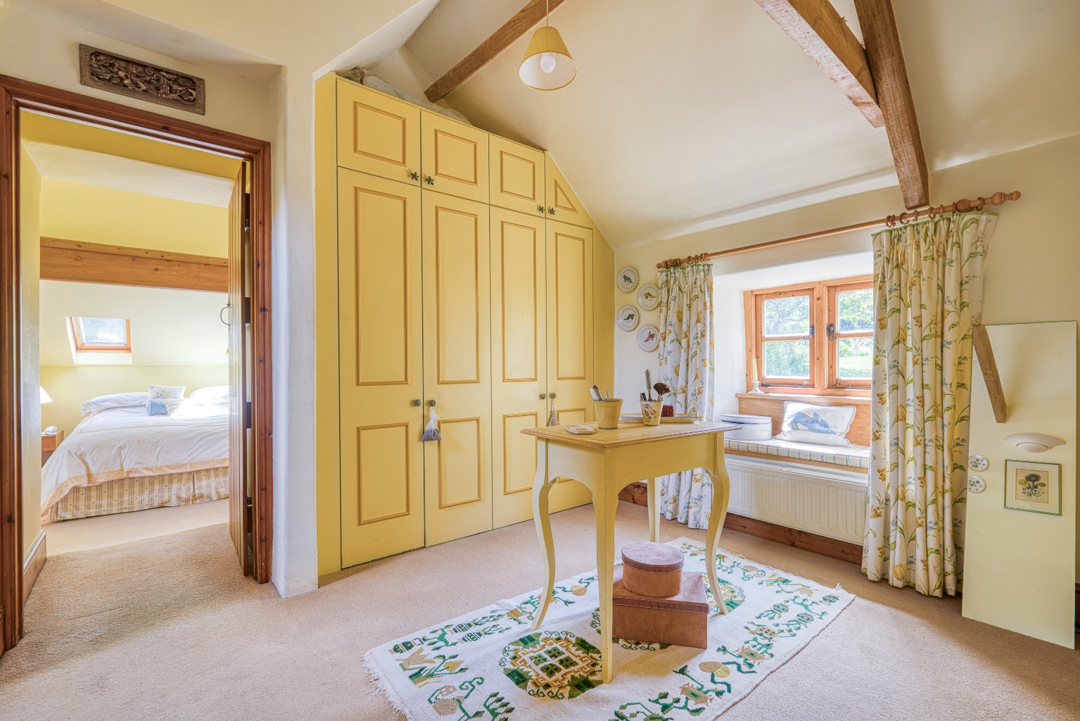 In a semi-open plan style, the kitchen sits between the dining and breakfast rooms, and has plenty of storage within solid oak cabinetry, with a gas range cooker and dishwasher set within the units. The room has a lovely feeling of space due to the vaulted ceiling where the Velux windows allow light to flood in. Further features include the exposed beams, the clay tile floor, and the delightful view down the valley from the kitchen sink window. The breakfast room enjoys a dual aspect, and a back door which also leads directly out to the terrace.