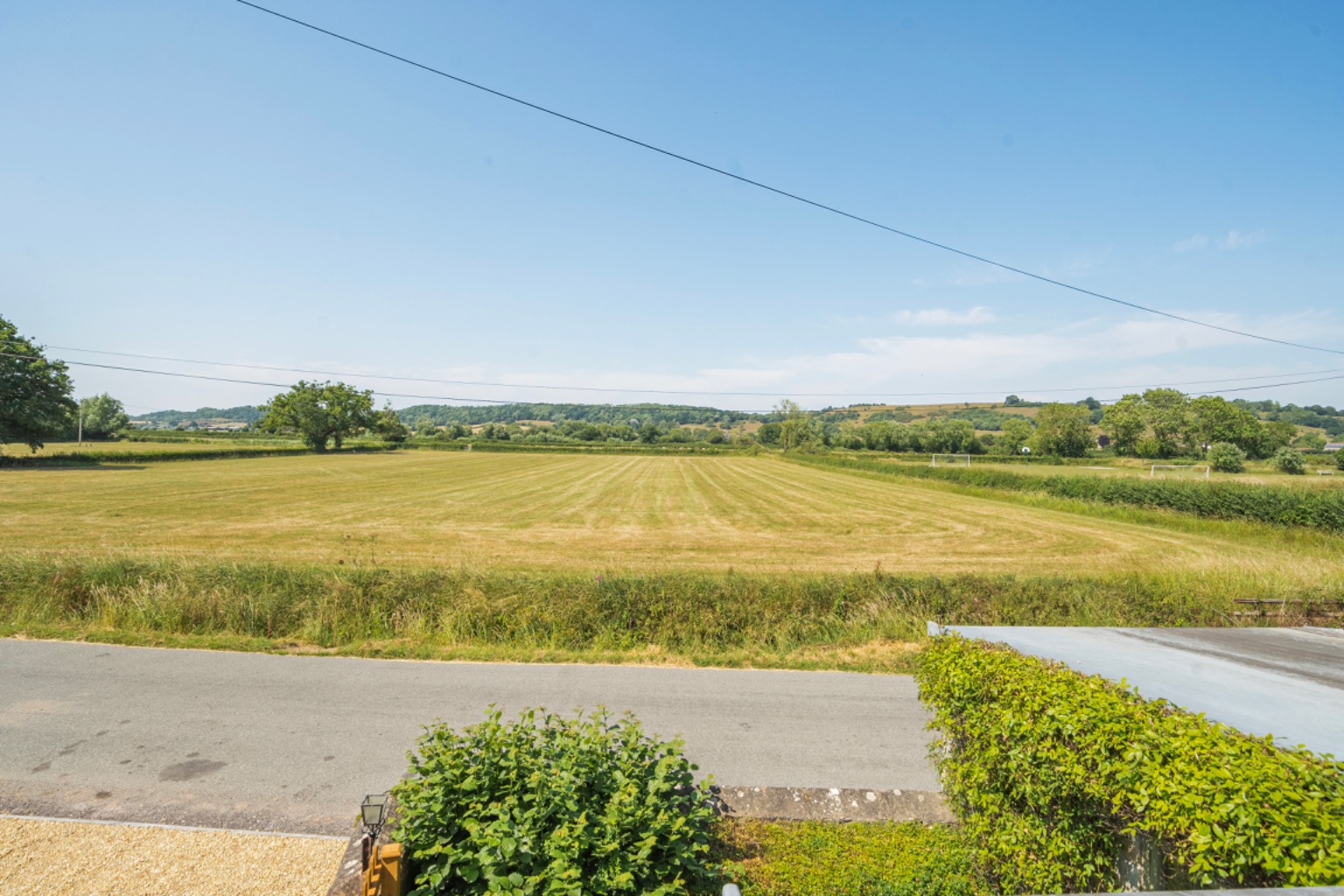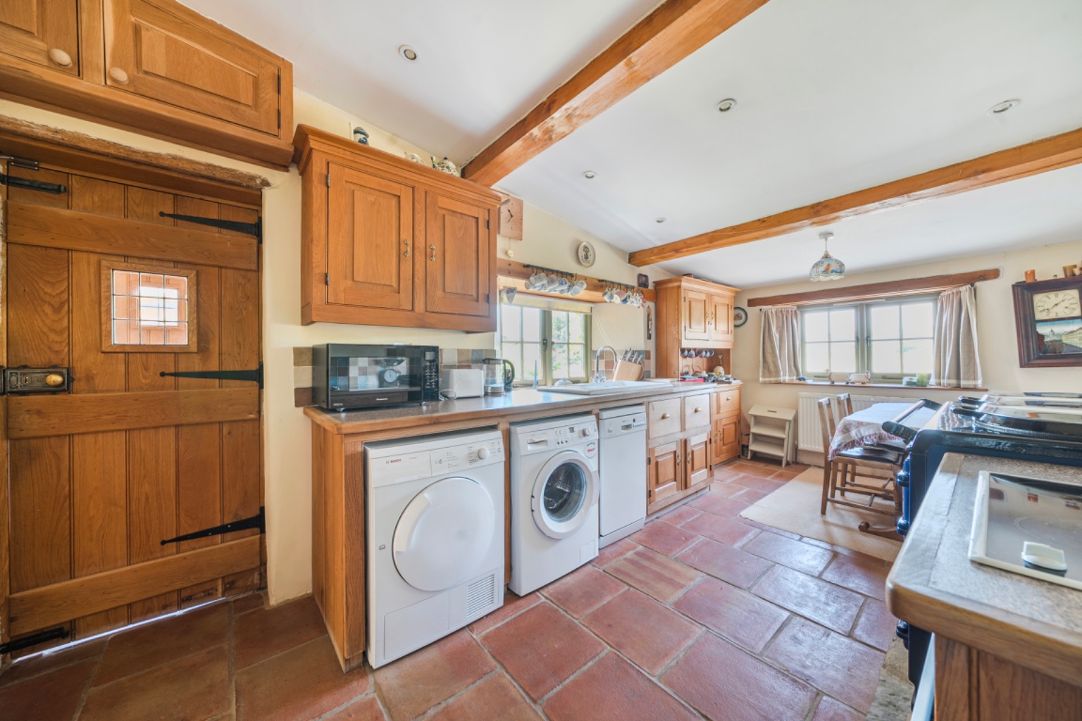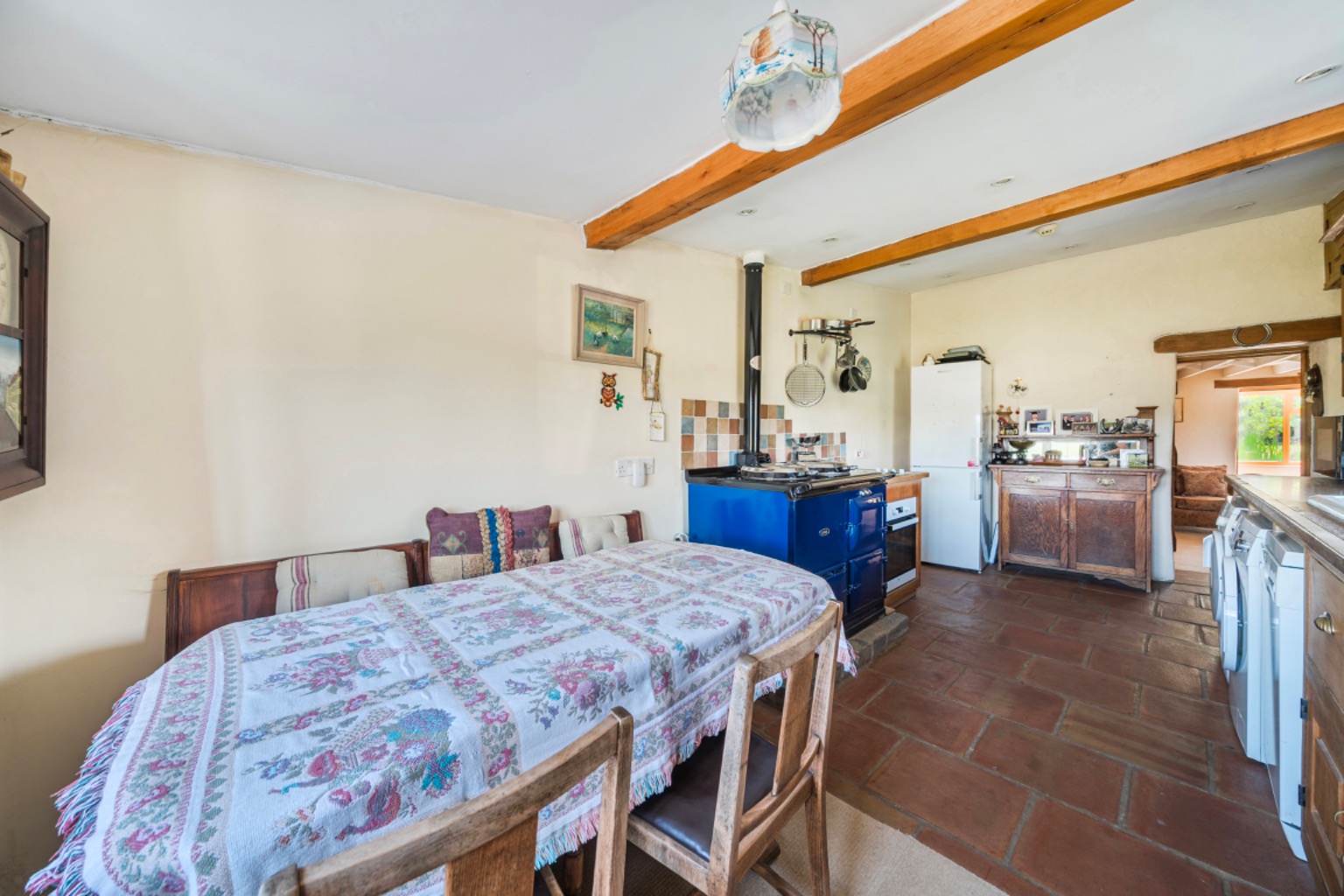 Fitted with a range of farmhouse-style cabinetry and a ceramic sink with mixer tap, the kitchen enjoys stunning, far-reaching views over open countryside. There is an oil-fired AGA, an electric oven and space for a dishwasher and laundry appliances. Exposed beams, tiled flooring and spot lighting complete the space.