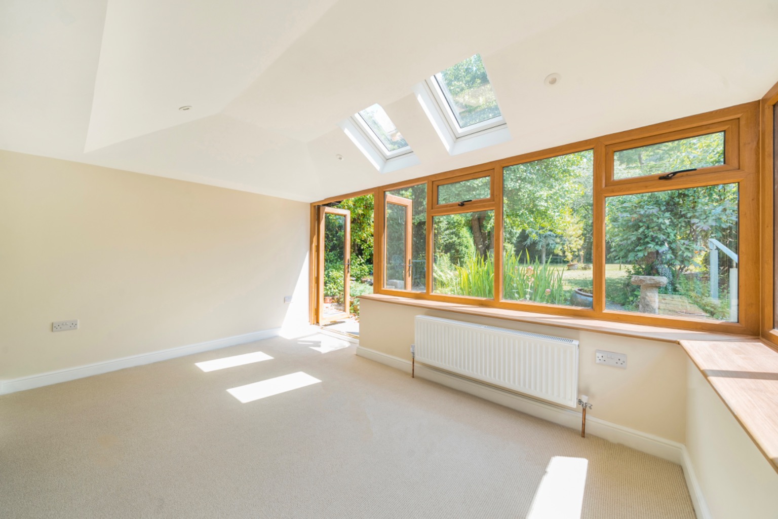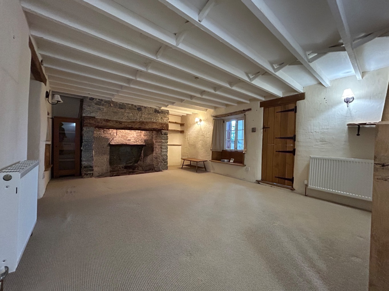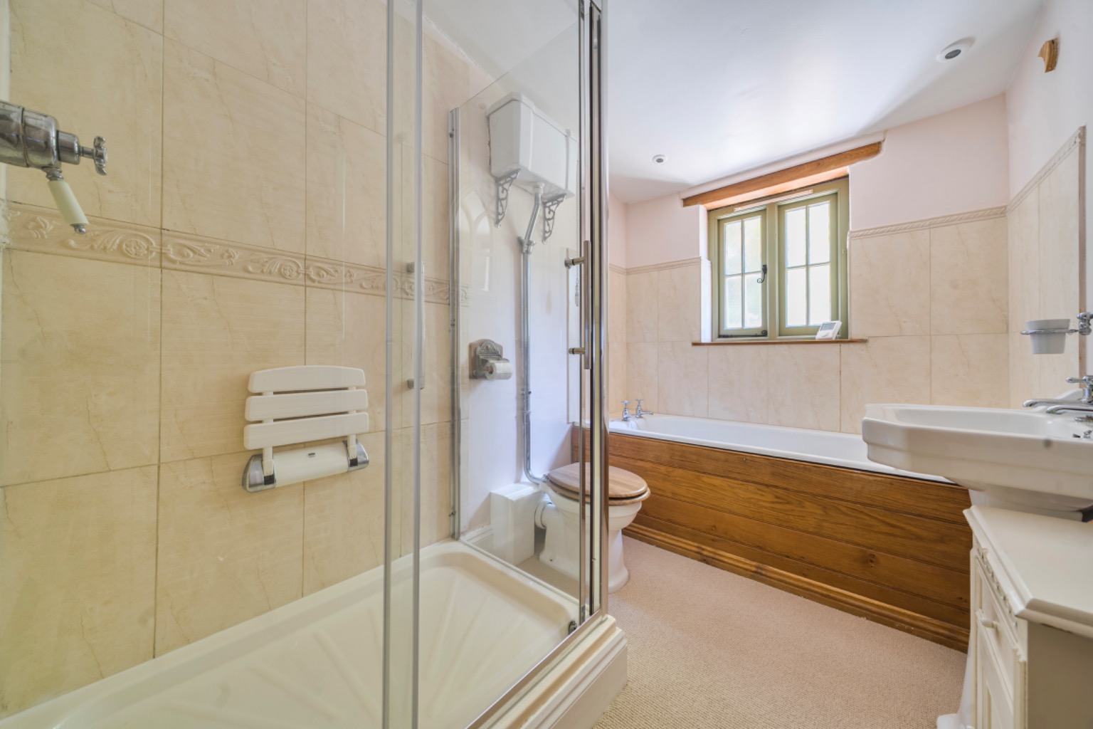 Fitted with a range of farmhouse-style cabinetry and a ceramic sink with mixer tap, the kitchen enjoys stunning, far-reaching views over open countryside. There is an oil-fired AGA, an electric oven and space for a dishwasher and laundry appliances. Exposed beams, tiled flooring and spot lighting complete the space.