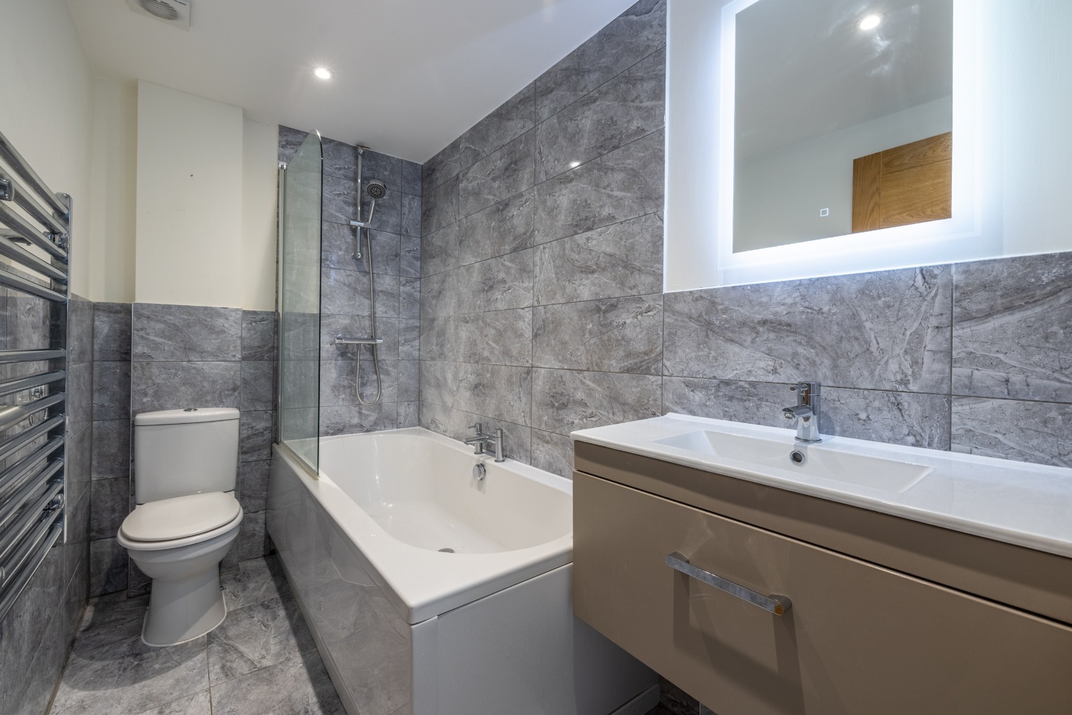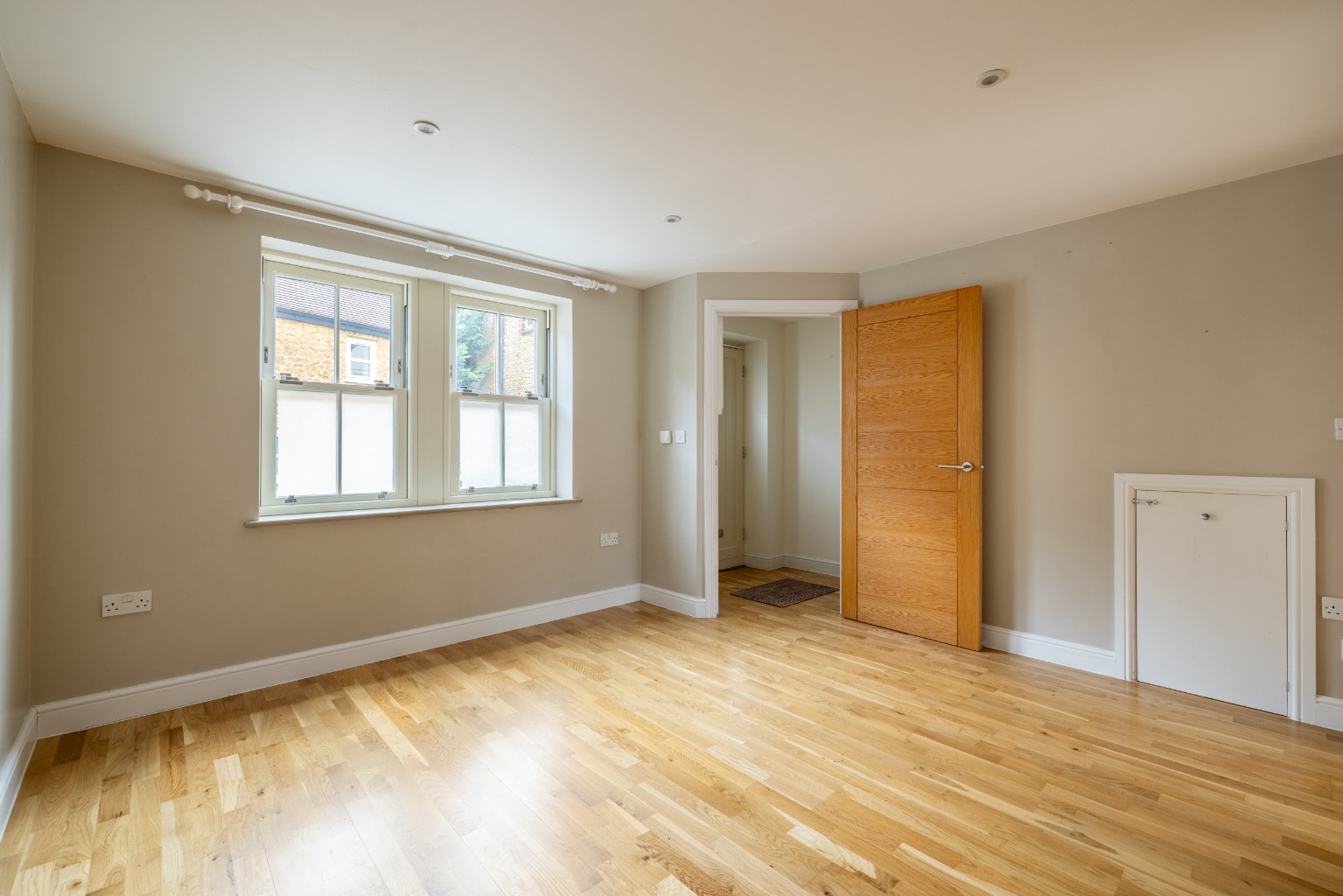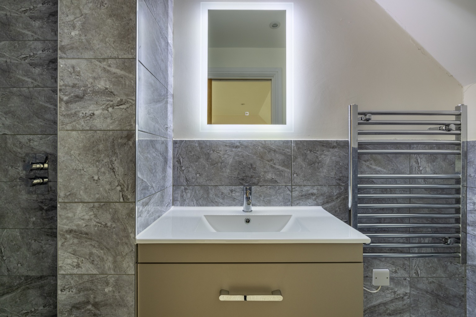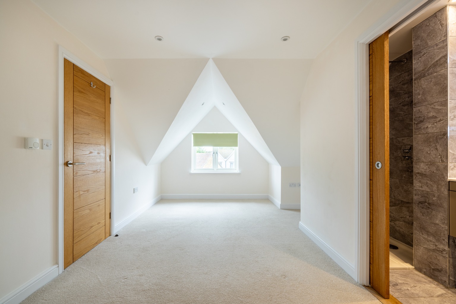 The top floor is occupied by the superb master suite. In addition to the substantial double bedroom, there is a modern en-suite with a shower, a heated towel rail, a vanity unit with storage, an illuminated mirror and a w/c. Under the eaves, there is plenty of storage available.