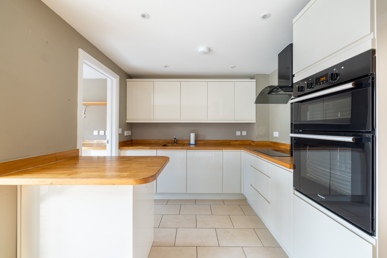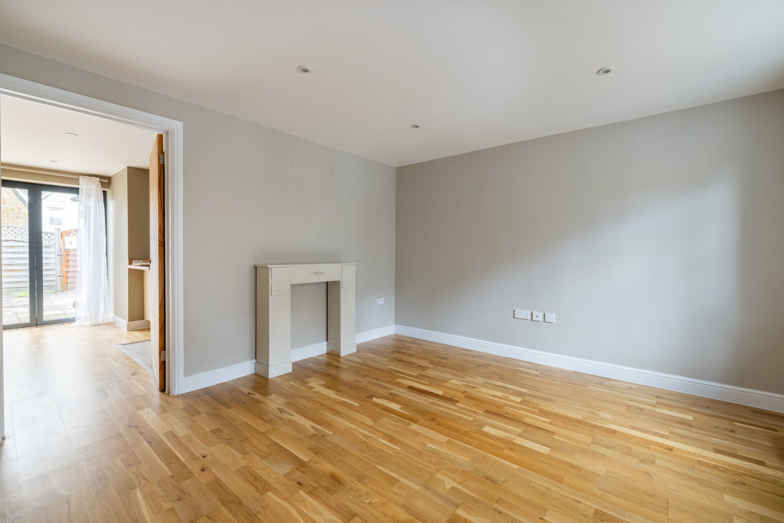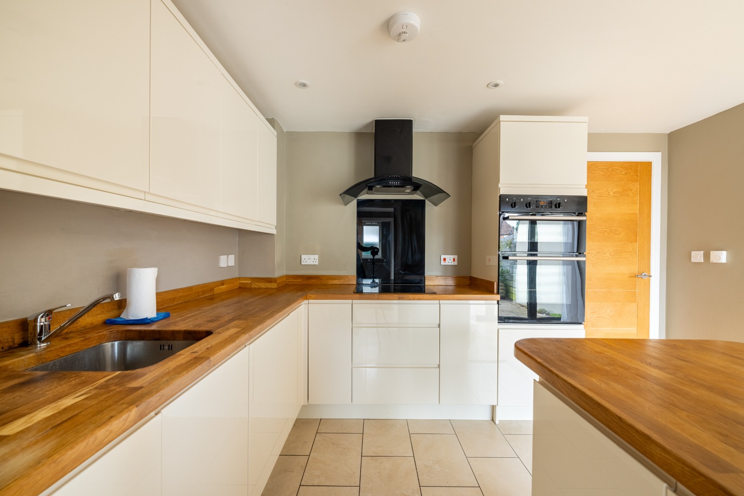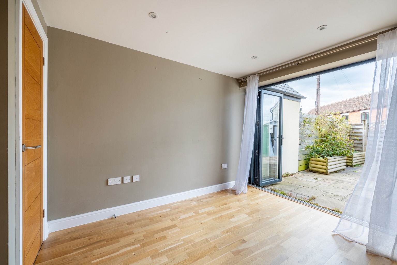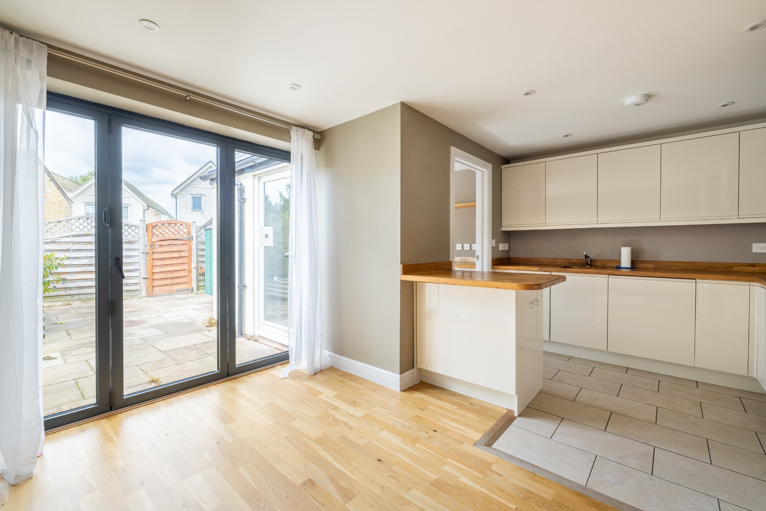 The sitting room at the front of the house is well proportioned and has a feature fireplace with an electric wood burning effect stove. Through a doorway is the kitchen and dining room, which is possibly where the quality of this house is most apparent. There is an excellent selection of sleek high gloss cupboards set into hardwood worktops, as well as a breakfast bar and integral appliances including an electric cooker, induction hob and dishwasher. There is plenty of room for a dining table in front of the bi-folding doors which open out to the sunny courtyard garden.