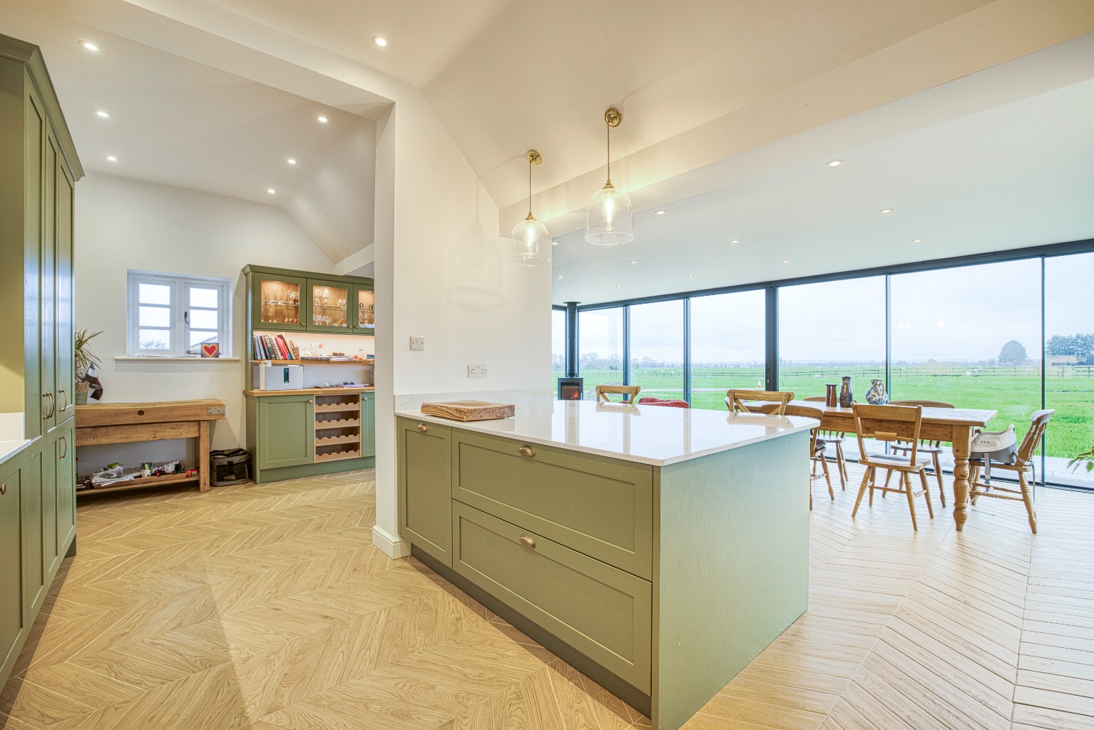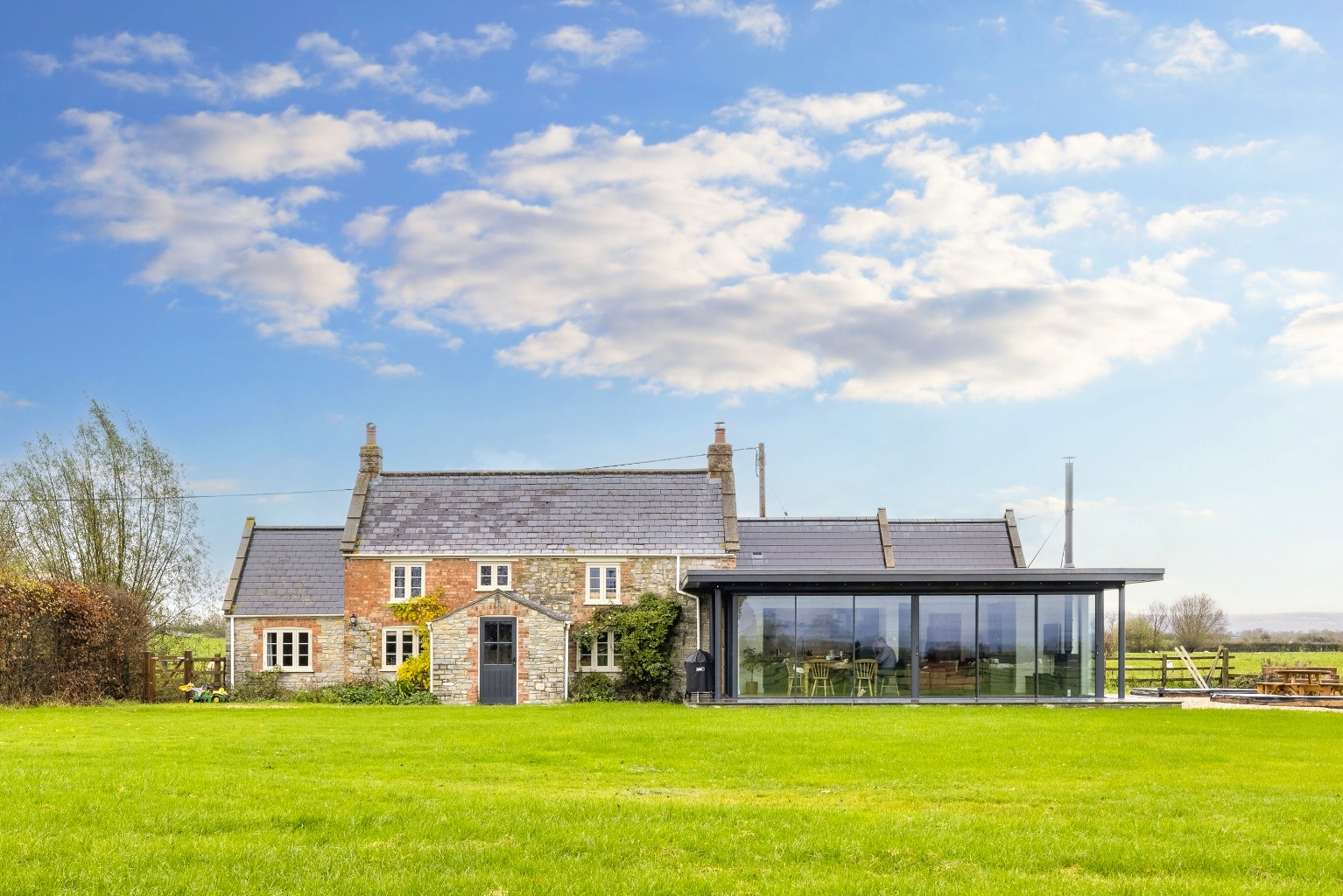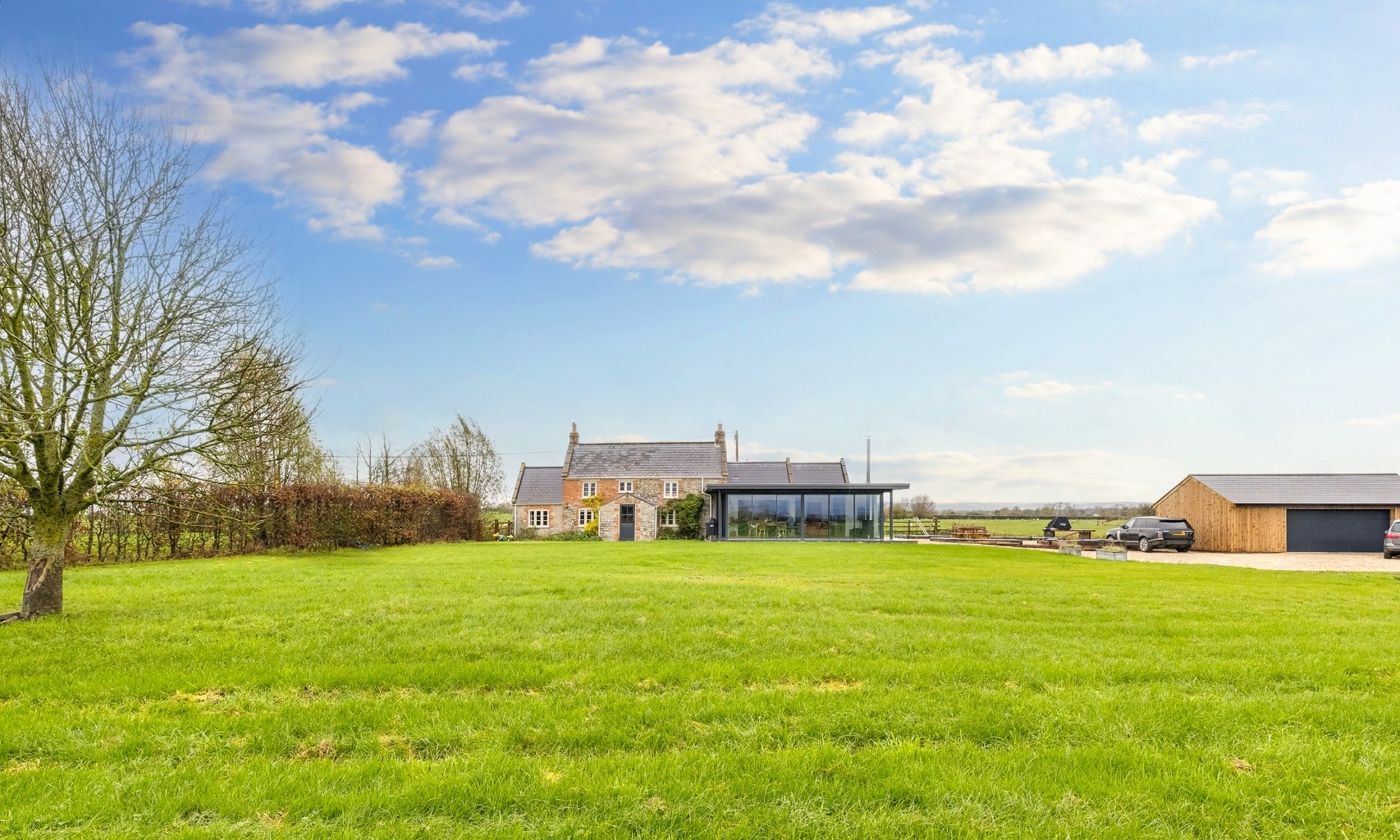 A contemporary extension with state of the art, high specification, glass, frameless, concertina doors which retract with seamless style, open the inside up to the out making the most of the incredible views to the south over pastures to the Polden Hills.