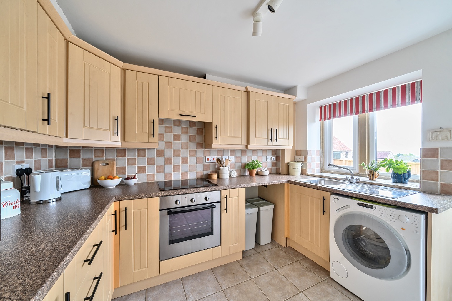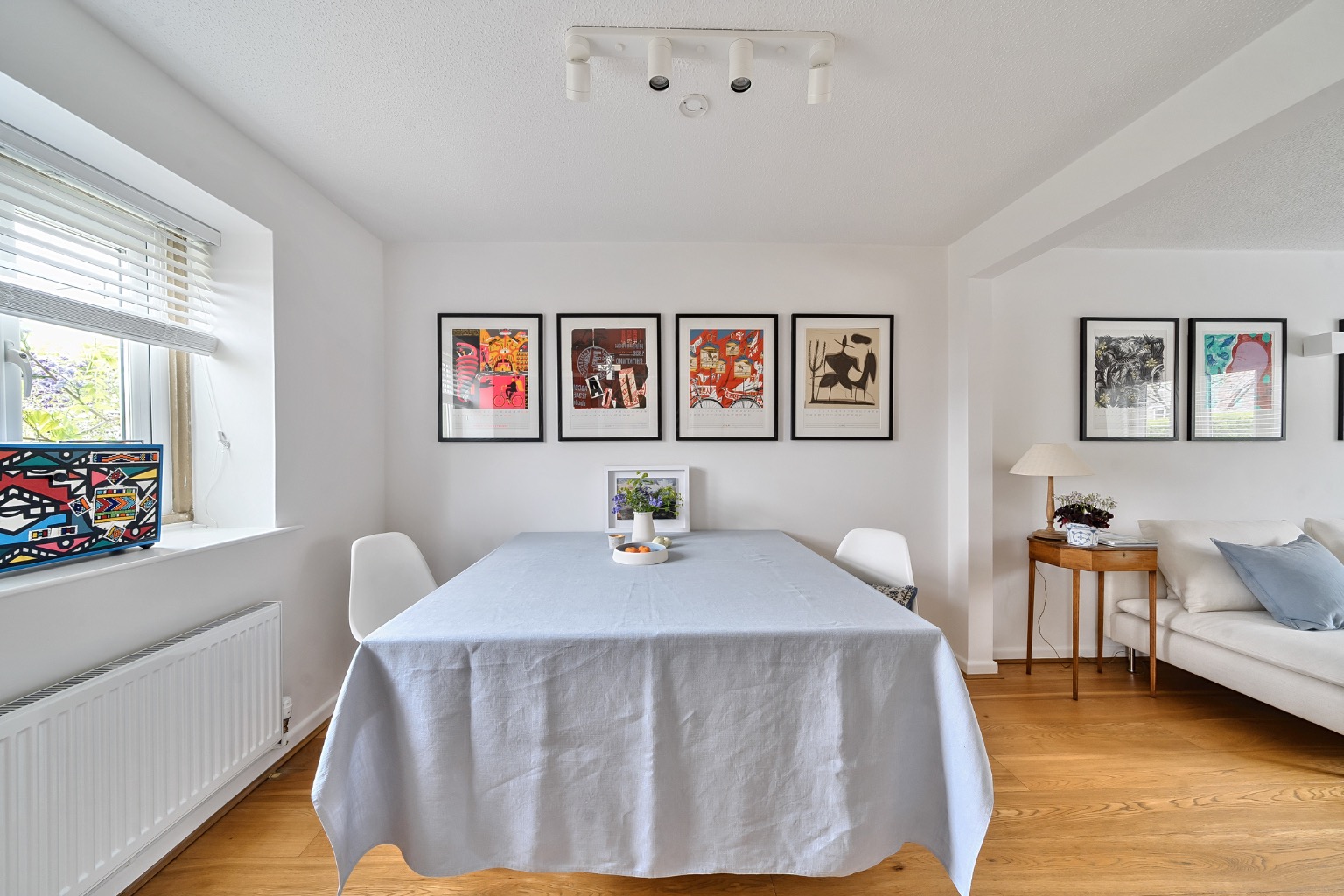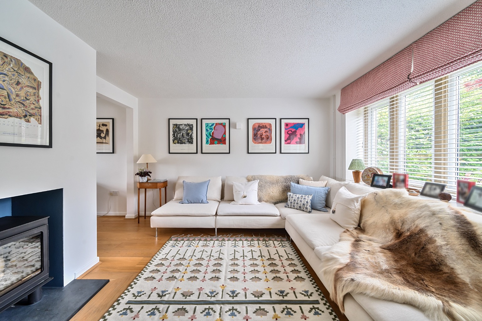 To the right, the spacious sitting room is tastefully decorated with a Scandinavian log burner, and a mullion window overlooking the attractive front garden. There’s also a convenient understairs storage cupboard. From here the engineered oak flooring leads you through to the dining room.