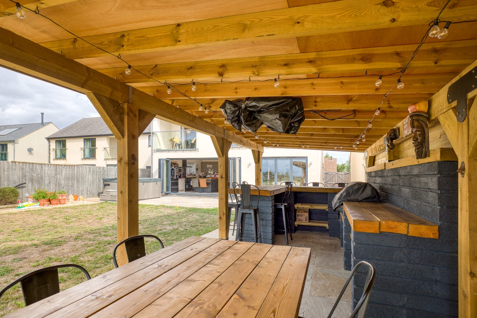 There is ample driveway parking for both properties and an open-bay carport with an adjoining store. To the rear, there is a large south-facing garden which is laid to lawn for ease of maintenance. Within the garden, an oak-framed barn covers an outdoor kitchen with a BBQ area by the paved terrace.