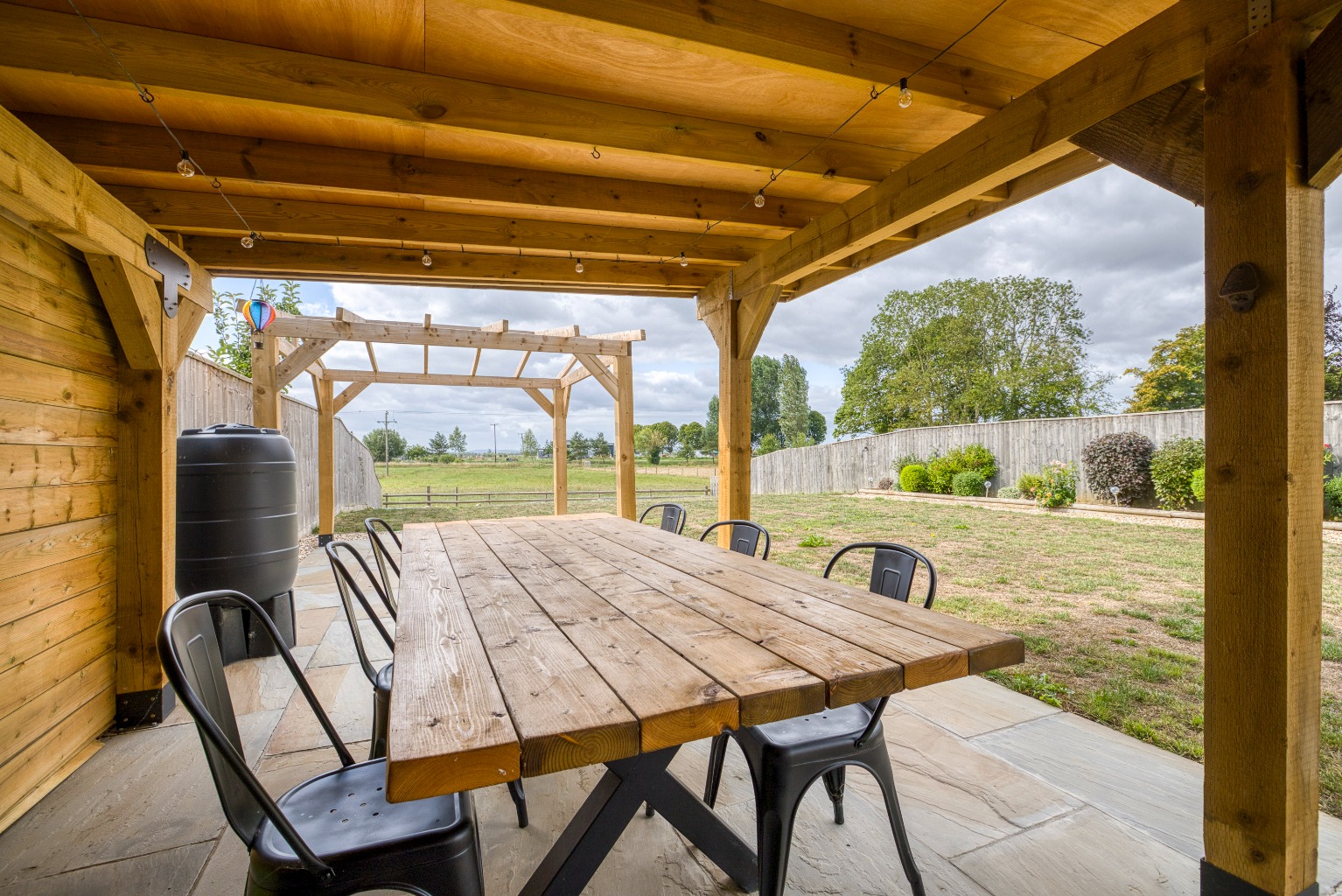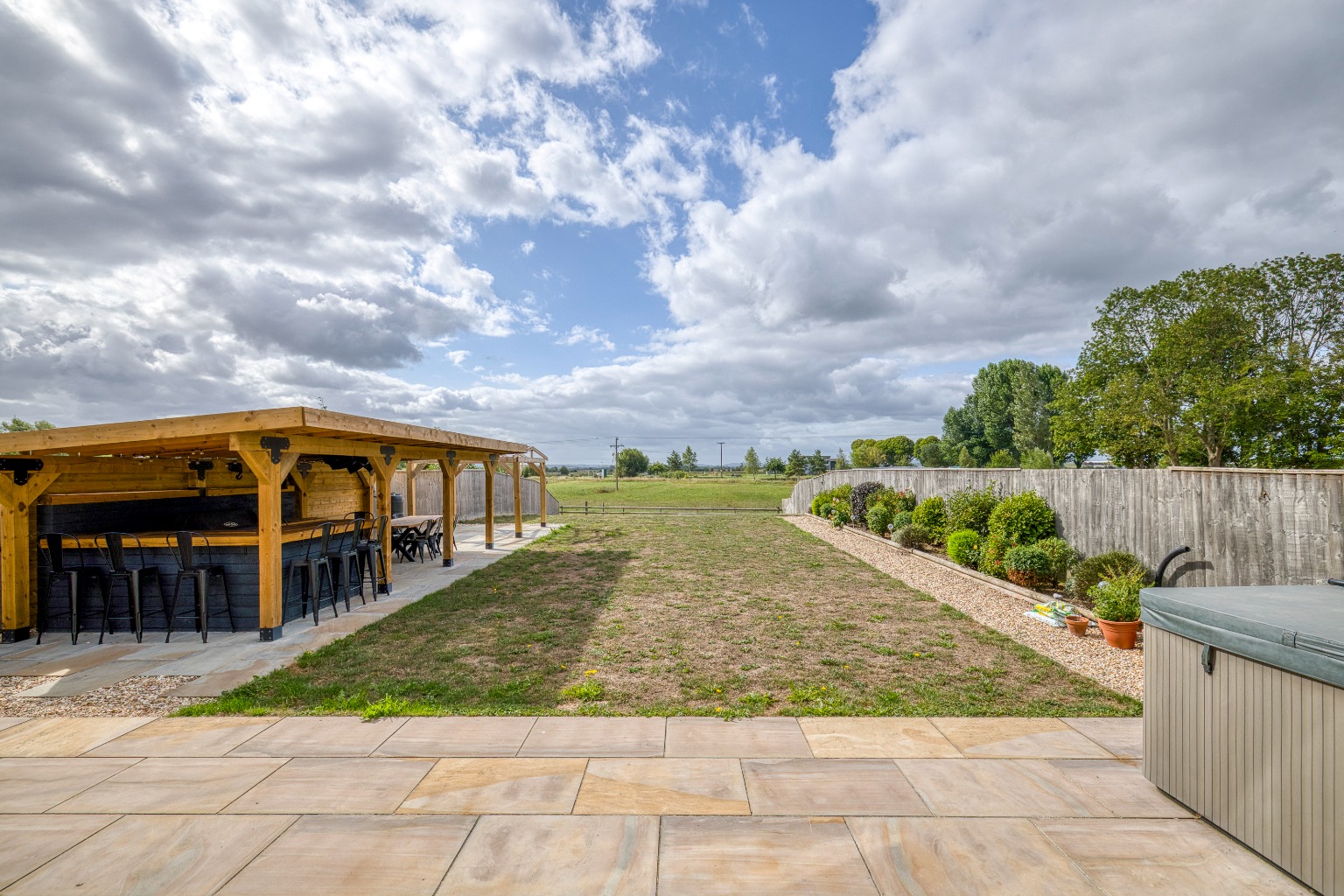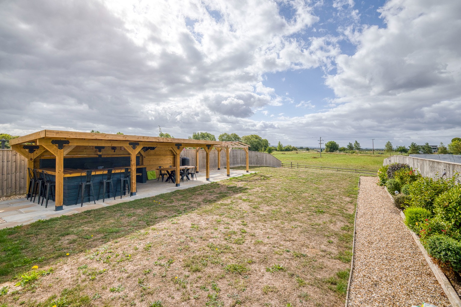 There is ample driveway parking for both properties and an open-bay carport with an adjoining store. To the rear, there is a large south-facing garden which is laid to lawn for ease of maintenance. Within the garden, an oak-framed barn covers an outdoor kitchen with a BBQ area by the paved terrace.