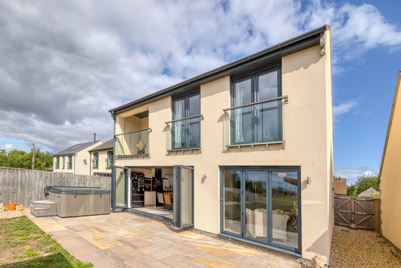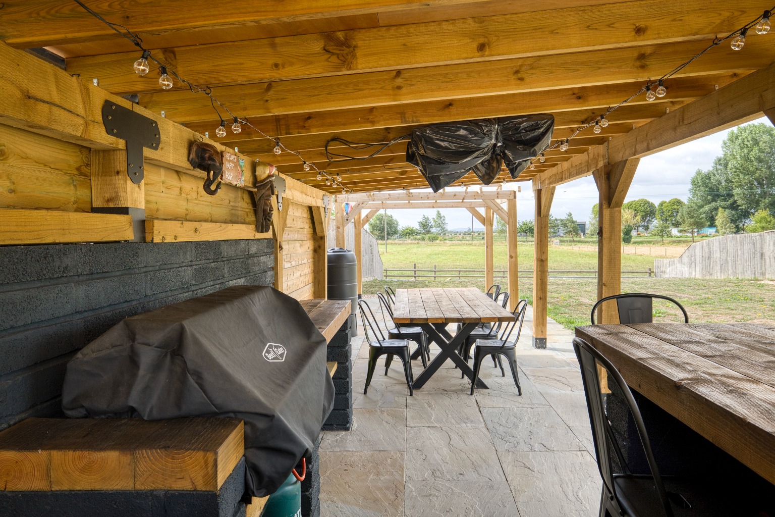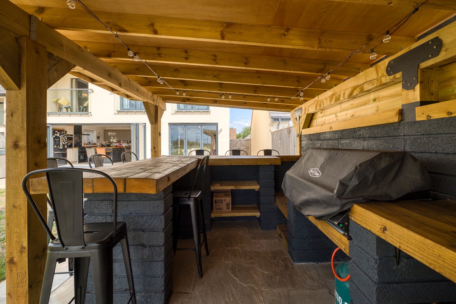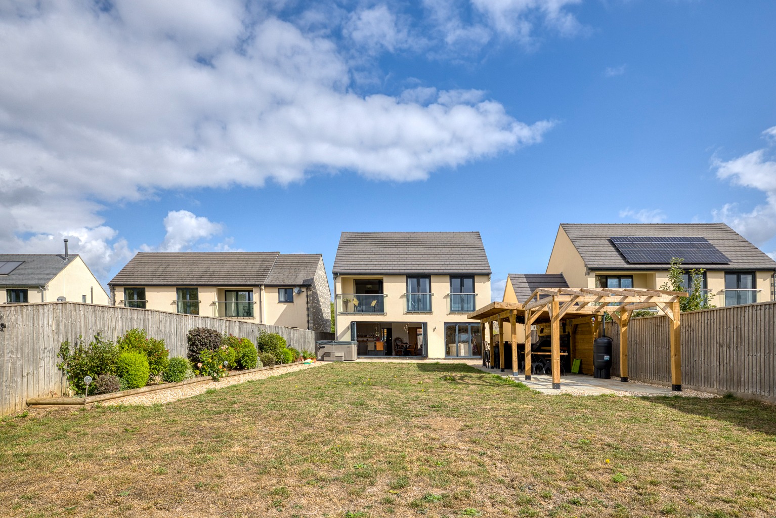 There is ample driveway parking for both properties and an open-bay carport with an adjoining store. To the rear, there is a large south-facing garden which is laid to lawn for ease of maintenance. Within the garden, an oak-framed barn covers an outdoor kitchen with a BBQ area by the paved terrace.