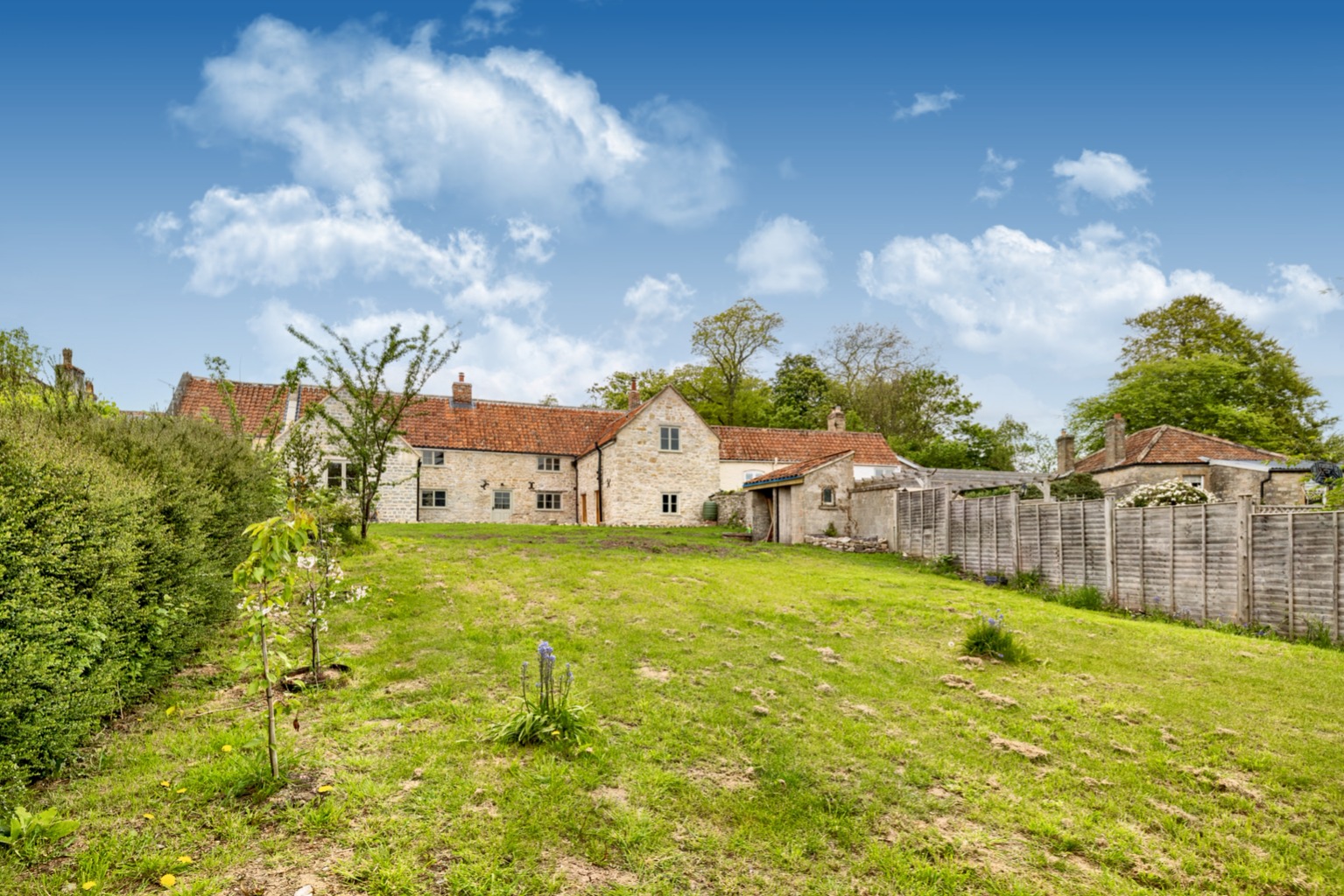 Large sunny courtyard and lawned garden.
