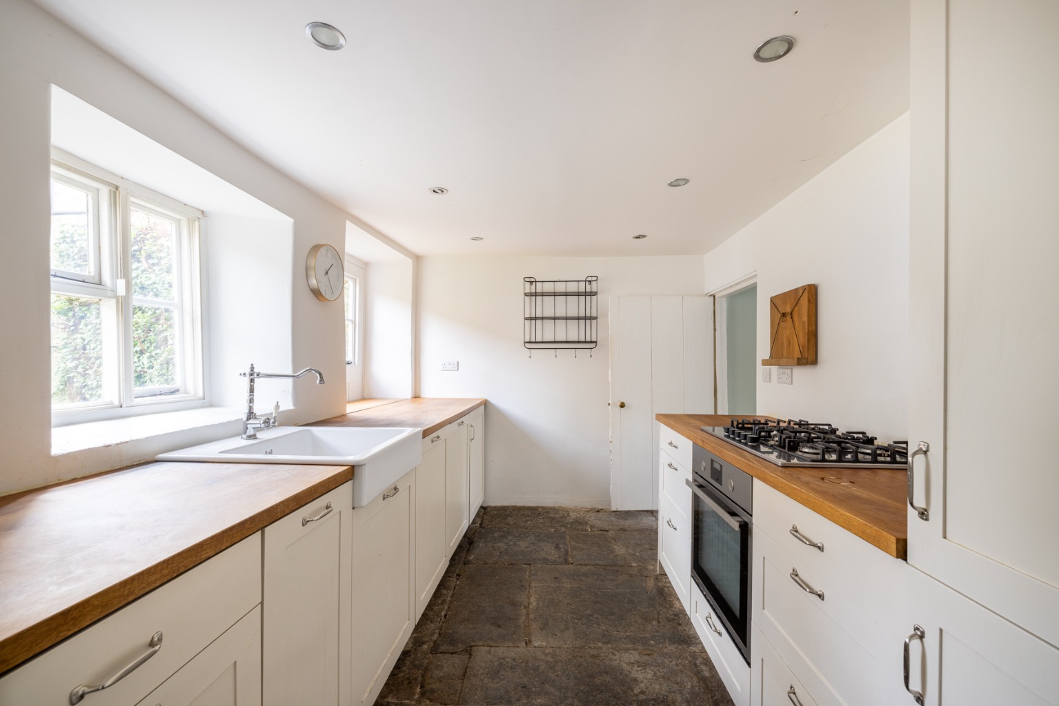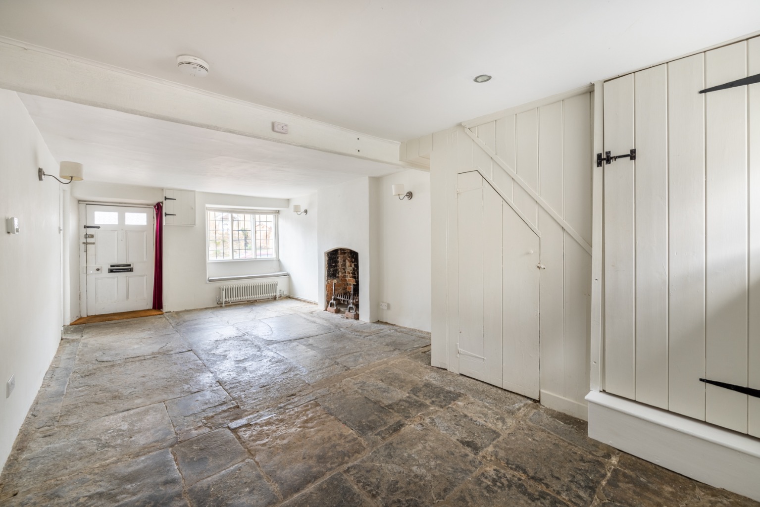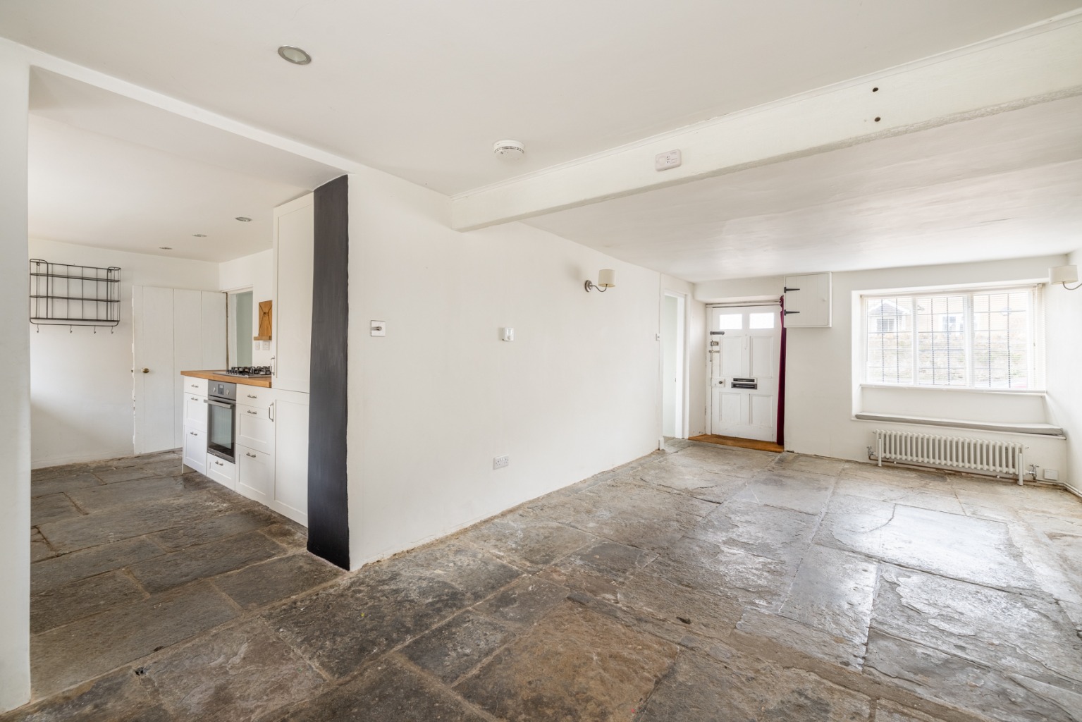 The front door enters the sitting room which spans the entire depth of the property having an aspect to both directions. At the rear is a door out to the garden. In the heart of the room is an open fireplace and there are further character features including a window seat to the front and flagstone floors which can be found throughout the entire ground floor.