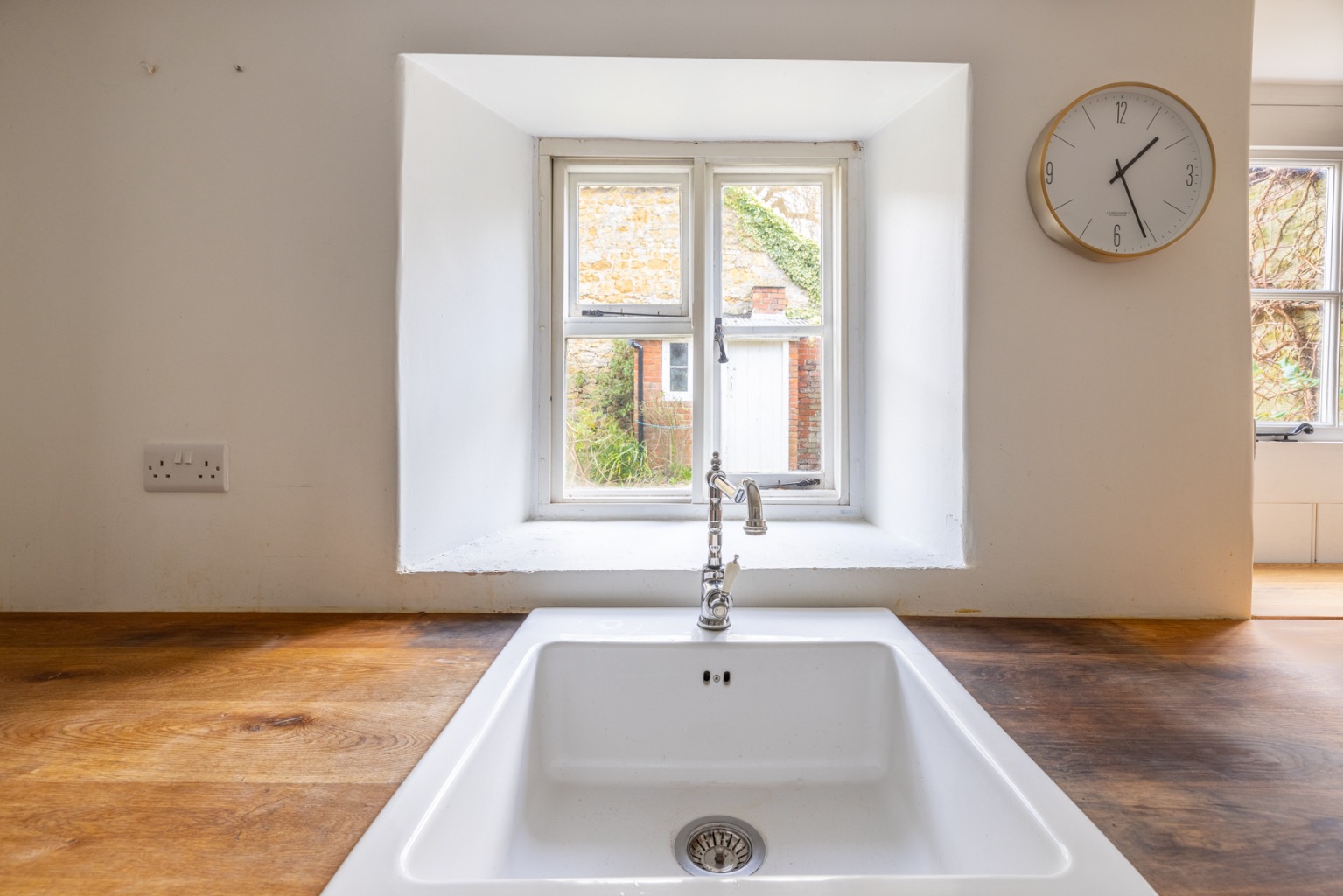 In a semi-open-plan style, the sitting room connects to the kitchen where there are modern fitted units with wooden work surfaces and integral appliances, including an oven with a gas hob above. The beautiful, large ceramic sink with a mixer tap looks out over the garden at the rear.