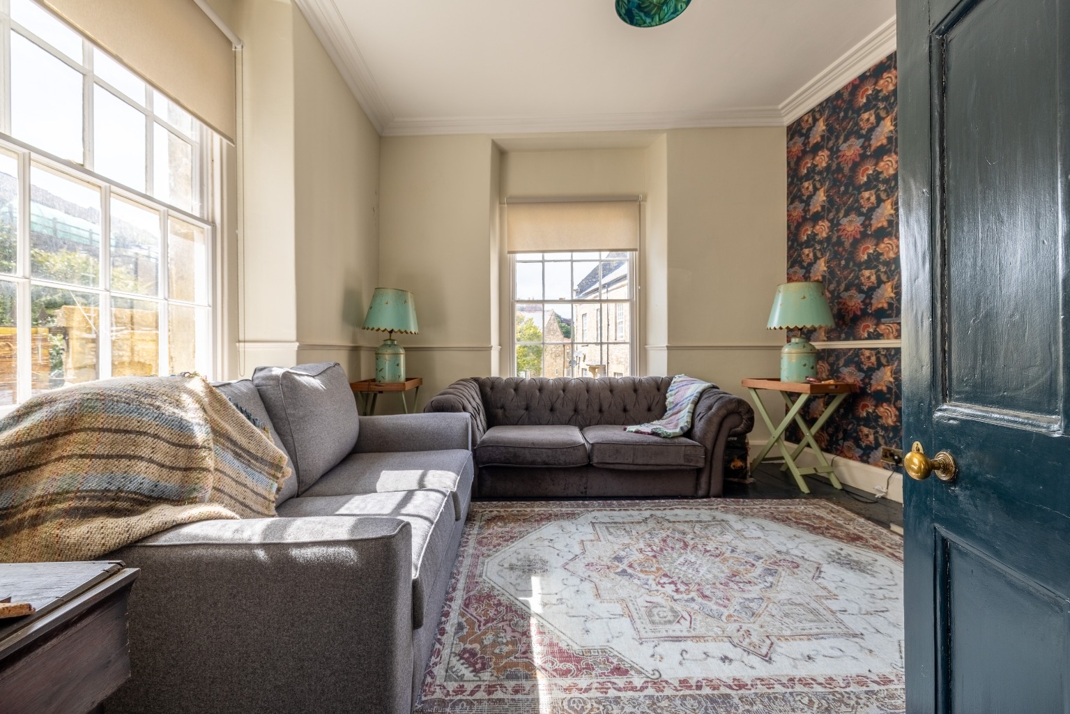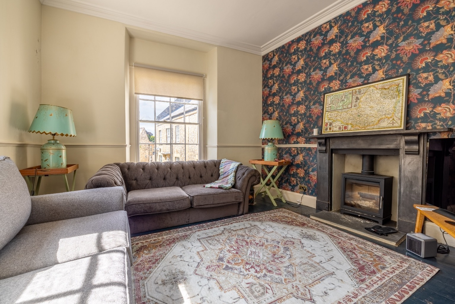 Adjoining the reception is a cosy lounge which is dual aspect and has a feature fireplace with fitted burner and also has further exposed timber flooring.