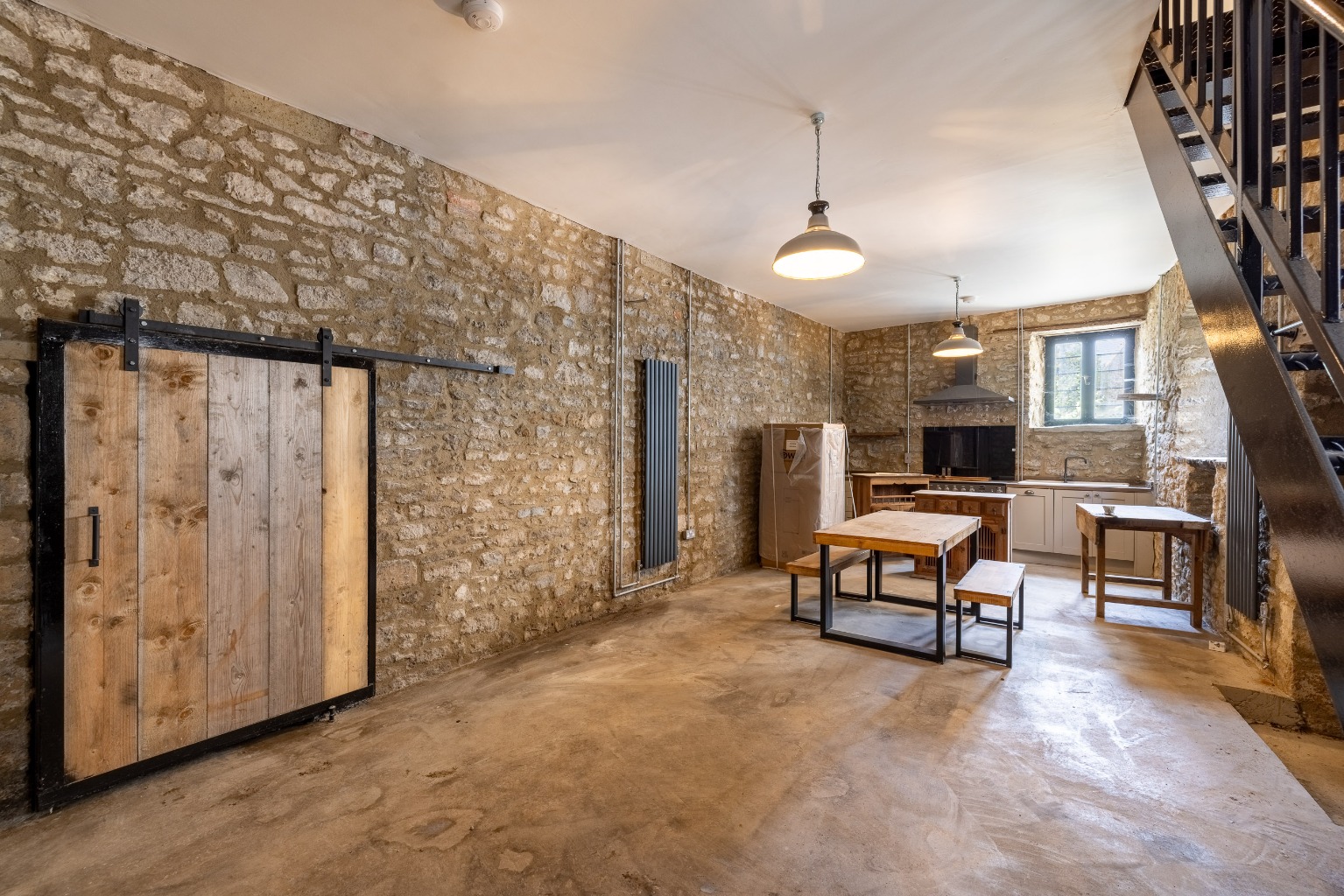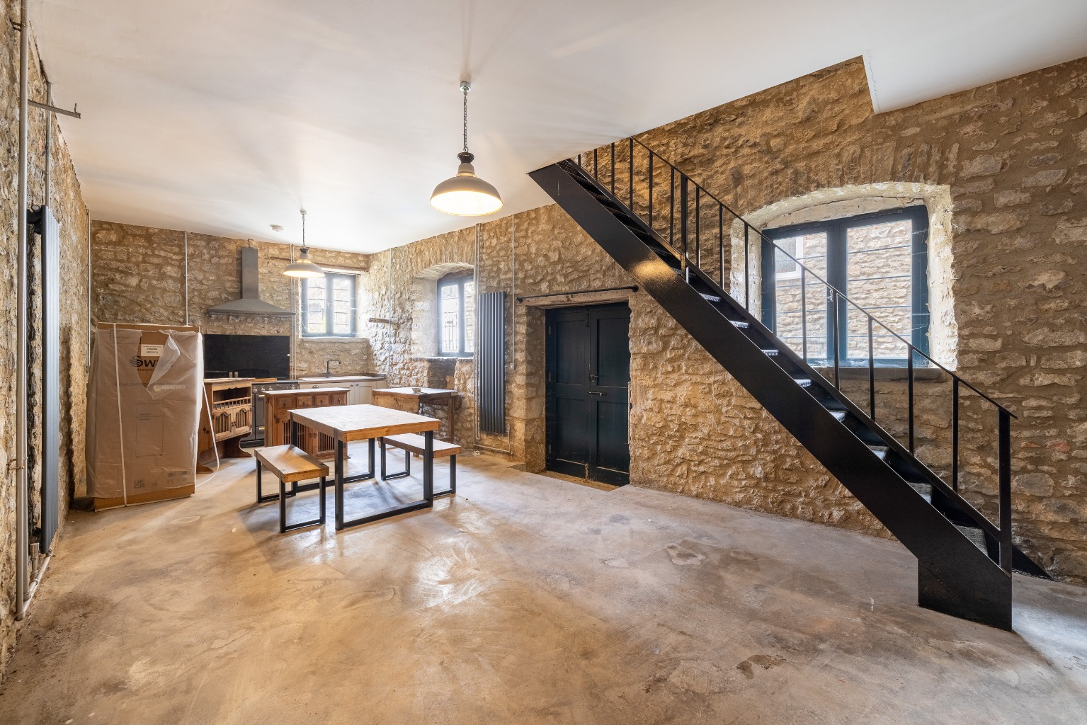 There is an iron staircase then from ground floor into the sub level living, which boasts wonderful exposed stone walls and 28ft of open accommodation. There is an focal feature fireplace, fitted sink inset into the worktop, cooker with extractor hood over and attractive wall high radiators. The room enjoys lots of natural light and could work for adaptable living.