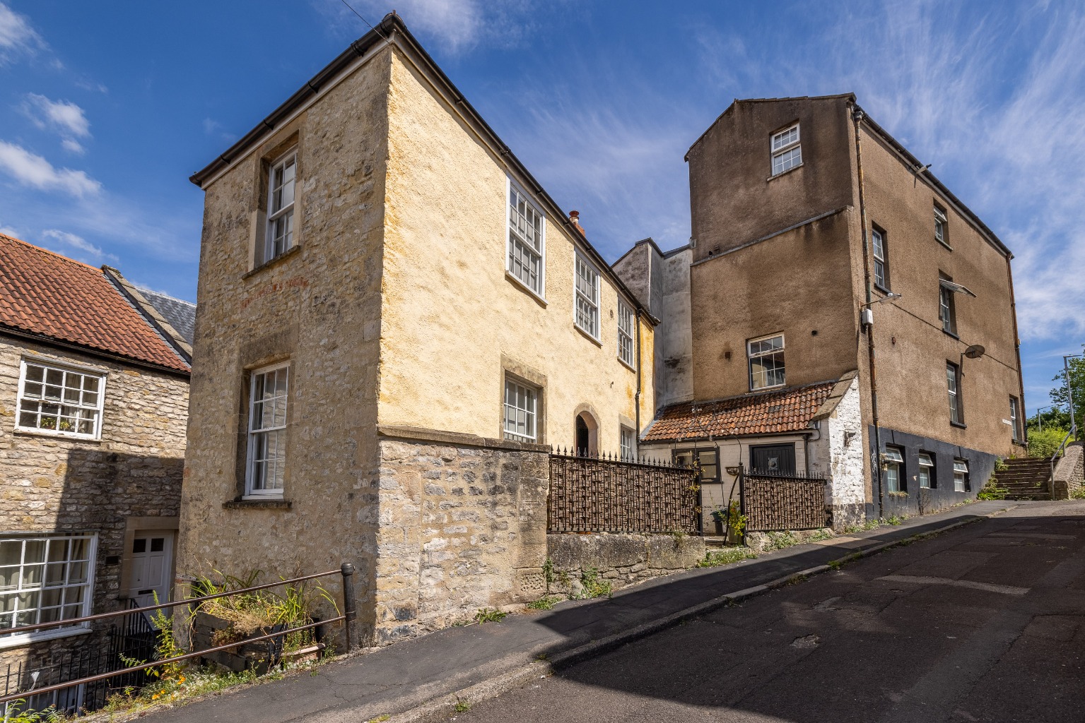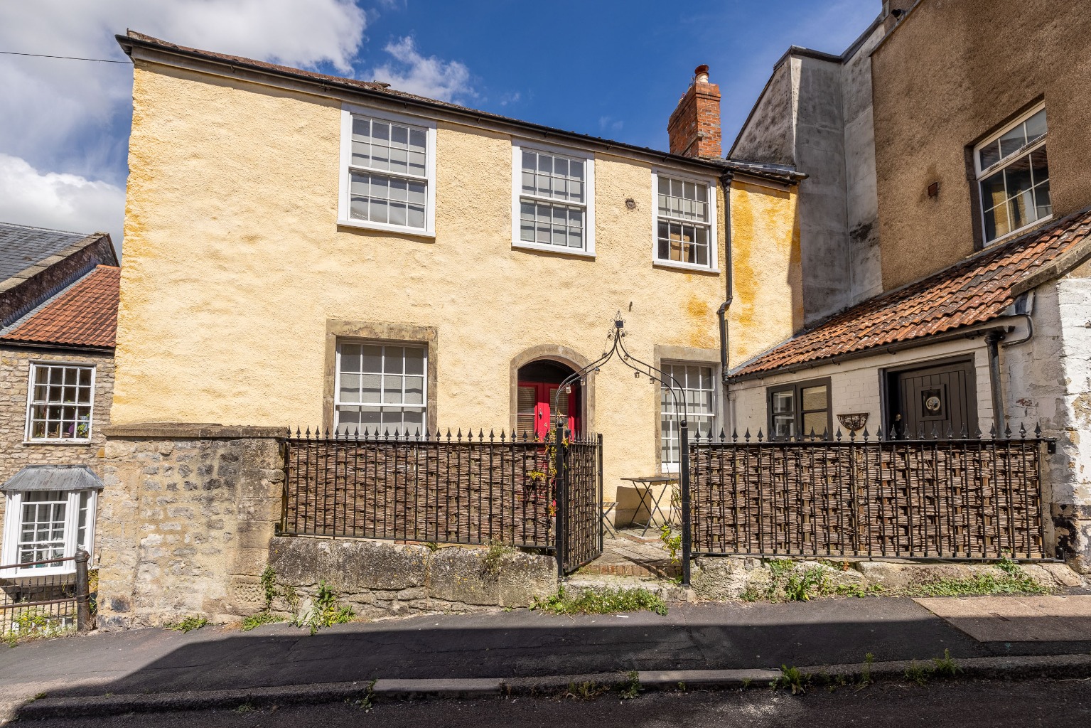 Externally to the front, the home provides a low wall and iron railed enclosed courtyard.