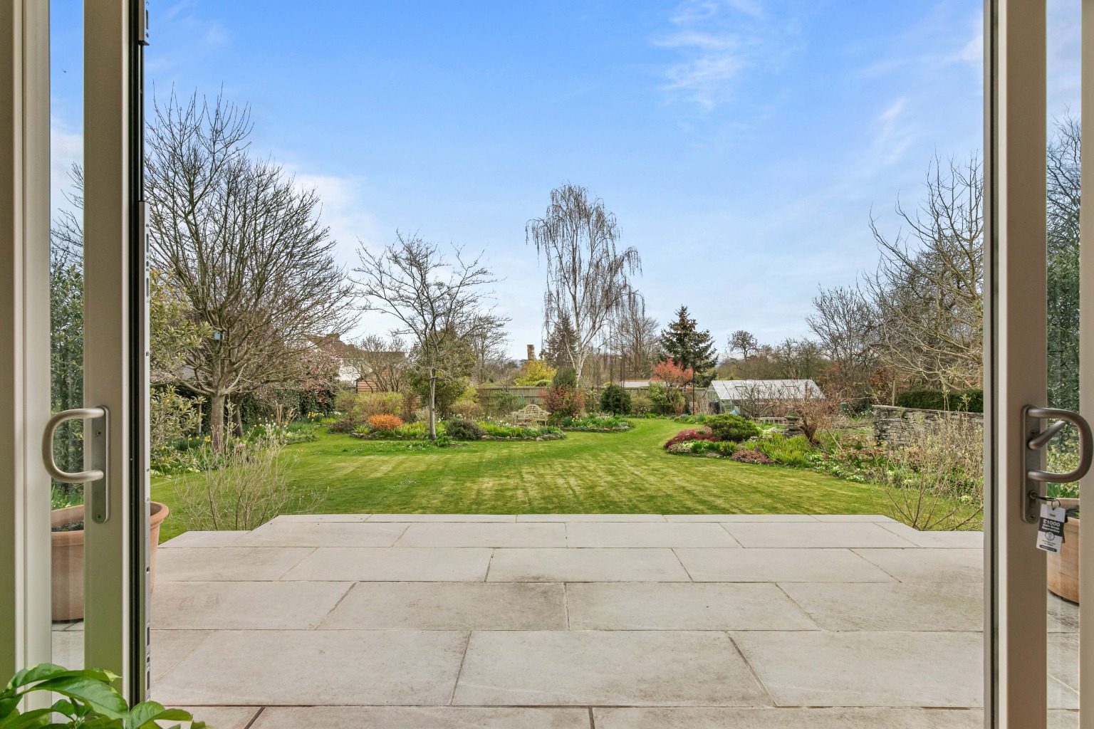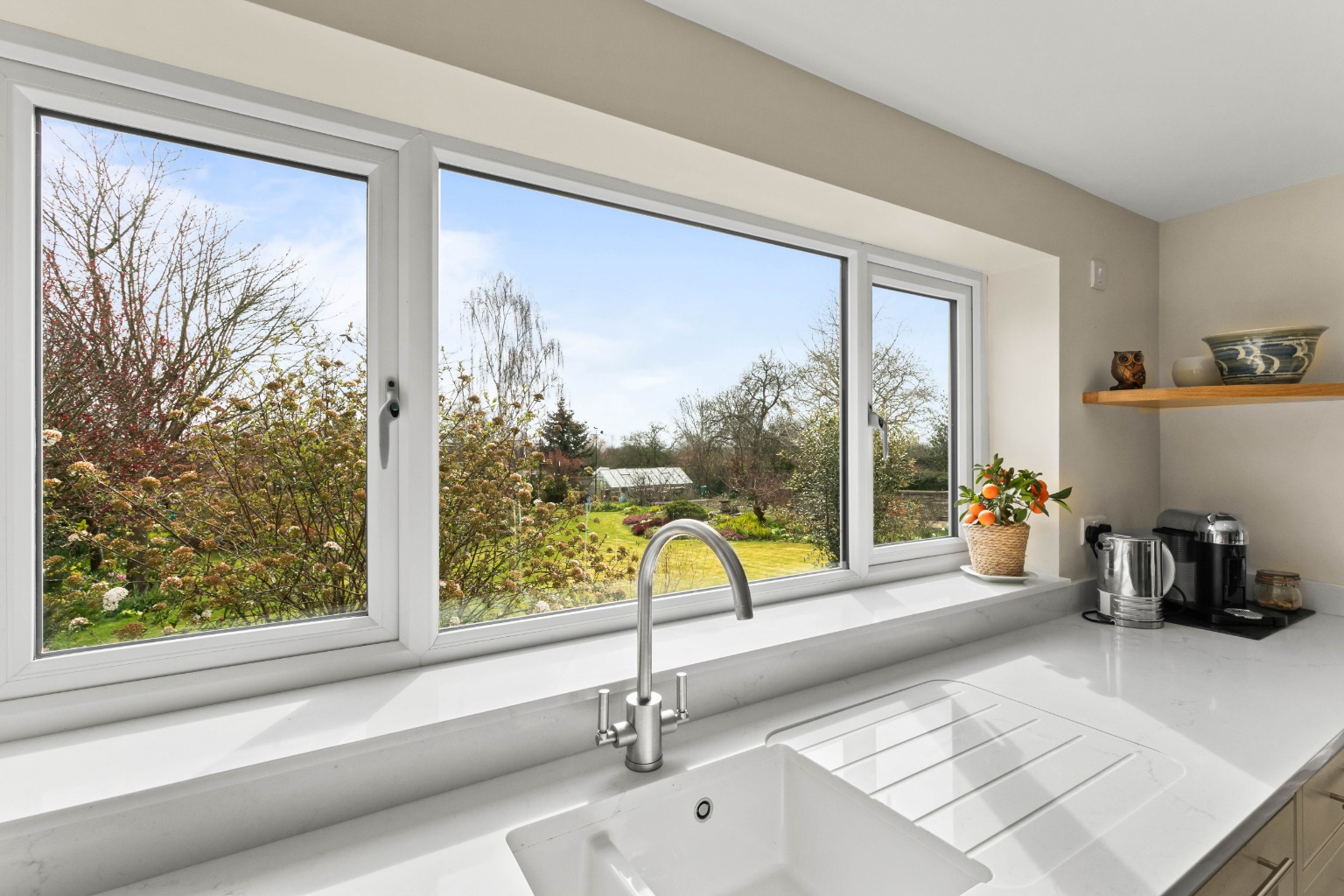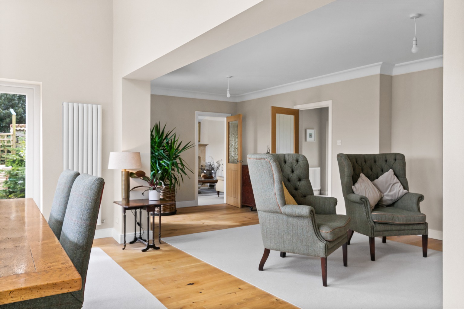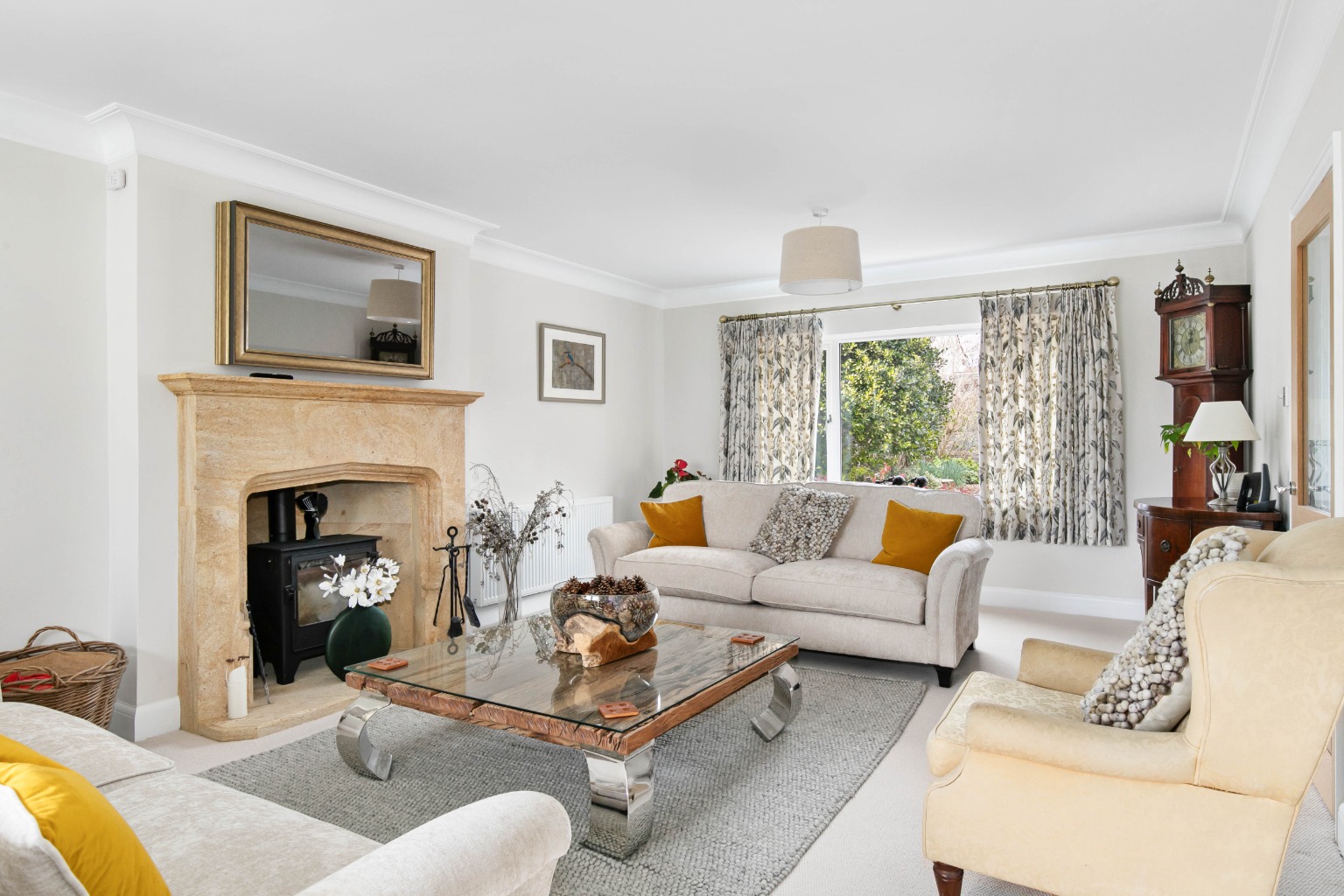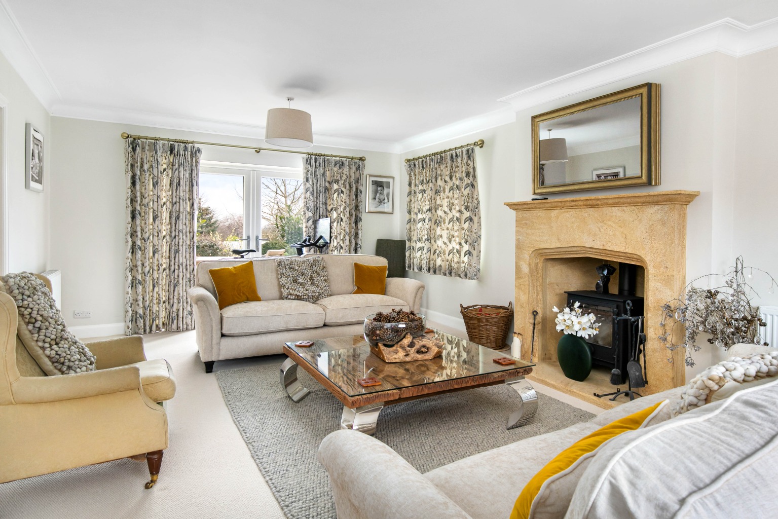 To the right, the sitting room is a spacious, triple-aspect room featuring a handsome Hamstone fireplace housing a log-burning stove, creating a warm and welcoming atmosphere. French doors open to the rear patio, offering lovely views over the garden.