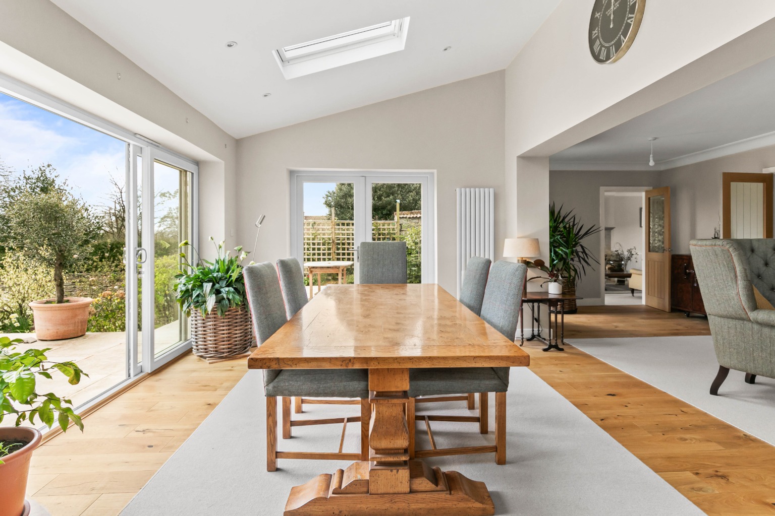 At the rear of the property is an exceptional open-plan family/dining room, which forms the heart of the home. It has been cleverly extended to provide fantastic living and entertaining space, whilst making the most of the sunny rear aspect and view over the delightful rear garden. Sliding doors span the rear wall, providing stunning garden views and access to the patio. Additional French doors and Velux roof lights flood the space with natural light. Wooden flooring enhances the elegant yet practical design of this impressive space.