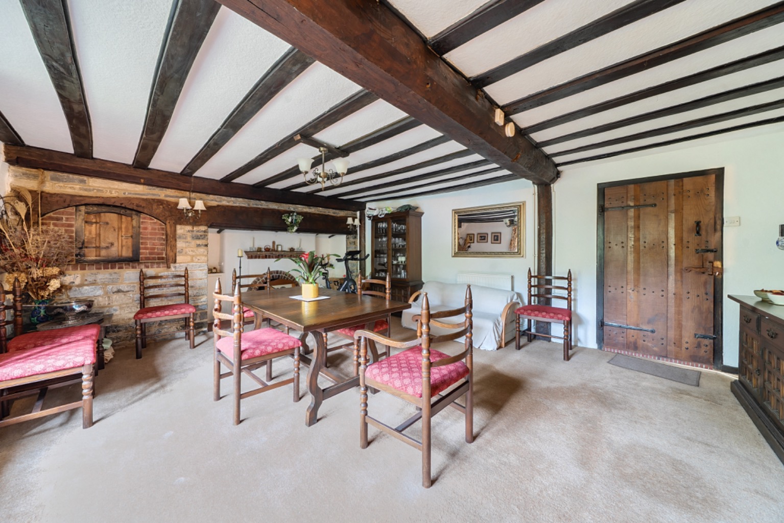 On entering, a central hallway sets the tone for the rest of the home, with exposed beams and original detailing throughout. To the left is a large dining room with an impressive inglenook fireplace, exposed timbers and fitted storage. A window seat enjoys a pleasant outlook to the gardens.
