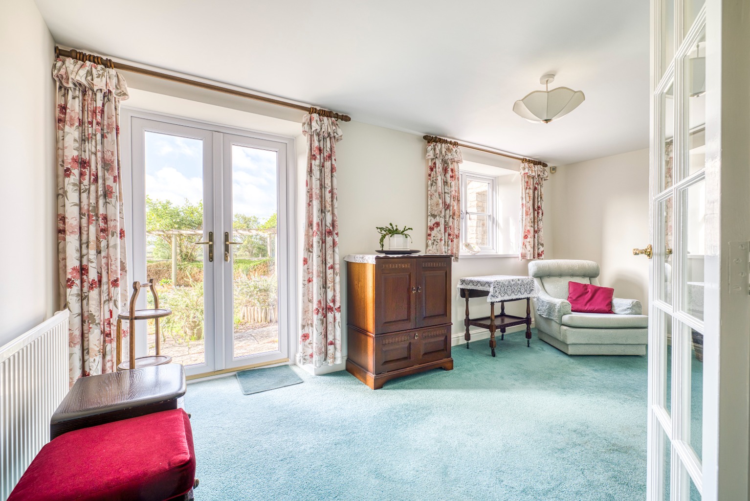 The house has stone elevations under a tiled roof with a front porch, with honeysuckle, sheltering the front door. This leads into a sizeable hall with a staircase, under stairs cupboard and glazed, double doors into the sitting room. This is a bright and cheerful room having a double aspect and south facing double French doors giving views and access to the garden. The room also has a fireplace with an inset Jetmaster fire.