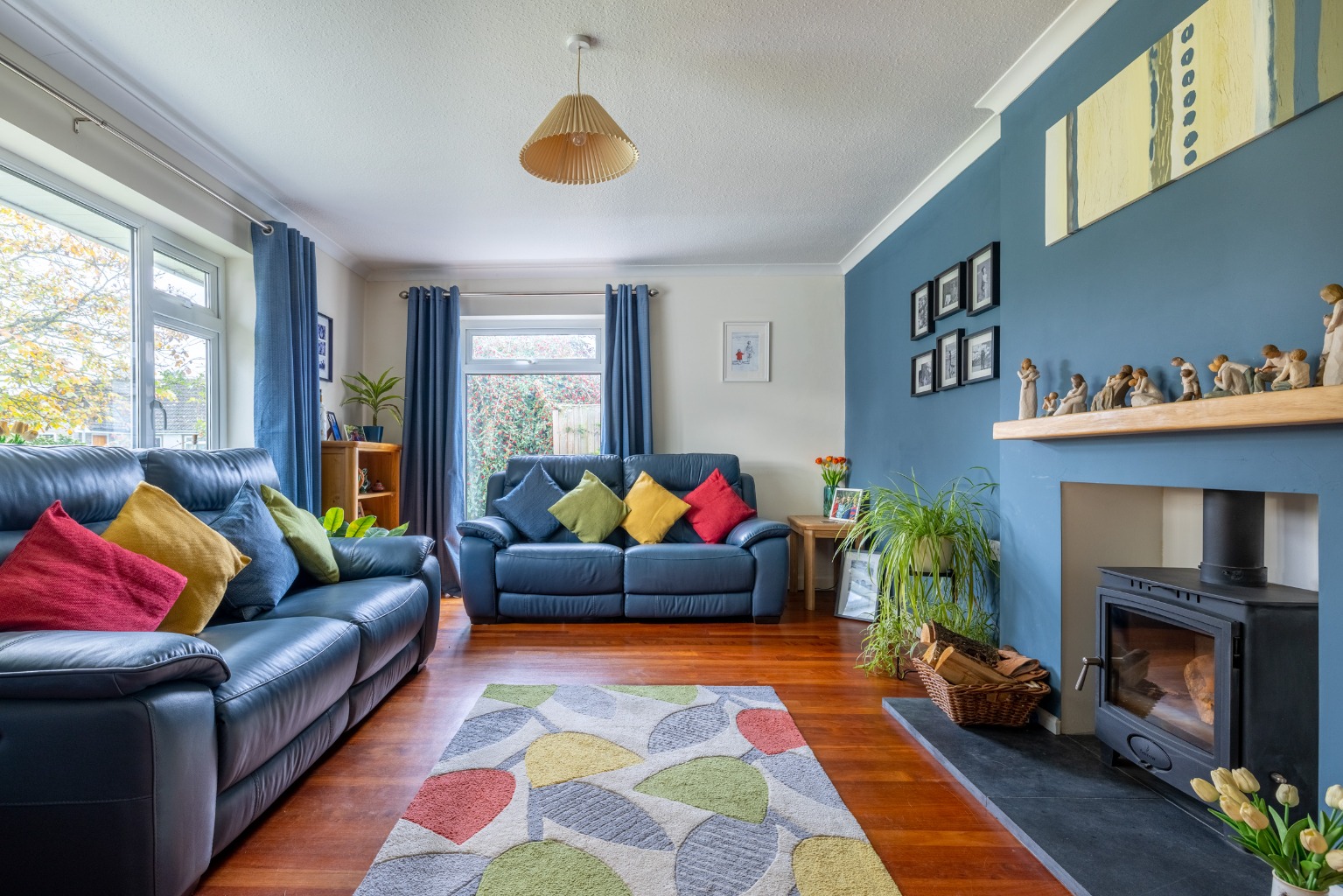 An inner hall then leads through the house, with solid hardwood flooring which continues through the house, including into the sitting room, which is on the left-hand side. This is a light and bright space with a dual aspect and a pretty outlook of the front garden. A wood-burning stove in the heart of the room makes this a simply perfect room in which to cosy up during the colder months.
