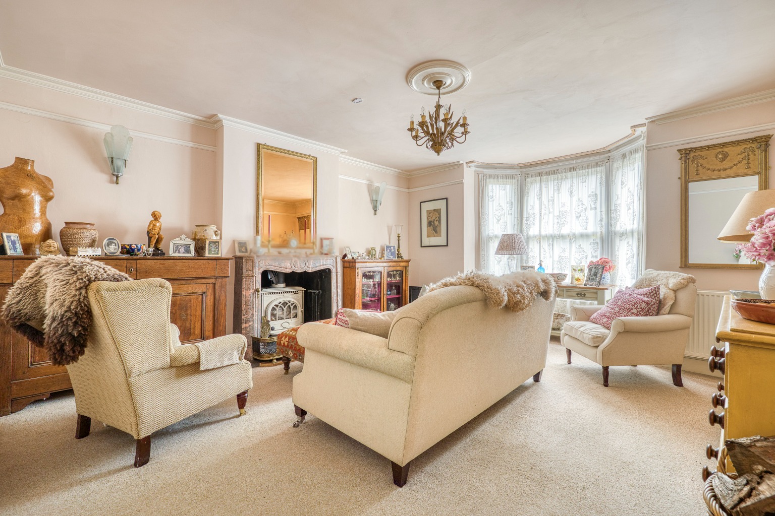 A welcoming entrance hall with stained-glass door leads into the heart of the house, where an entrance hall with encaustic clay floor tiles opens to two spacious front-facing reception rooms which each enjoy original fireplaces, picture rails, decorative coving and ceiling roses. The sitting room benefits from a bay window looking out to the front, and the drawing room has French doors leading out to a sunny terrace.