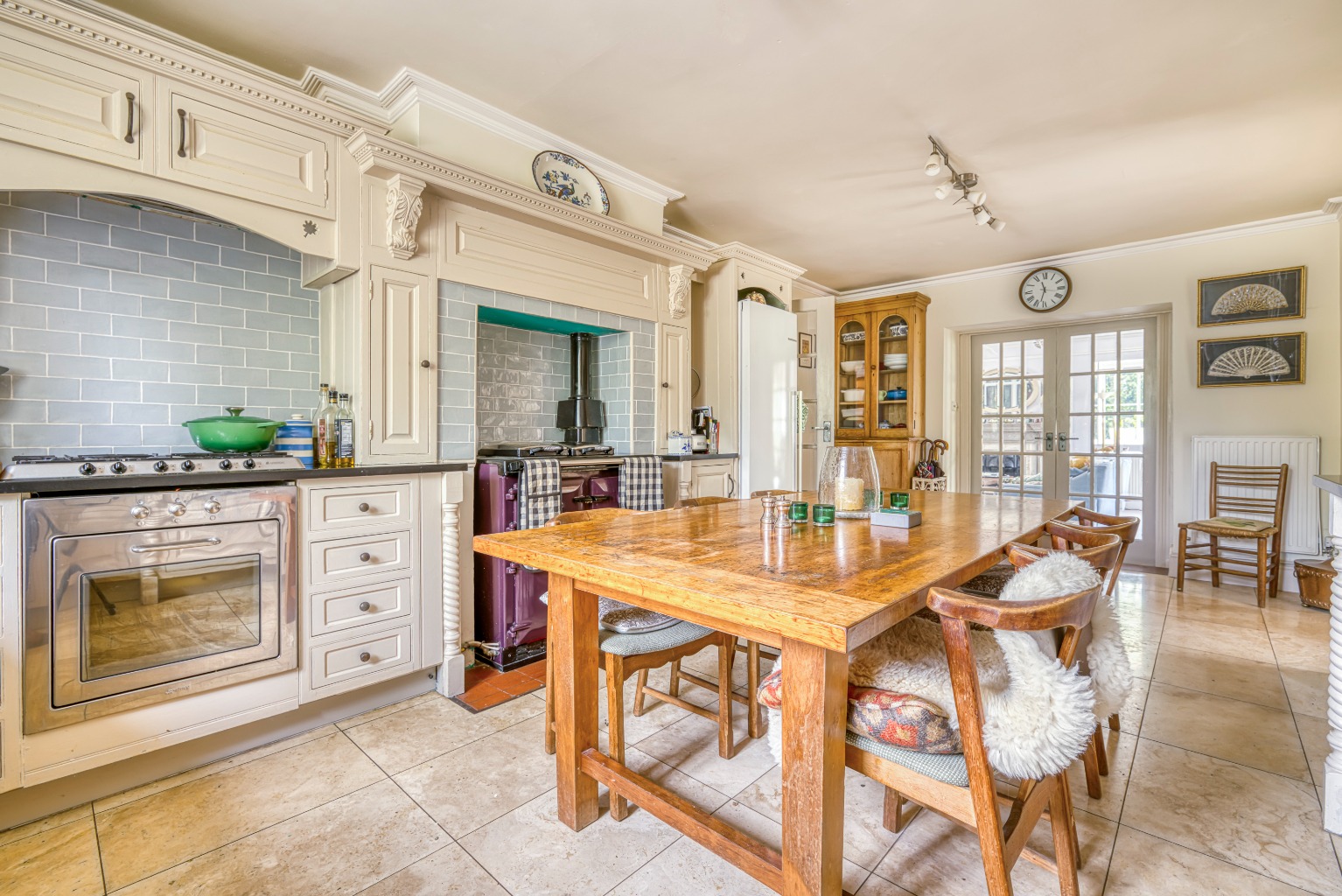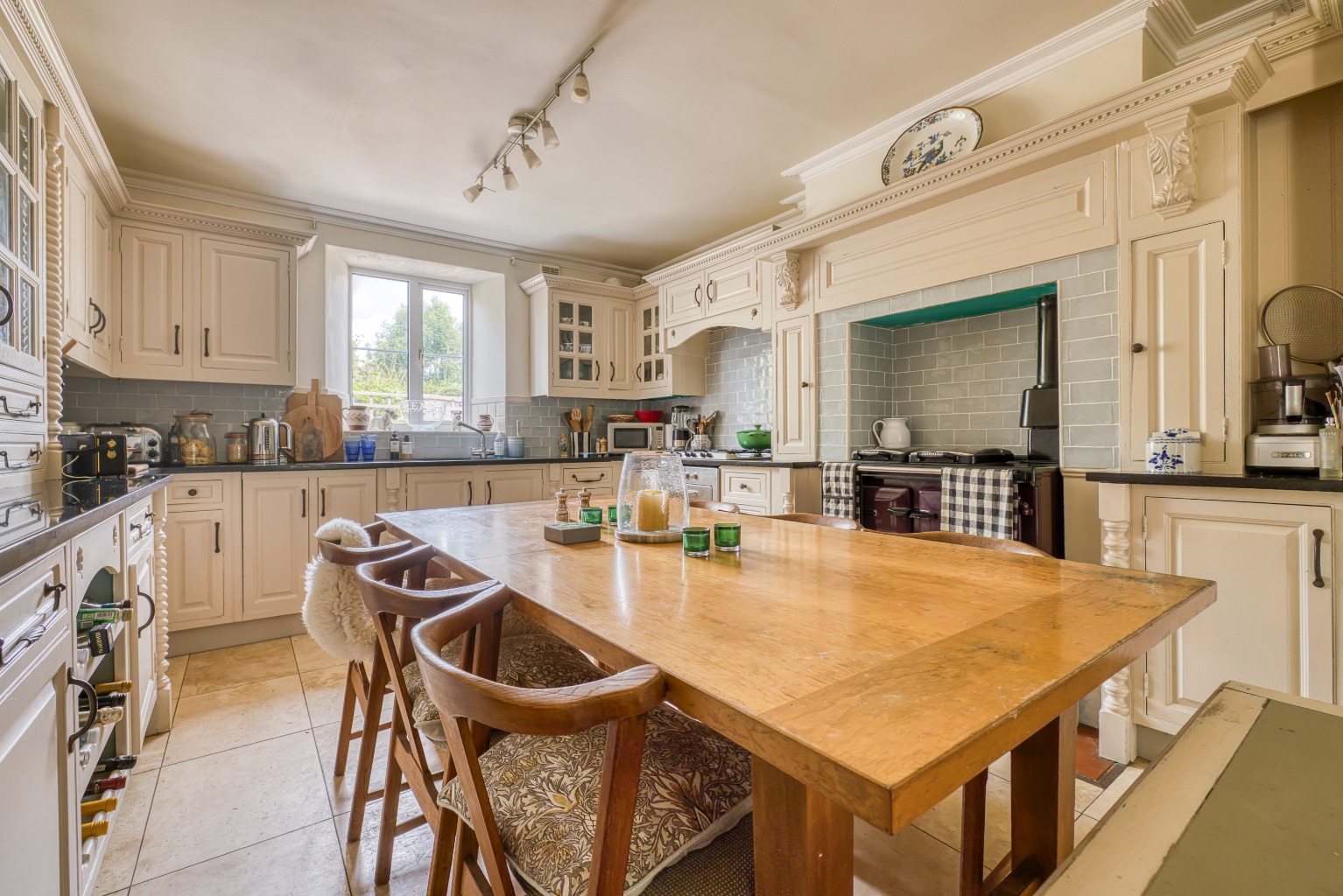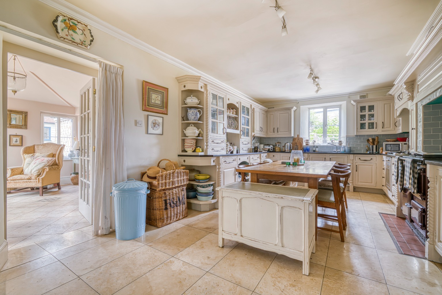 To the rear is a large kitchen with ample room for a family dining table, featuring a Rayburn and a range of bespoke fitted units. Beyond lies a further pair of adjoining rooms, currently used as a garden room and formal dining room, complete with wood burner—ideal for relaxed evenings or entertaining. A utility and cloakroom are also situated on the ground floor.