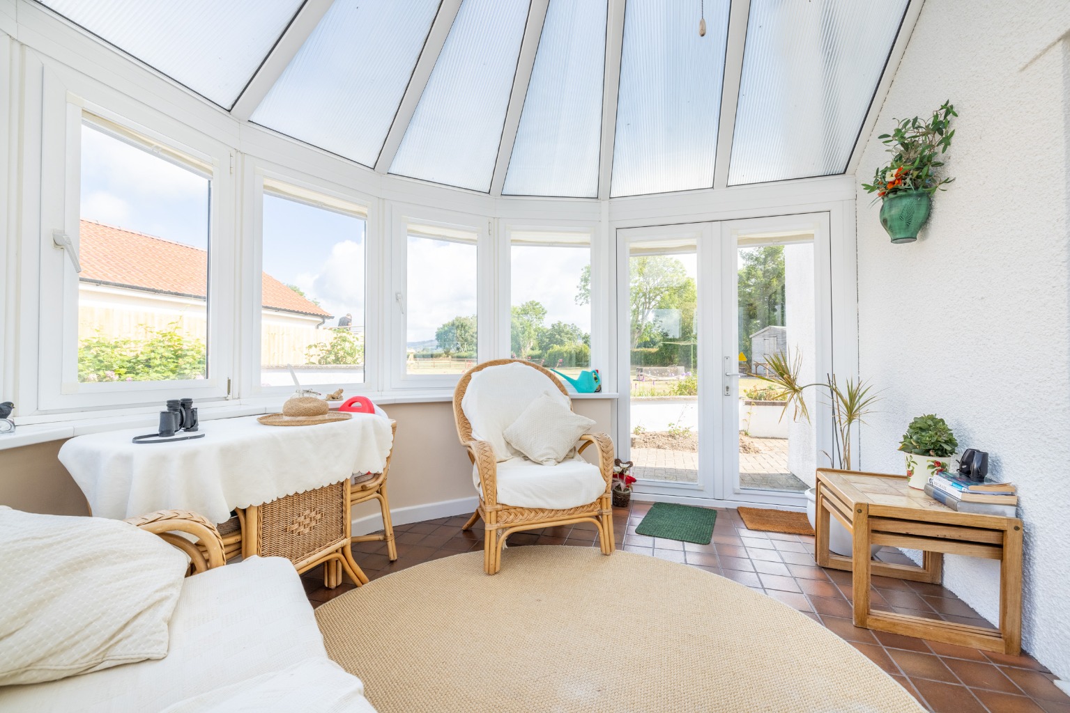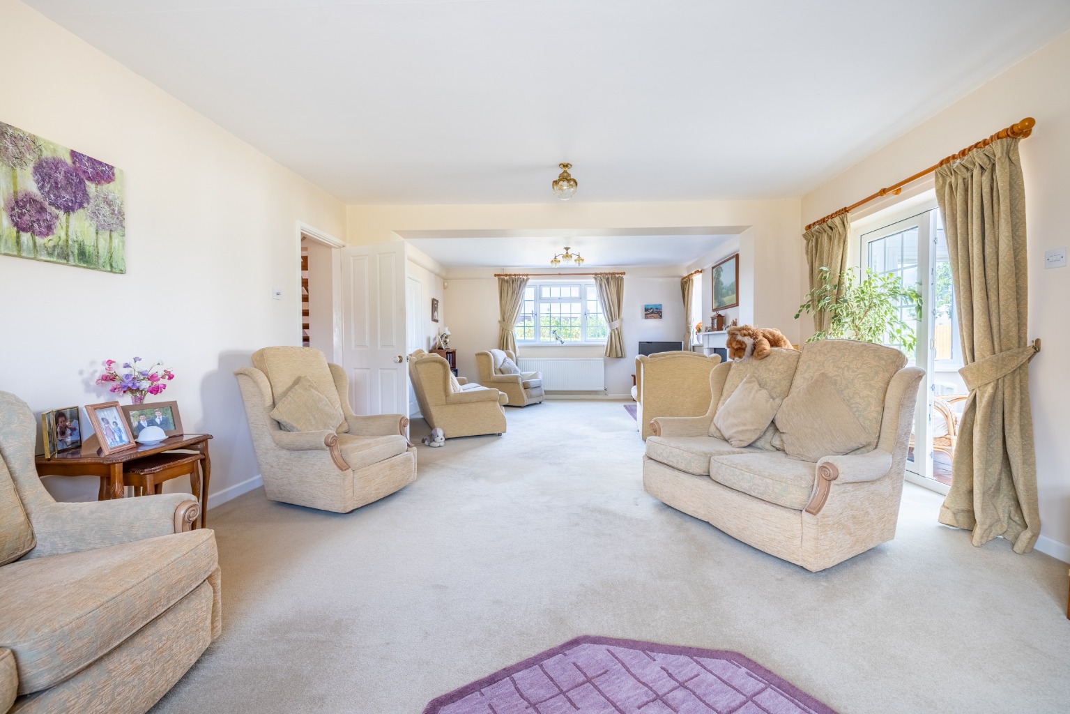 The front door opens into a central hall. To the left the sitting room has a triple aspect, a marble fireplace with a wood burner and French doors to the conservatory. This is a very pleasant room with a tiled floor and French doors to a garden terrace.